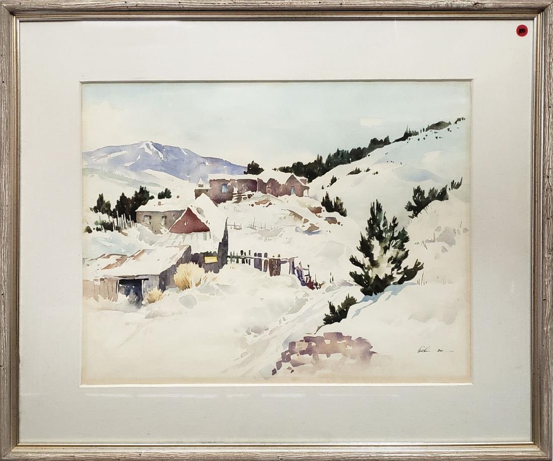Original watercolor by Prairie Print Maker Arthur Hall (1889-1981) measures 19.5" x 28.5" and is framed. The watercolor is signed in the lower right and is good condition. Hall was born in Texas but received his art training at the Chicago Art Institute where he met his future wife, Norma Bassett. His education was cut short by World War I. After his service he moved to El Dorado, Kansas, working as a court reporter. He and Norma went abroad and ended up living in France for two years. After returning to El Dorado they joined the Prairie Print Makers in 1930 as Charter Members. Hall was a master of etching and dry point but was also extremely gifted in drawing and watercolors. In 1950 Arthur and Norma purchased Rancho del Rio, an adobe estate in New Mexico. During the summer it was a vacation art school, providing them the means to pursue their own art the rest of the year.