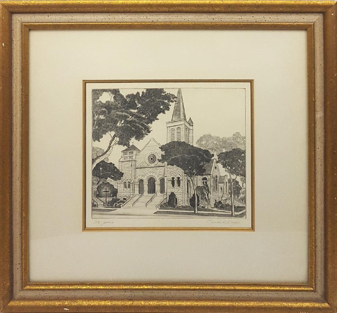 Returning to Jacksonville, he married Anna Palmer and the couple moved to Wichita to work for Western Lithograph. Shortly after, he returned to Illinois, taking an advertising job in Springfield. Then they moved to San Francisco, where he worked as a free-lance advertising artist until 1925, when he returned to Wichita and a promotion at Western Lithograph. Soon he began experimenting with woodcuts, creating a series of award-winning bookplates, and from 1931, did etchings. The quality of his prints earned him membership in professional printmakers’ organizations including the Chicago Society of Etchers, where the committee upon seeing his work, burst into applause. Also friendship and classes with Doel Reed, professor of art at Oklahoma State University, and master of aquatints, had a profound effect on Capps’ career, which was memorialized just before his death with a joint retrospective with Clarence Hotvedt and Lloyd Foltz sponsored by the Wichita Art Association.