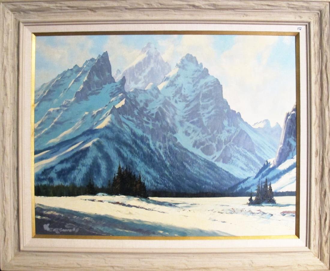This original oil on canvas painting by artist Roy Kerswill features the snow covered Grand Teton mountians in Wyoming. This is a large piece, measuring 30" x 40" and is in good condition with a light colored wood frame.