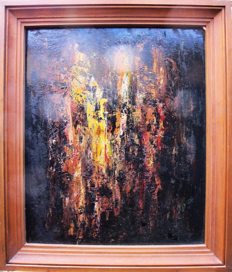 This original acrylic abstract by Aurthur Fielder features bold yellow, orange, and red tones against a black backgound. Medium to large in size measuring 28" x 22.75". This piece is in good condition but needs a good cleaning and a new frame.
