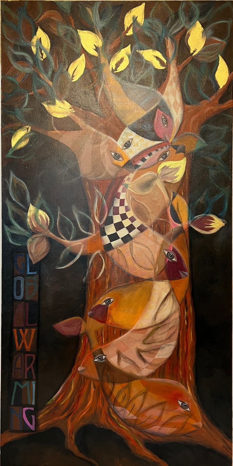Groeblacher, Michaela, "Global Warming" acrylic on canvas, signed in lower left, good condition, canvas size: 48 x 24 inches.Growing up in Austria, nature was my place. Eventually I became aphysical therapist. For ten years I loved my patients and they loved me back.My family?s move to the USA allowed (forced) me to become a full-timemother. We settled in McPherson, Kansas. My PT education got lost in themove, while my love for art and gardening led me to a degree in landscapedesign. By that time we had moved to Seattle, Washington. Life and work as alandscape designer in the Pacific Northwest felt like heaven on earth ? untilwe moved again ? back to McPherson.In 2005, by then 45 years old, I fulfilled my lifelong dream andgraduated from McPherson College with a bachelor?s degree in studio arts, concentrating in ceramics and painting. Now, in my third life, I combine myexperience and my interest in the human psyche with both of my artistic lovesby sculpting the human figure from clay and subsequently finishing thesculptures in a painterly manner. After receiving my MFA from Fort HaysState University, I now teach art at McPherson College.My work has been shown in numerous galleries and museumsthroughout the United States in group, solo and juried shows and has receivedmany awards. It is also part of multiple museums, private and corporatecollections throughout the USA, Austria, and Germany.