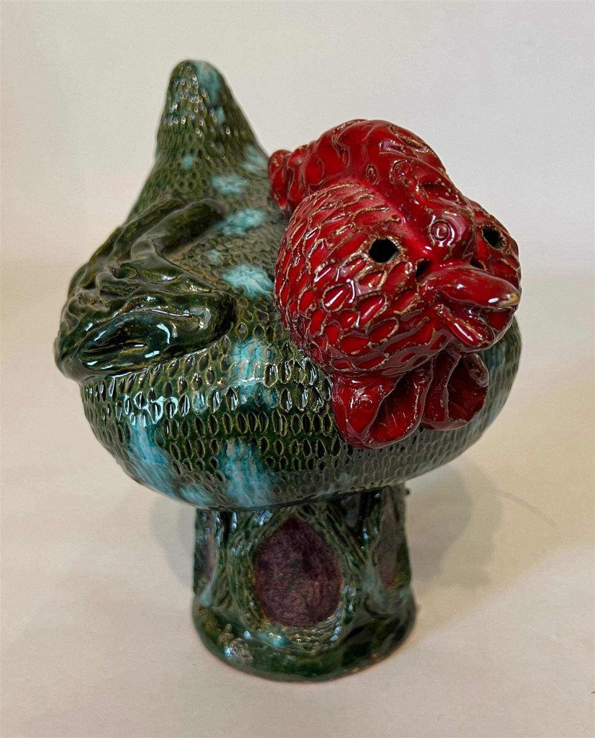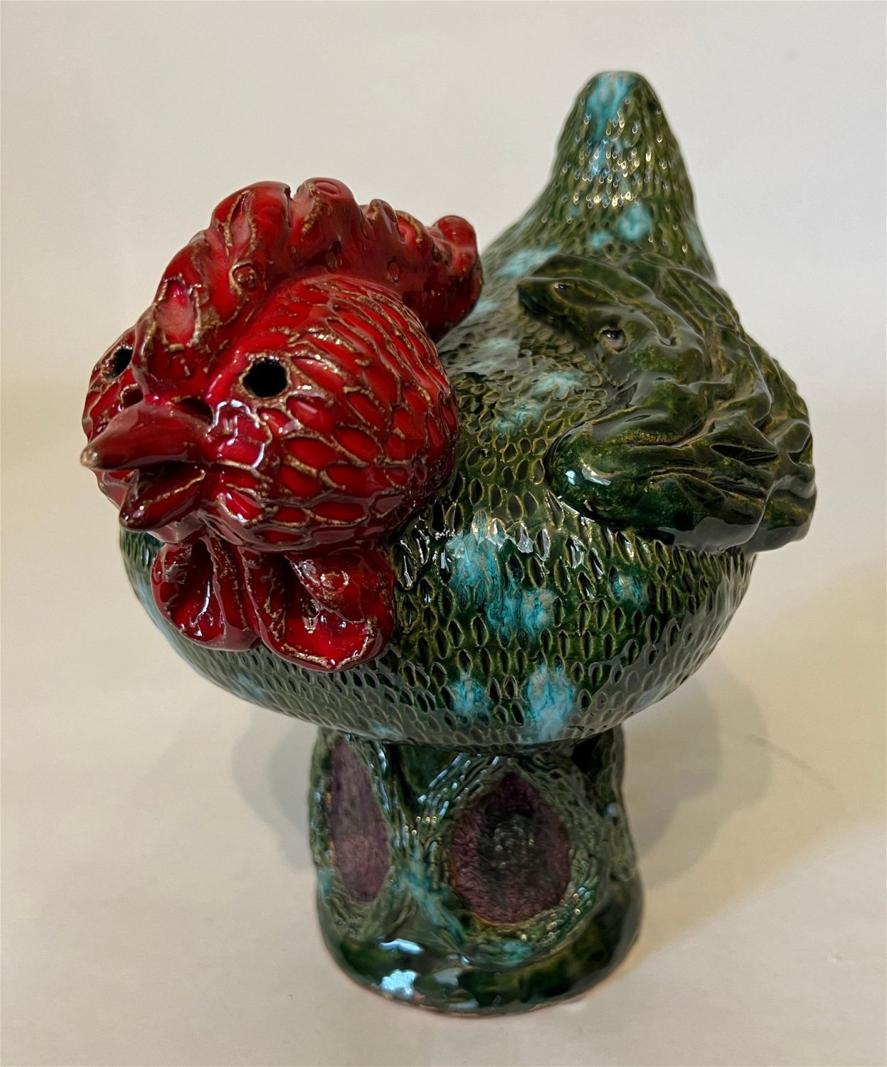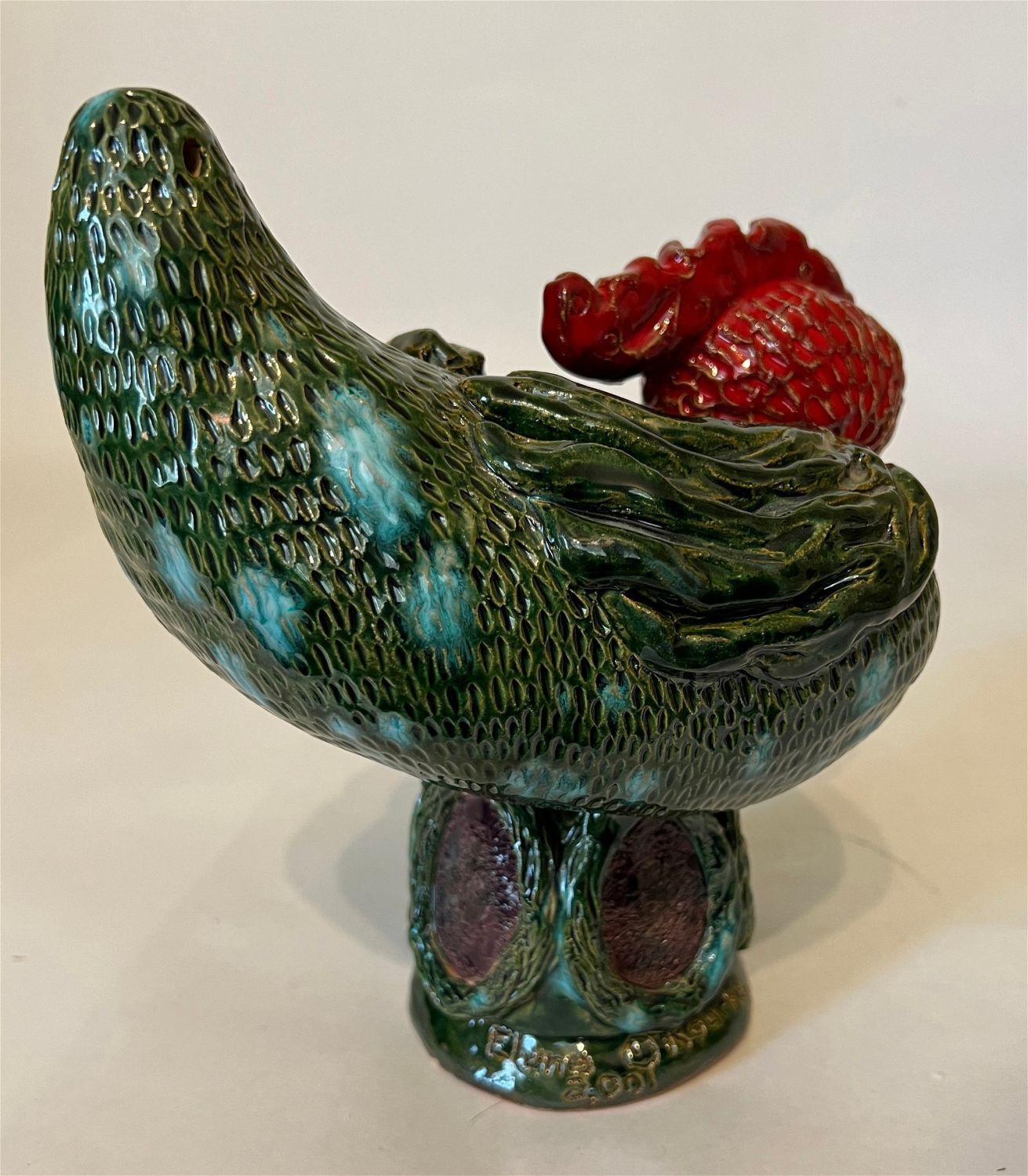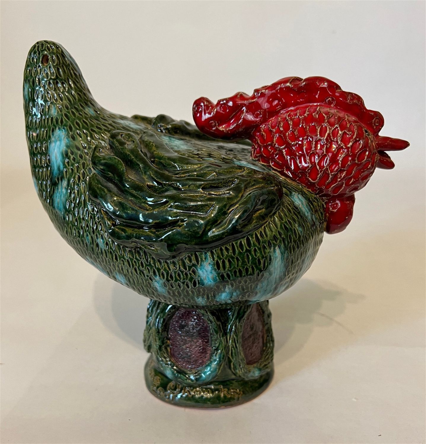 O’Rourke, Elane (1931-2005) untitled glazed chicken, 2001 ceramic, signed in base, good condition, size: 9 x 9 x 7 inches. Lindsborg, KS artist, Elane enjoyed ceramics and was part of a group of people who worked with Max Ebaugh, McPherson, KS. She was an arts supporter and collector.