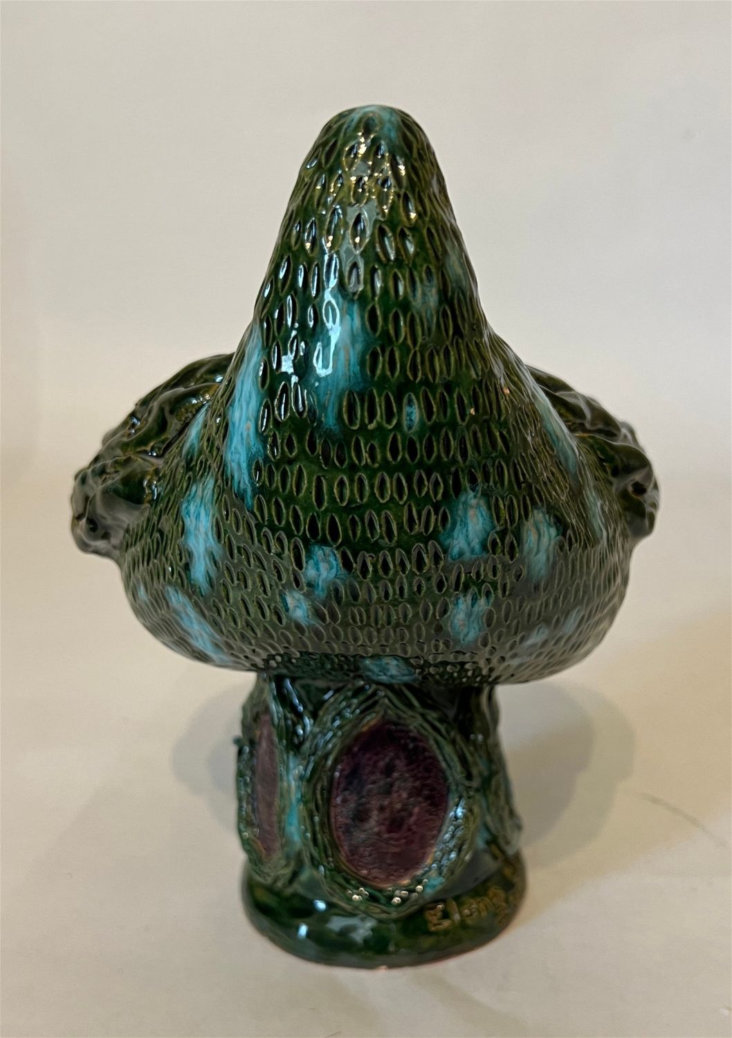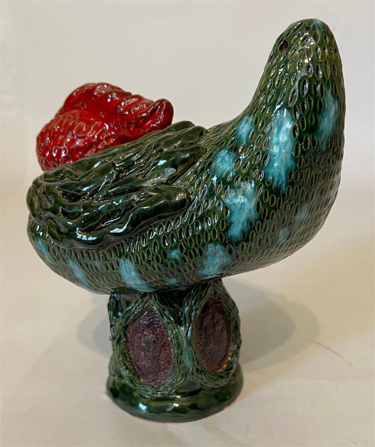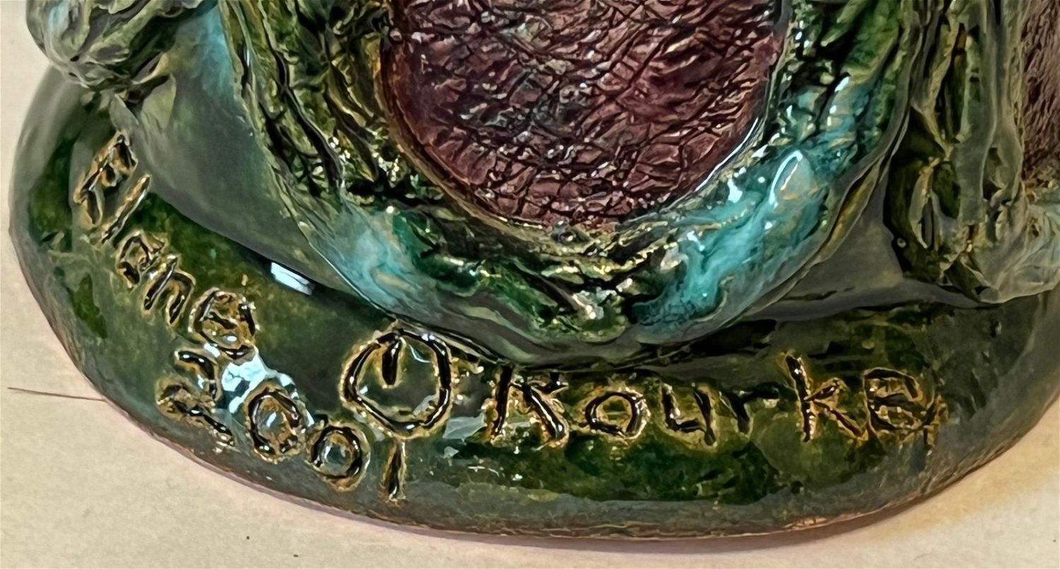 O’Rourke, Elane (1931-2005) untitled glazed chicken, 2001 ceramic, signed in base, good condition, size: 9 x 9 x 7 inches. Lindsborg, KS artist, Elane enjoyed ceramics and was part of a group of people who worked with Max Ebaugh, McPherson, KS. She was an arts supporter and collector.