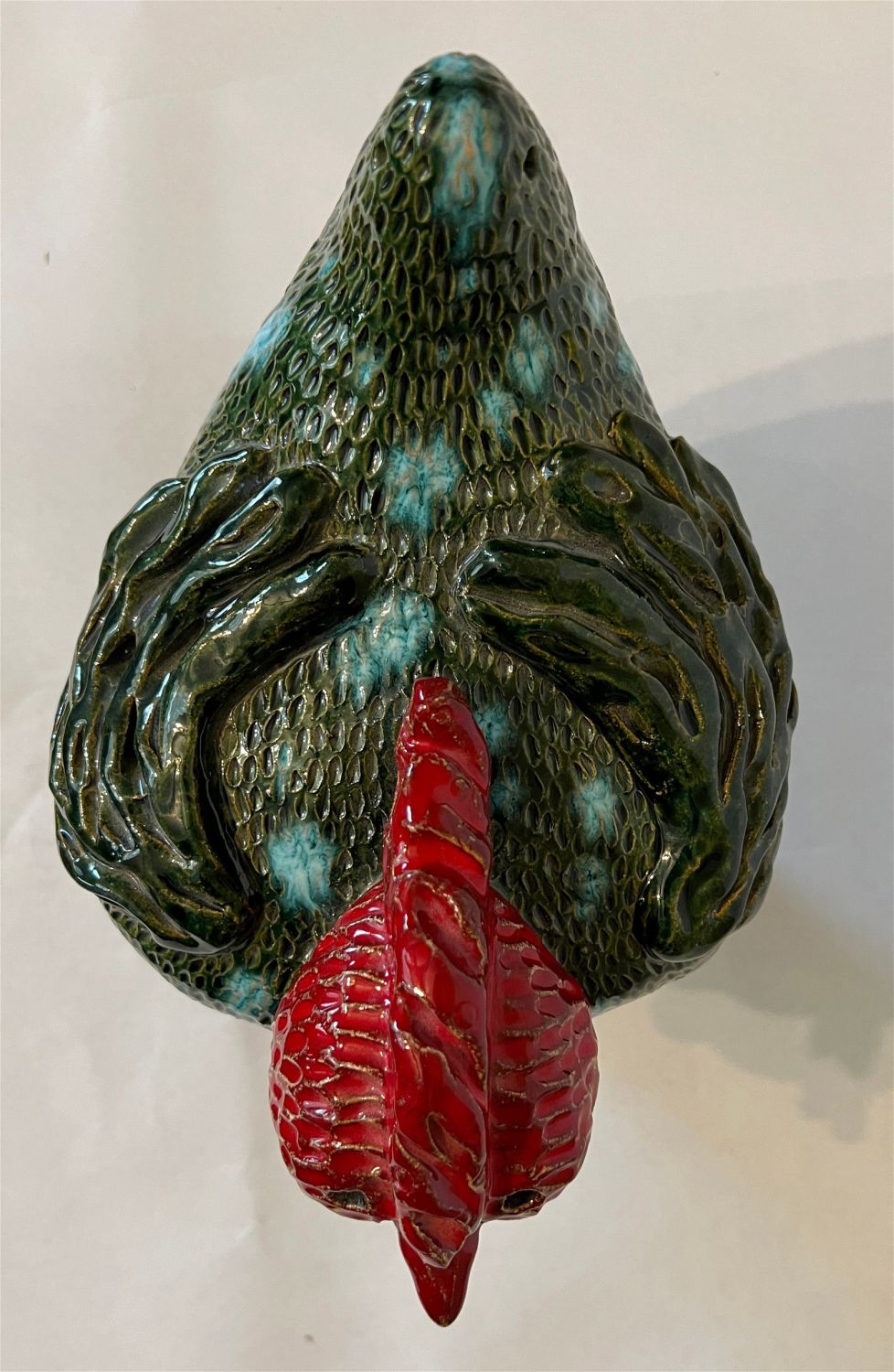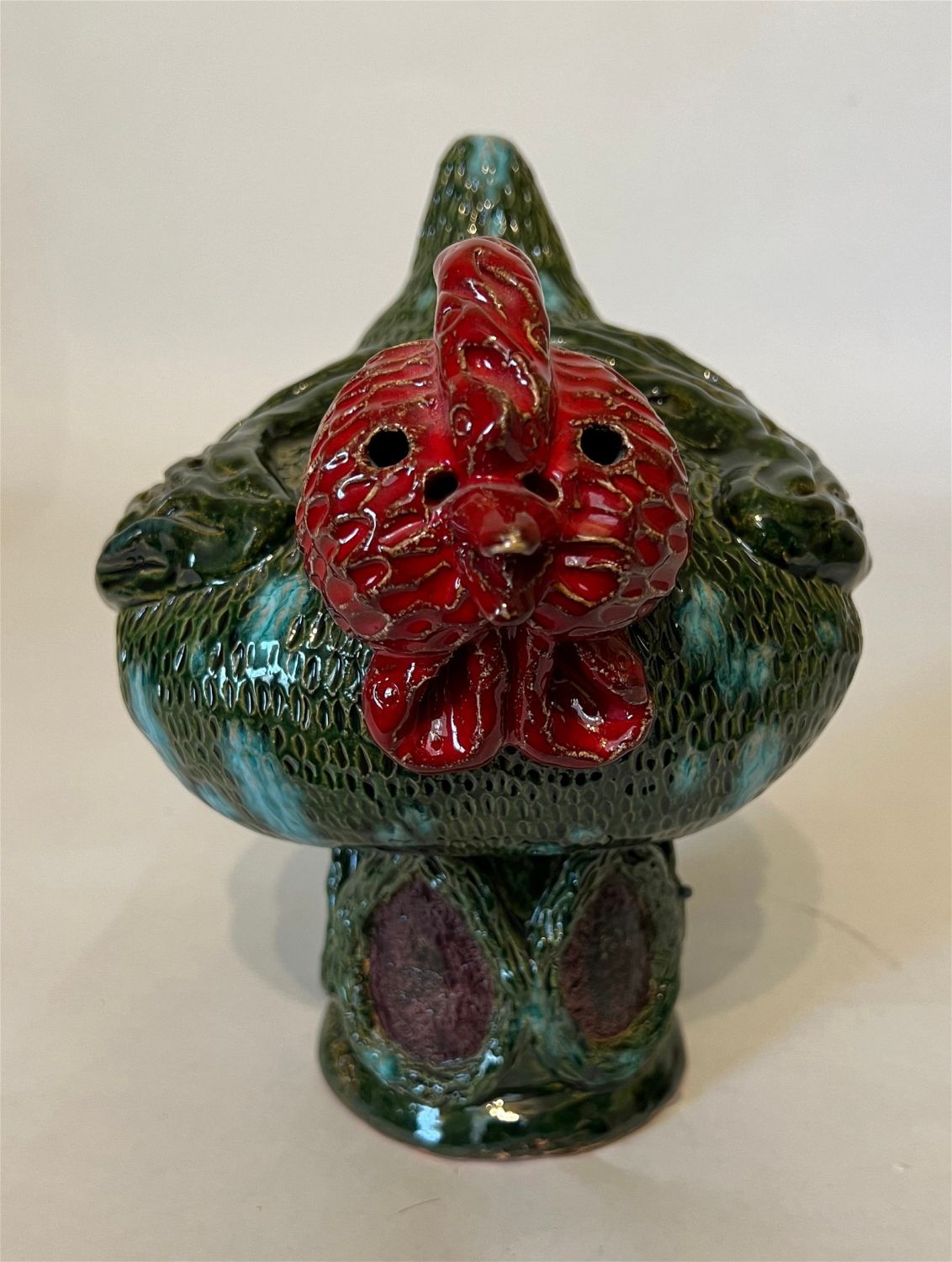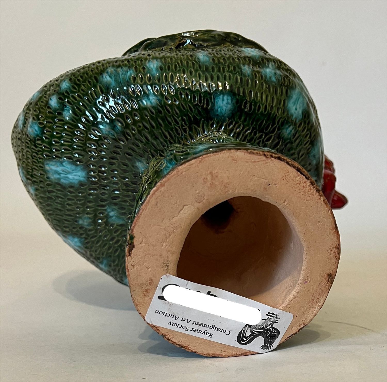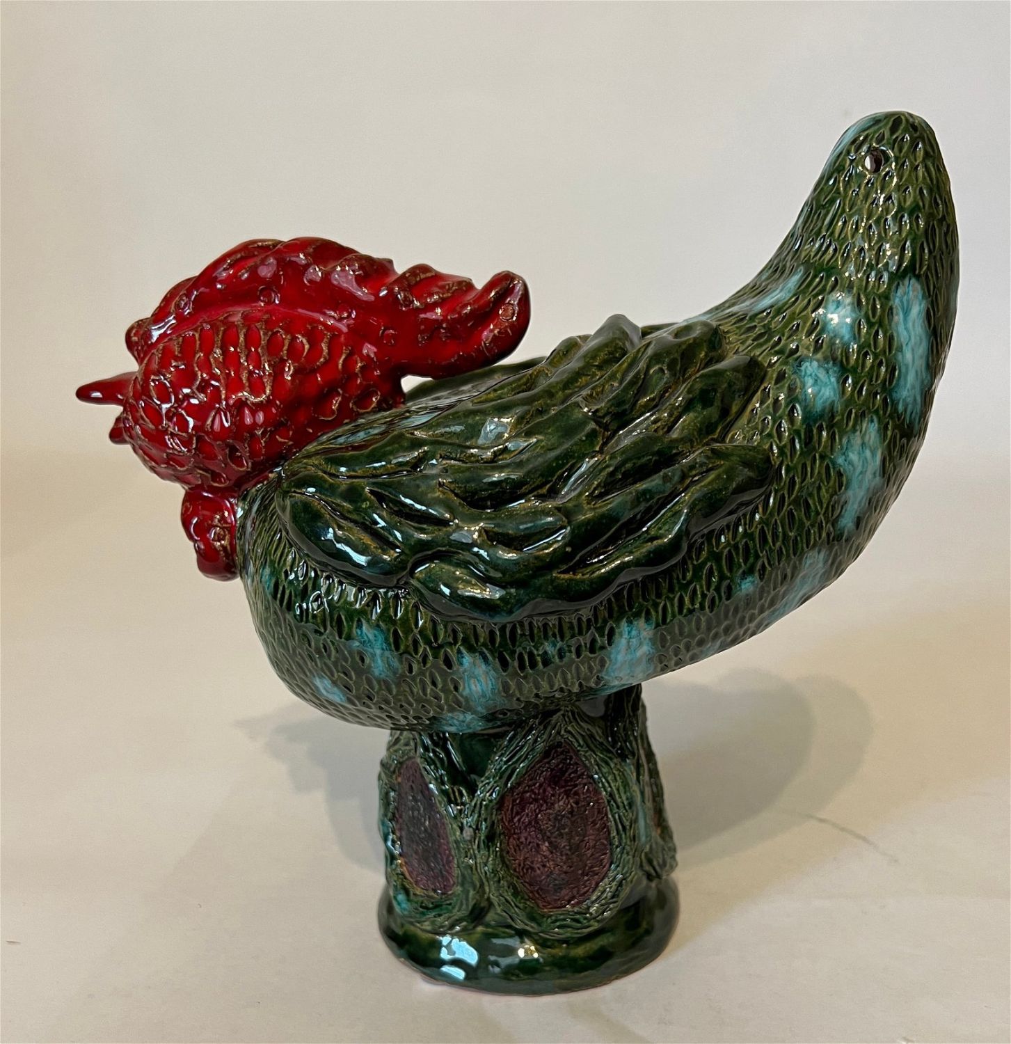 O’Rourke, Elane (1931-2005) untitled glazed chicken, 2001 ceramic, signed in base, good condition, size: 9 x 9 x 7 inches. Lindsborg, KS artist, Elane enjoyed ceramics and was part of a group of people who worked with Max Ebaugh, McPherson, KS. She was an arts supporter and collector.