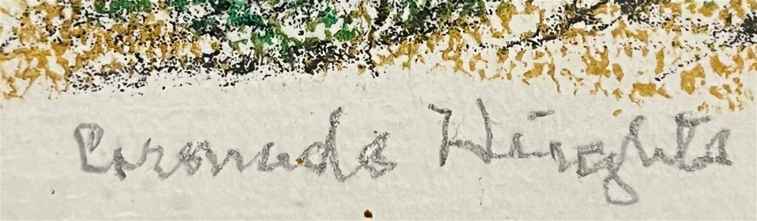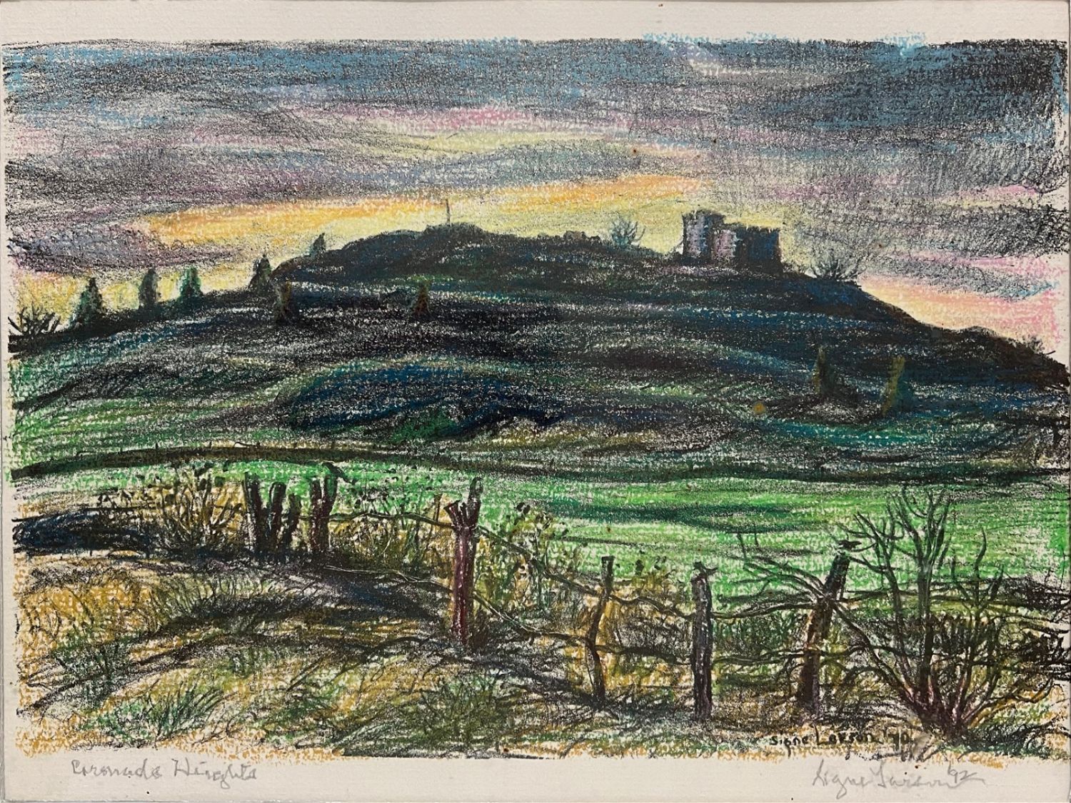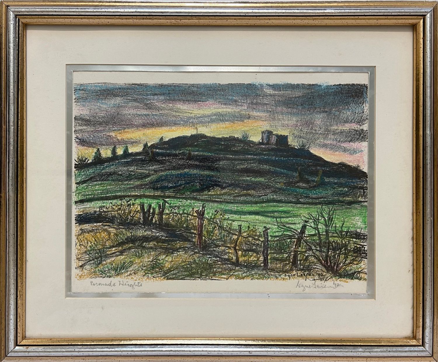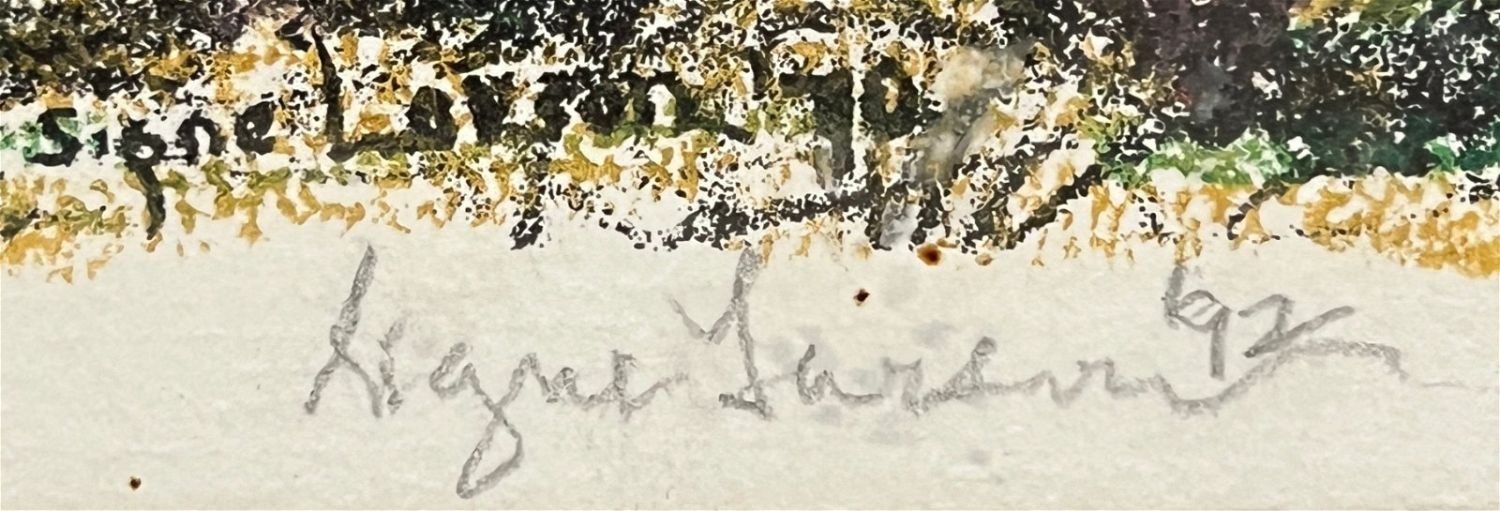 Larson, Signe (1908-1993) "Coronado Heights" handcolored lithograph, penciil signed lower right, good condition, right side of image is under the mat, image size: 8 x 12 inches. Signe Larson (1908-1993) was born in Buxton, Iowa. She was the youngest of four children and despite lifelong deafness, she was a successful artist. Her family moved to Lindsborg, Kansas in 1927 so that she could attend Bethany College. She studied under Birger Sandzen (1871- 1954) until 1933, when she graduated. She also later studied at the University of Colorado at Boulder, University of Washington and the Chicago Art Institute.With her sister Elvira, she traveled across the United States, Canada and Europe presenting chalk lectures, called Chalk Talks, in churches. Her paintings and prints were awarded prizes in regional and national exhibitions. Her favorite painting medium was watercolor. Several of her watercolors were reproduced in Ford Times Magazine.A mural by Larson hangs in St. Paul Lutheran Church in Clay Center, Kansas. In Lindsborg, her Village Spire Studio and the home of her and her sister were the centers of her life. Watercolors and prints by Signe have found their way into homes across America.In 1984, having moved to a care home in Cordova, Nebraska, she was named "Alumni Artist of the Year" by Bethany College. She was the featured artist for Hyllningsfest in 1993. Her painting of four women at a Swedish smorgasbord served as the program cover for the festival.
