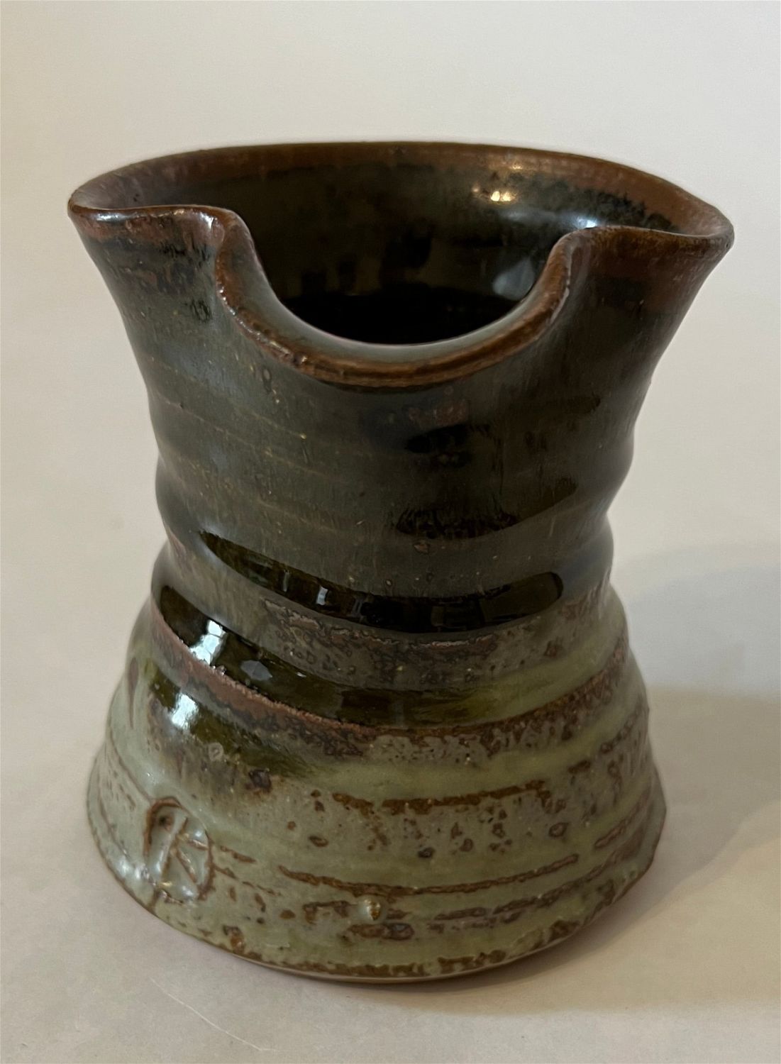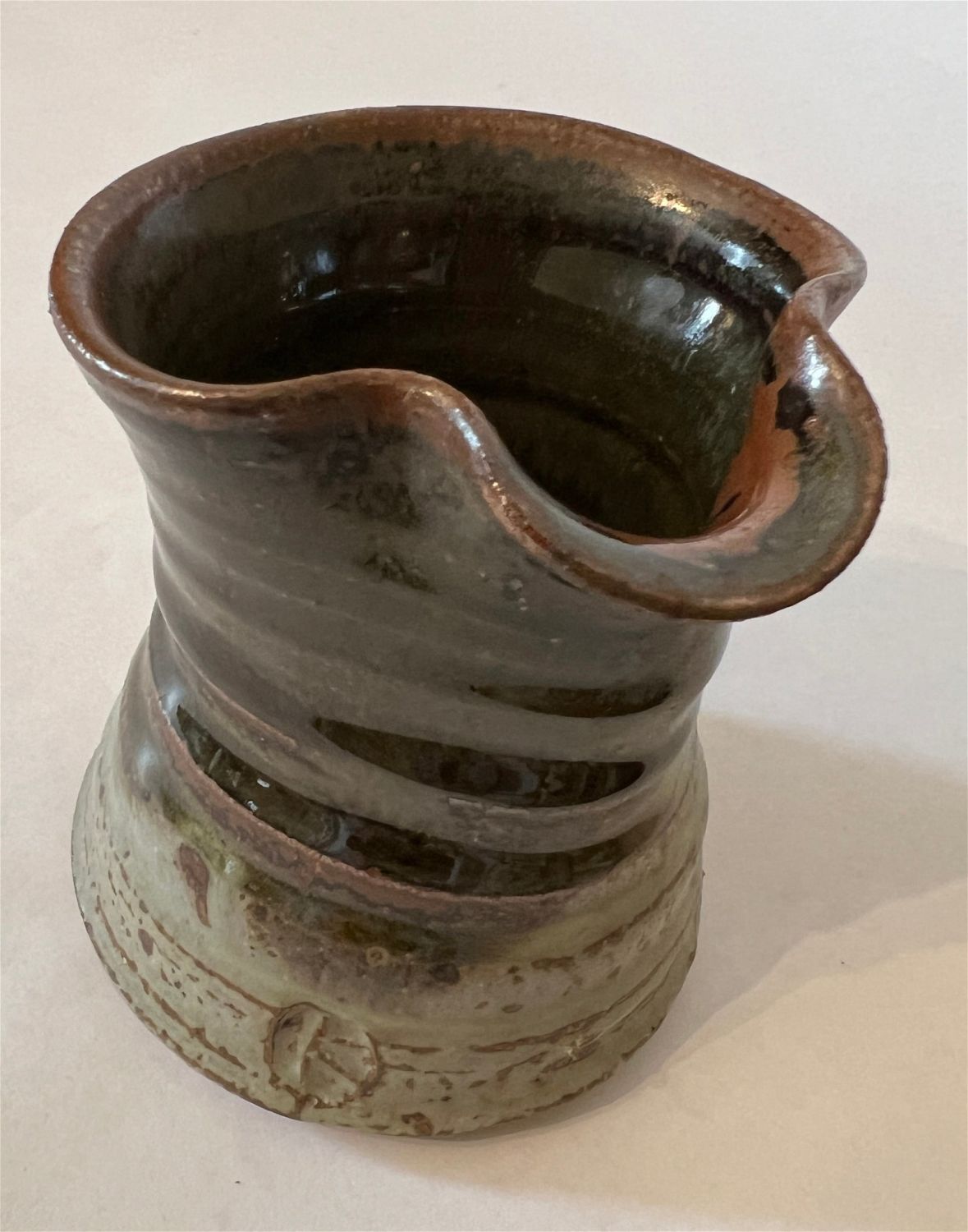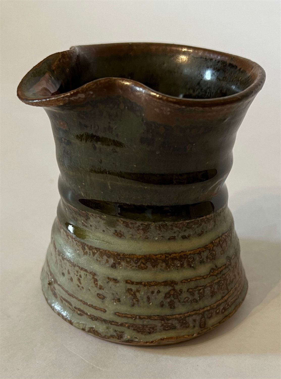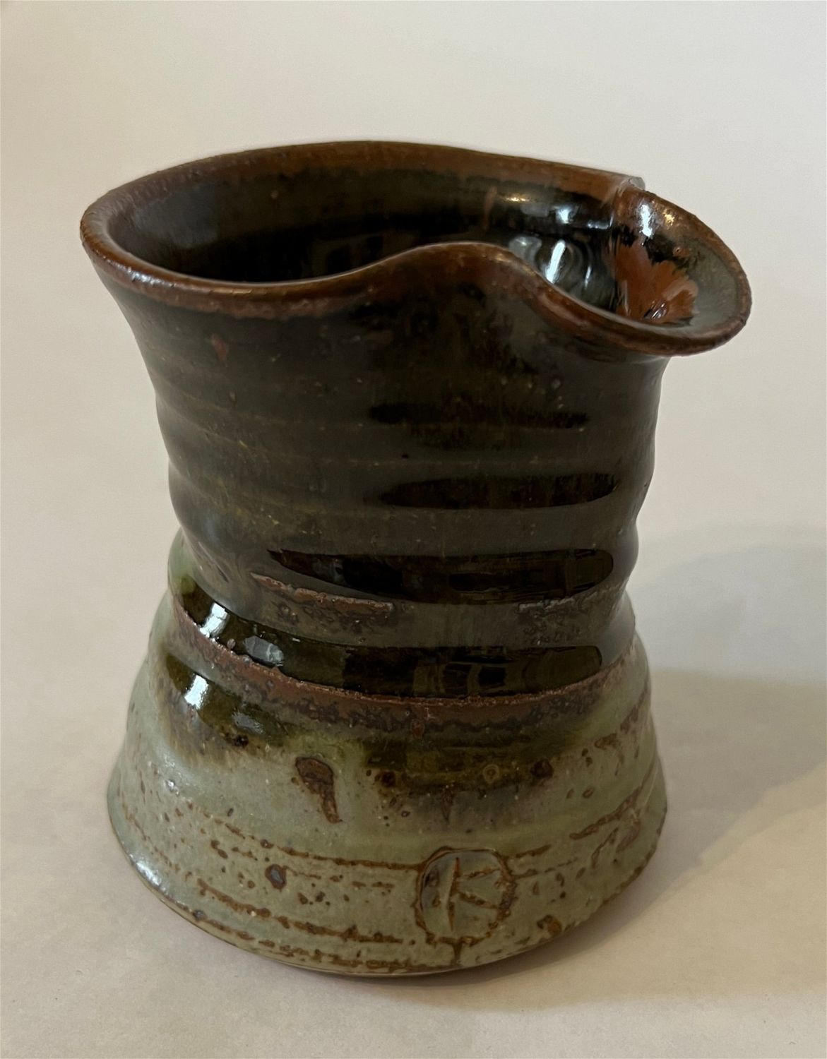 Kahmeyer, Ray (1930-2007) cream pitcher, stoneware, Kahmeyer stamp on bottom, good condition, no chips or cracks, size: 4 x 3.5 x 3.5 inches. Ray Kaymeyer was a graduate of Kansas State University with a BFA and MFA. He also attended Alfred University in New York. He was a Professor of Art, teaching ceramics, at Bethany College, Lindsborg, KS. He also served as department head, retiring as the Mary J. Mingen back Distinguished Professor of Art.Kaymeyer belonged to the Kansas Craftsman Assoc. National Council on Education for the Ceramic Arts and American Craftsman Council. Ray Kahmeyer (1930-2007) was born on September 10, 1930, in Nashville, Kansas. Kahmeyer taught ceramics for 25 years at Bethany College (1967-92), heading the art department after his first two years and then earning the endowed position of the Mary J. Mingenback Distinguished Professor of Art in 1973.Kahmeyer graduated from Pratt High School in 1948, and for some years worked as a butcher and did renovation projects for homes in the Pratt and Great Bend area along with woodworking with his father. After a stint in the US Navy during the Korean War, Ray returned home and decided to use the G.I. Bill and his construction skills to become an architect.Settling in Manhattan at Kansas State University, Kahmeyer discovered his life work by chance, taking a ceramics course as an art elective and immediately ?got bit? by the clay bug, as his sister Joy Davis described in 2016. Kahmeyer earned both his bachelor?s degree and Master of Arts from K-State, finishing a thesis on the raku method of ceramic firing and glazing to graduate in 1967. The bulk of Kahmeyer?s work is wheel-thrown, high-fired stoneware, suitable for domestic use.His friendships with important American ceramists Warren MacKenzie (1924- 2018) and Paul Soldner (1921-2011), with their own crucial influences of England?s Bernard Leach (1887-1979) and Japan?s Shoji Hamada (1894- 1978), continued to inform his work in functional pottery throughout his career.Kahmeyer exhibited his pots widely throughout his career, showing in a variety of regional exhibitions each year and occasionally sending work further afield to other states across the country. He earned numerous purchase awards and his work appears in a host of museum and private collections. The professor was also invited often to other colleges and high schools to present lectures, demonstrations, and workshops.Kahmeyer taught ceramics at Bethany for two and a half decades, imparting hard science lessons in the chemistry of glaze mixing and the physics of materials under forces of motion and heat, but gave all his students much more than a typical college education. The ceramics professor retired in 1992 but continued to work in his home studio ? a re-constructed chicken barn rebuilt with salvaged materials, including a plethora of old windows that provided good lighting.Kahmeyer and a few other Lindsborg artists began inviting people in to view and purchase work, inadvertently establishing the annual Artist Studio Open House that continues today.