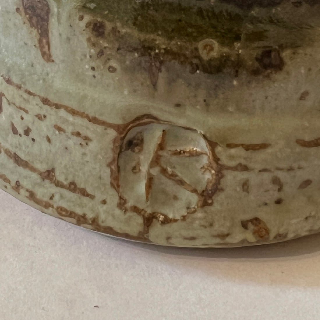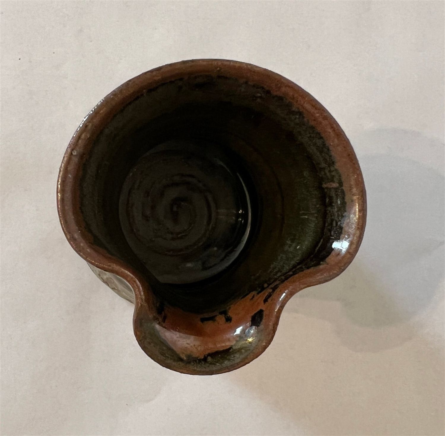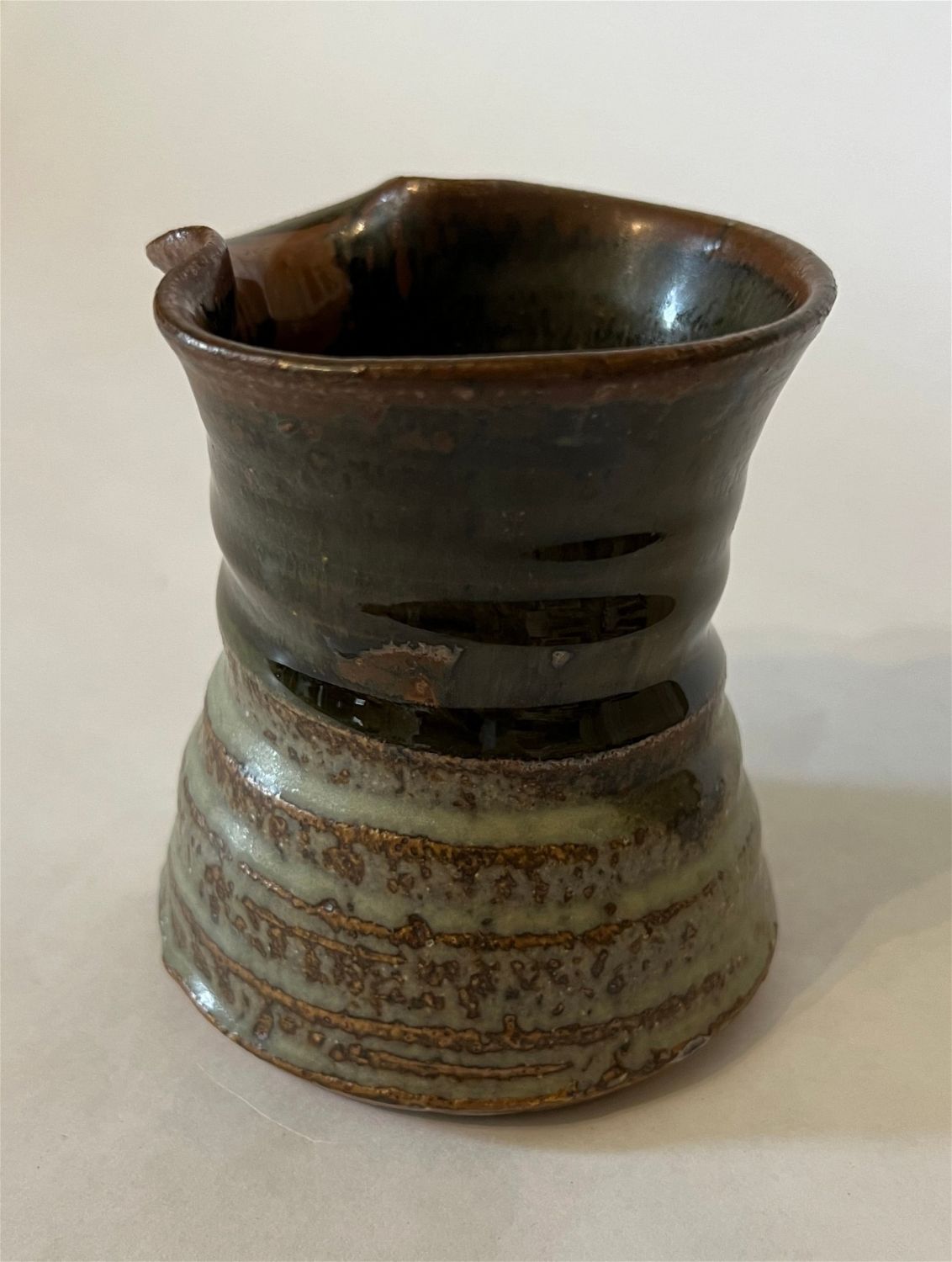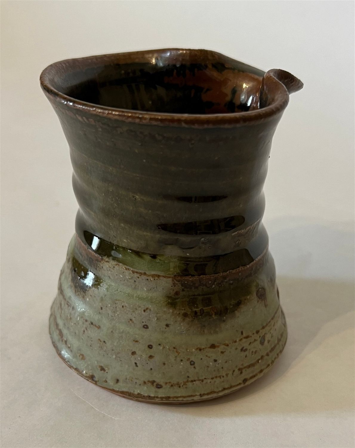 Kahmeyer, Ray (1930-2007) cream pitcher, stoneware, Kahmeyer stamp on bottom, good condition, no chips or cracks, size: 4 x 3.5 x 3.5 inches. Ray Kaymeyer was a graduate of Kansas State University with a BFA and MFA. He also attended Alfred University in New York. He was a Professor of Art, teaching ceramics, at Bethany College, Lindsborg, KS. He also served as department head, retiring as the Mary J. Mingen back Distinguished Professor of Art.Kaymeyer belonged to the Kansas Craftsman Assoc. National Council on Education for the Ceramic Arts and American Craftsman Council. Ray Kahmeyer (1930-2007) was born on September 10, 1930, in Nashville, Kansas. Kahmeyer taught ceramics for 25 years at Bethany College (1967-92), heading the art department after his first two years and then earning the endowed position of the Mary J. Mingenback Distinguished Professor of Art in 1973.Kahmeyer graduated from Pratt High School in 1948, and for some years worked as a butcher and did renovation projects for homes in the Pratt and Great Bend area along with woodworking with his father. After a stint in the US Navy during the Korean War, Ray returned home and decided to use the G.I. Bill and his construction skills to become an architect.Settling in Manhattan at Kansas State University, Kahmeyer discovered his life work by chance, taking a ceramics course as an art elective and immediately ?got bit? by the clay bug, as his sister Joy Davis described in 2016. Kahmeyer earned both his bachelor?s degree and Master of Arts from K-State, finishing a thesis on the raku method of ceramic firing and glazing to graduate in 1967. The bulk of Kahmeyer?s work is wheel-thrown, high-fired stoneware, suitable for domestic use.His friendships with important American ceramists Warren MacKenzie (1924- 2018) and Paul Soldner (1921-2011), with their own crucial influences of England?s Bernard Leach (1887-1979) and Japan?s Shoji Hamada (1894- 1978), continued to inform his work in functional pottery throughout his career.Kahmeyer exhibited his pots widely throughout his career, showing in a variety of regional exhibitions each year and occasionally sending work further afield to other states across the country. He earned numerous purchase awards and his work appears in a host of museum and private collections. The professor was also invited often to other colleges and high schools to present lectures, demonstrations, and workshops.Kahmeyer taught ceramics at Bethany for two and a half decades, imparting hard science lessons in the chemistry of glaze mixing and the physics of materials under forces of motion and heat, but gave all his students much more than a typical college education. The ceramics professor retired in 1992 but continued to work in his home studio ? a re-constructed chicken barn rebuilt with salvaged materials, including a plethora of old windows that provided good lighting.Kahmeyer and a few other Lindsborg artists began inviting people in to view and purchase work, inadvertently establishing the annual Artist Studio Open House that continues today.