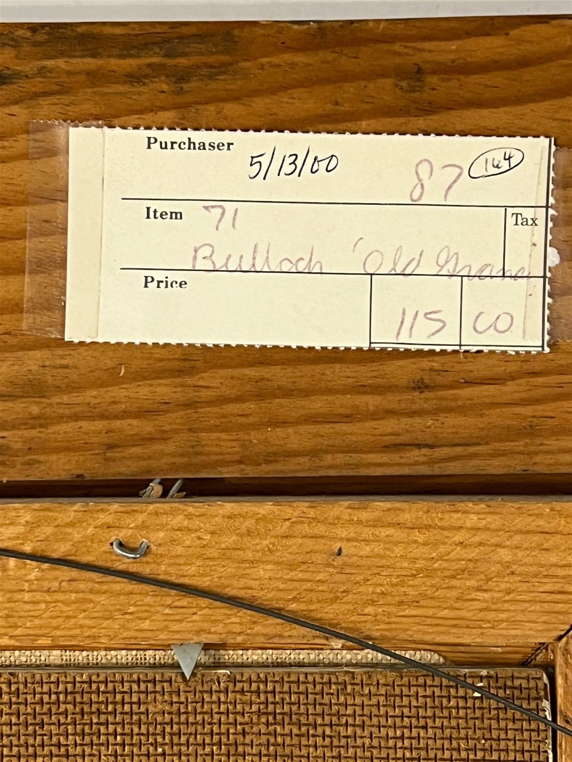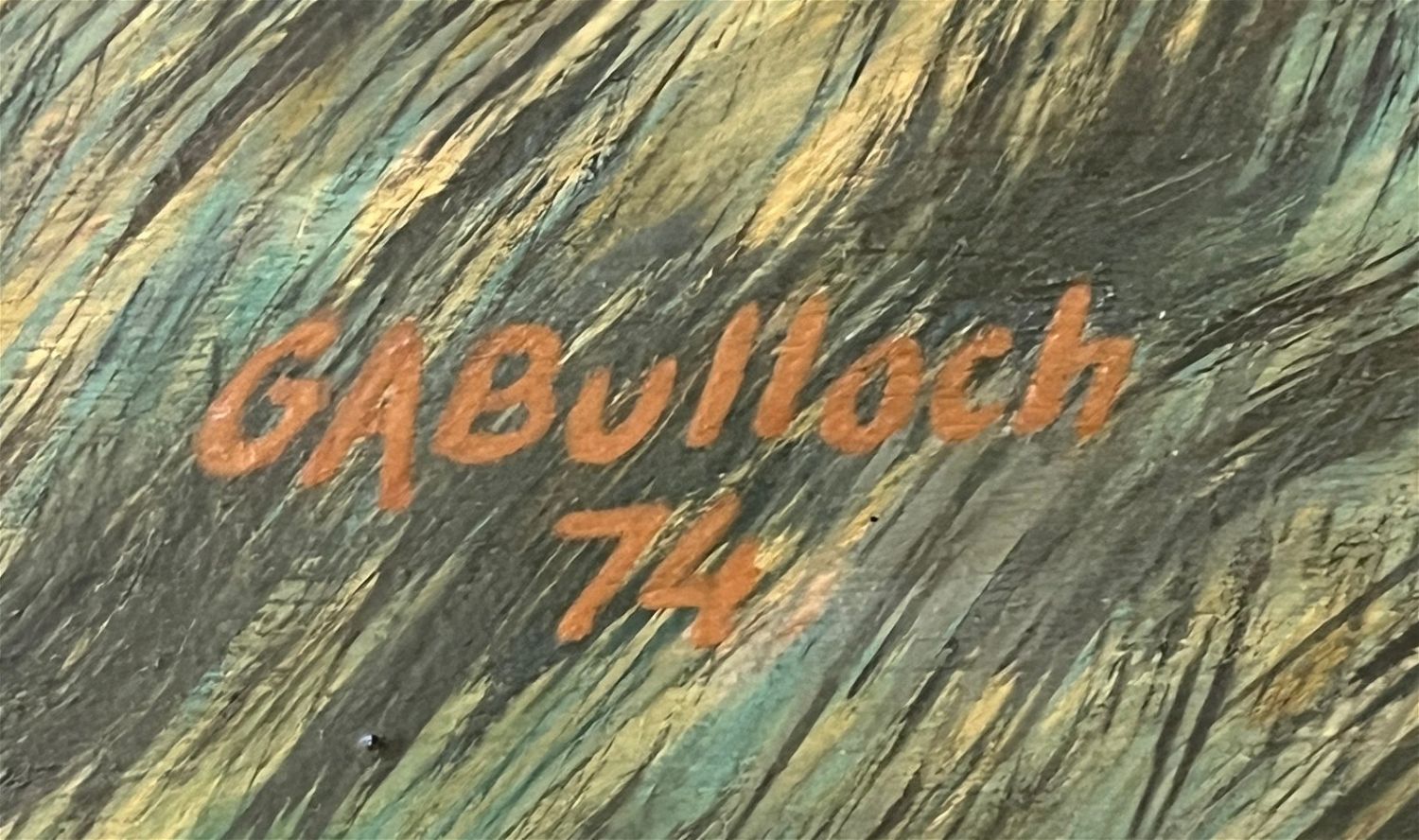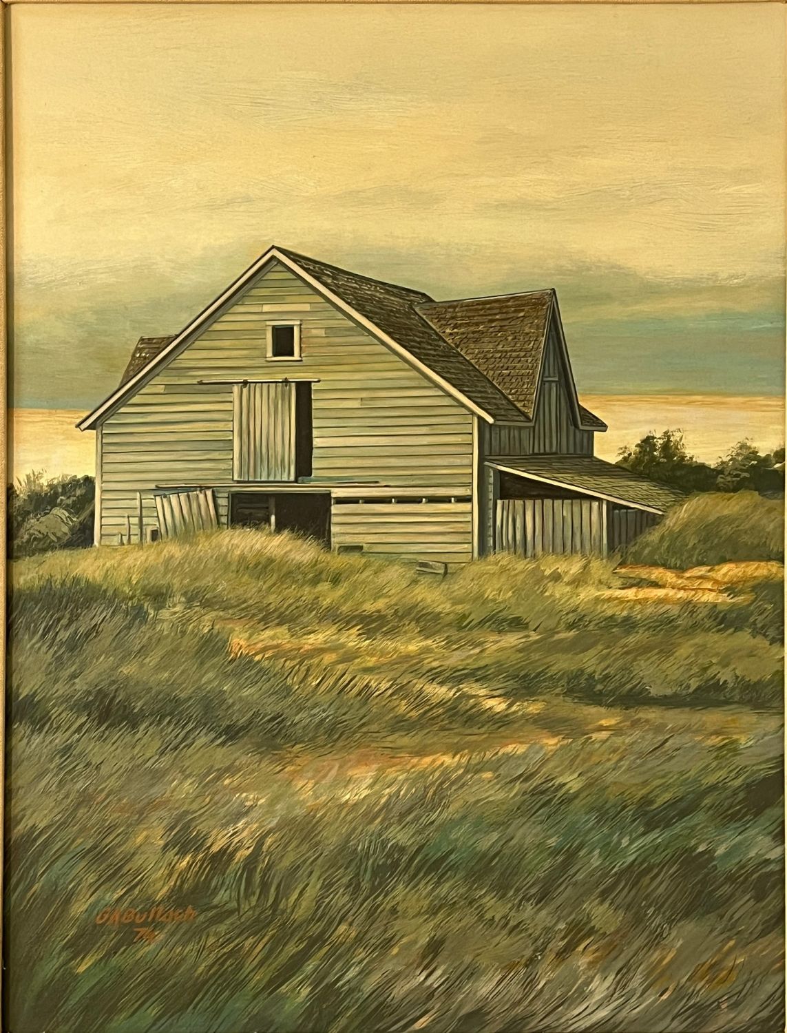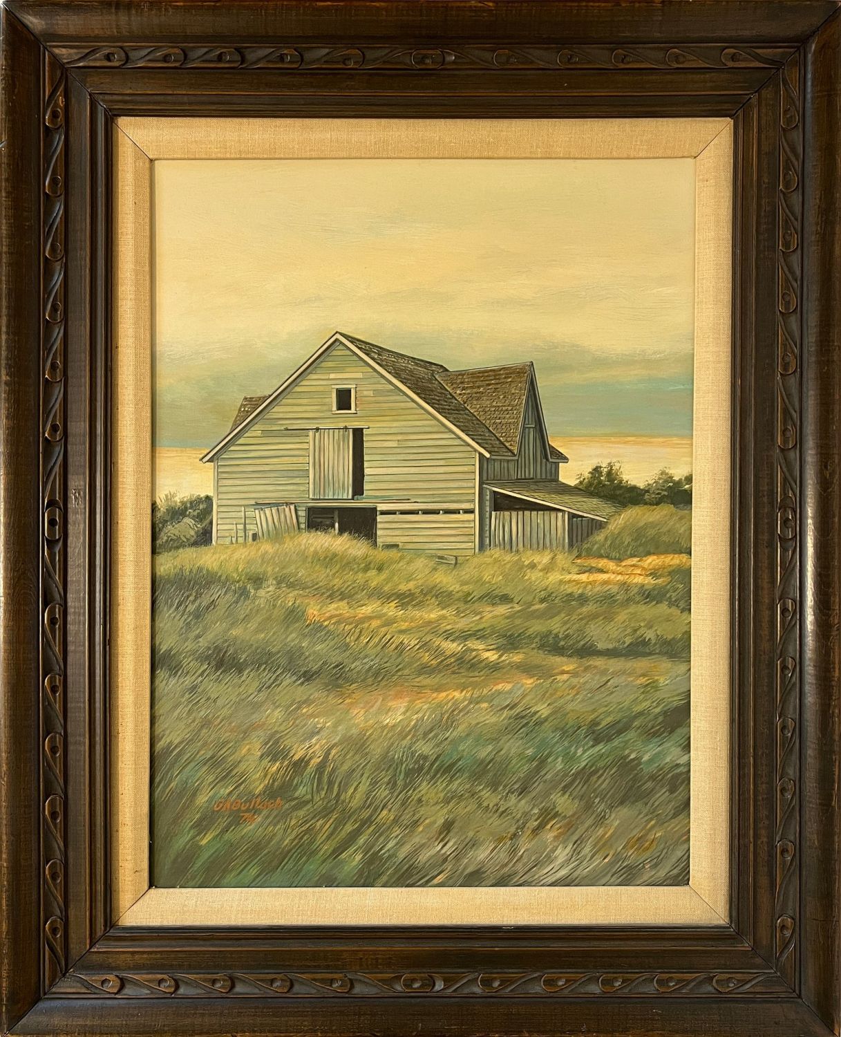 Bulloch, Gordon A (1923-2016) "Old Grainery, 1974 oil on board, signed in lower left, good condition, board size: 24 x 18 inches. Recruited to Boeing in 1951, he began his 35 year career there where he was an illustrator. While raising their children in Kansas, Gordon and Barbara enjoyed various family trips, always including photo opportunities that could be insprations for paintings.