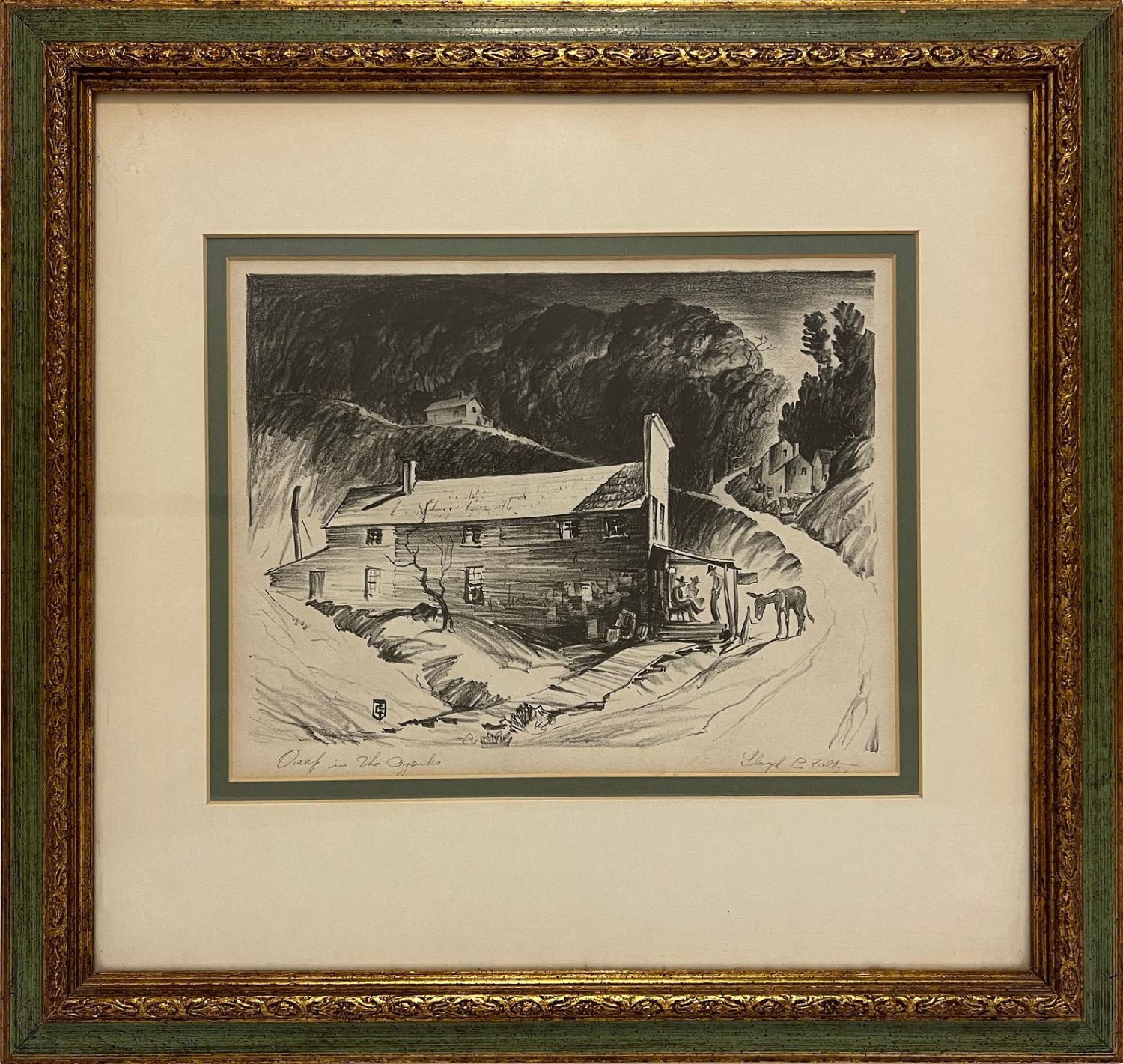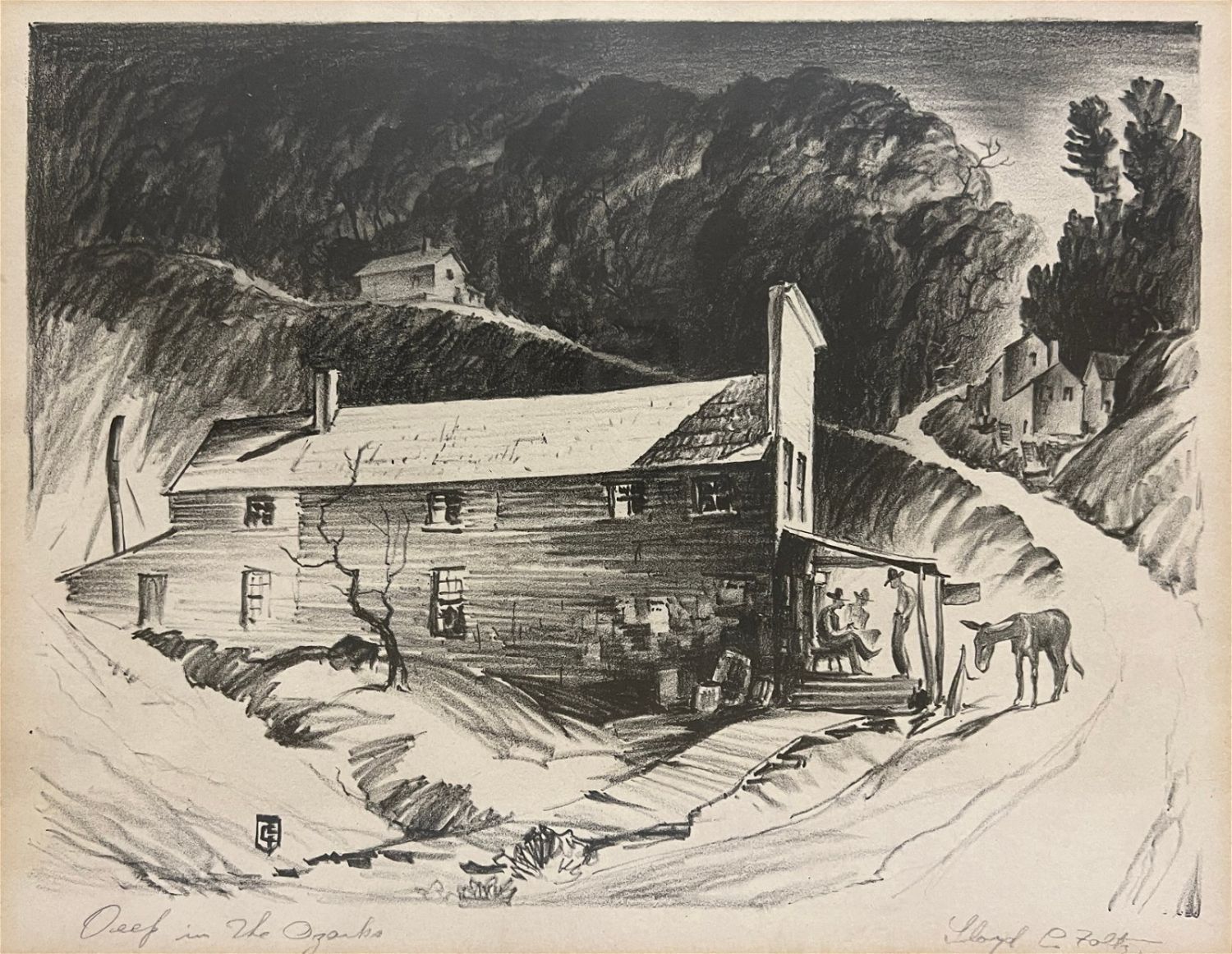 Foltz, Lloyd (1897-1990) "Deep in the Ozarks" lithograph, pencil signed in lower right, good condition, image size: 7.5 x 9.75.Teacher. Studied at the Chicago Academy of Fine Arts. Lived in Topeka and then in Wichita. Taught at the Wichita Art Association. Worked for Western Lithograph Co. Charter member of the Prairie Print Makers along with Birger Sandzen.