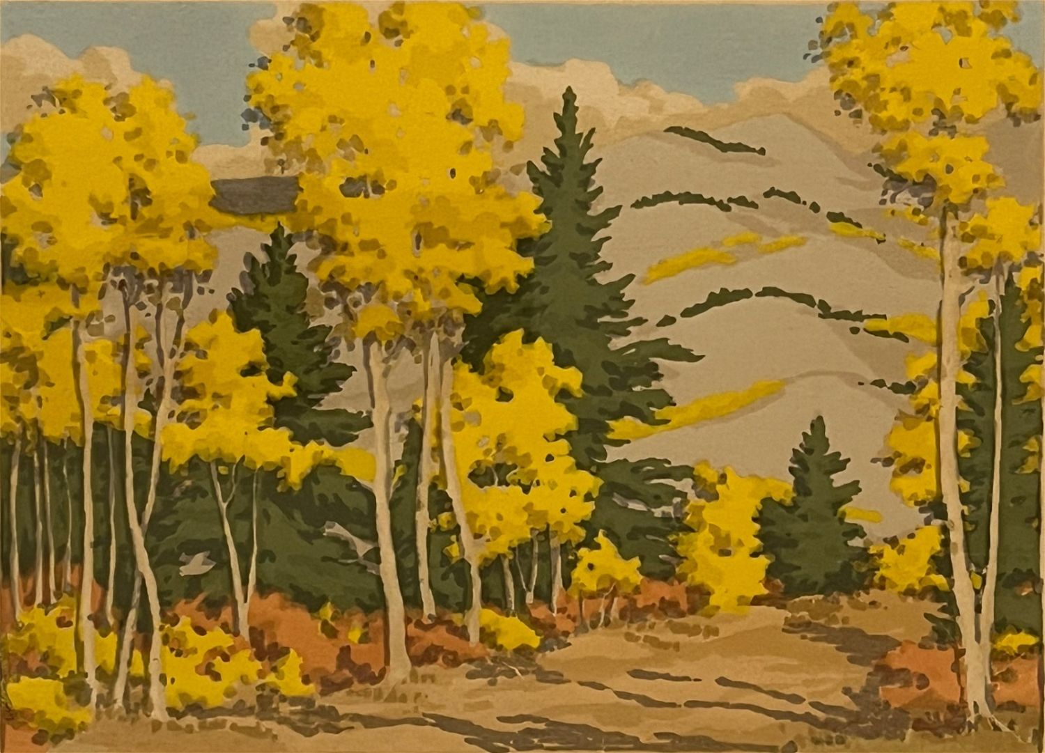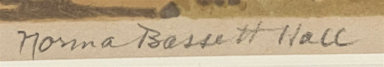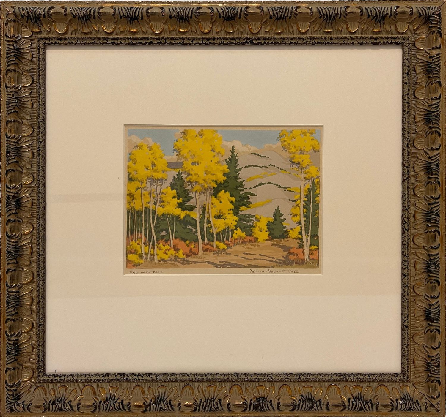 Hall, Norma Bassett (1889-1957) "Hyde Park Rode" serigraph, pencil signed in lower right, very good condition, image size: 5.75 x 8 inches. Most remembered as a woodblock printmaker and one of the founding members of the Prairie Printmakers, Norma Bassett Hall was the only woman charter member of that group and the only one to establish a reputation exclusively with color prints. She was born and raised in Halsey, Oregon, and took her first art lessons at the School of the Portland Art Association, where she studied for three years. After graduation, she gave private art lessons.In 1915, she enrolled at the Art Institute of Chicago, graduating in 1918. There she was an assistant teacher for one year and met her future husband, Arthur William Hall, who was also a student there and whose studies were interrupted by army service in World War I. Norma Hall worked on defense projects in a drafting office after her graduation until the end of the war.In 1920, she returned to Oregon where she opened a studio in Portland and taught in a high school. Two years later she and Arthur were married.Her interest in woodblock printmaking dated from 1922 when she was on a Cannon Beach, Oregon honeymoon trip with Arthur. The couple decided to make a pictorial visit of their trip by copying block prints from a book, and she saw what she described as the "real possibilities" of block printmaking. She used the Oriental method, which is the mixing of dry color with water and rice-flour paste.She had a residency in Kansas in 1923, and furthered her interest and skills in color block prints. She and her husband spent two years in Europe, 1925 to 1927, studying and sketching including time in London and Edinburgh, Scotland where she met Mable Royds, married to etcher E.S. Lumsden. From Royds, she learned the Japanese woodcut print method on rice paper involving transparent watercolors, which for Hall was a redirection from opaque oil based colors. Adopting this approach exclusively for many years, Hall printed with as many as six or seven colors, each requiring a separate hand cut woodblock. In 1942, the couple moved to Santa Fe, New Mexico where her reputation was established for her block prints of the Southwest, especially New Mexico. After a short time, the couple settled in Alcalde, New Mexico where the couple continued painting and also opened a summer art school. She began to devote a lot of time to serigraphs of local scenes and also did watercolors. The subjects of the totality of her work reflect the wide travels of the Halls and include Kansas-farm scenes, Oregon landscapes, European scenes and New Mexico pueblos.
