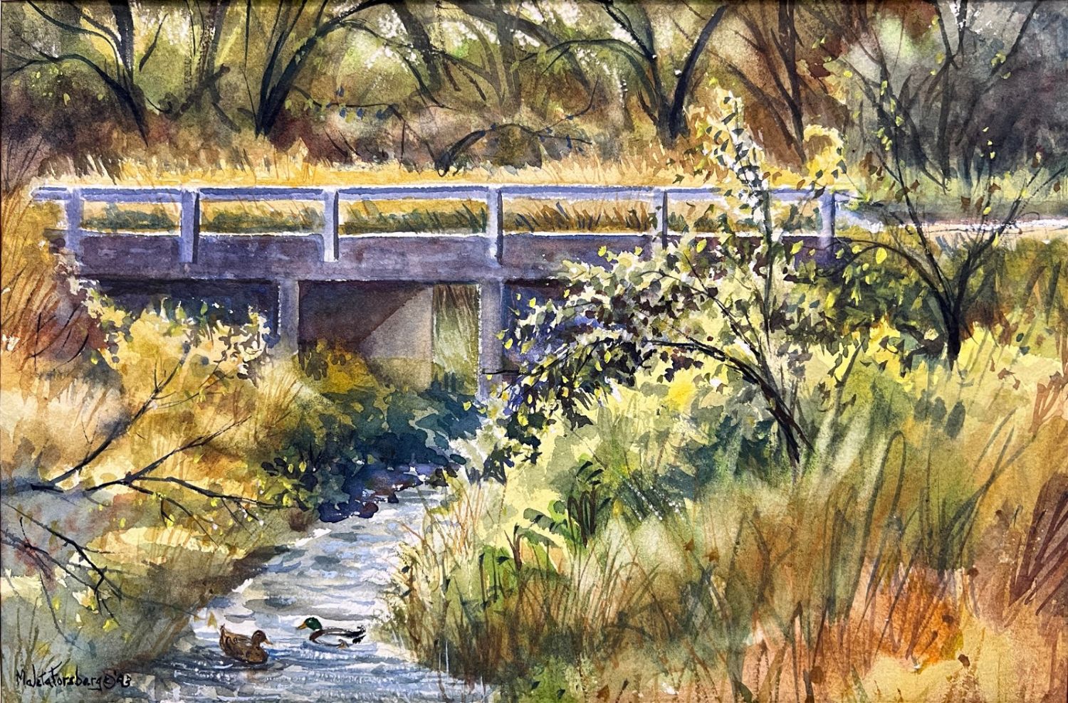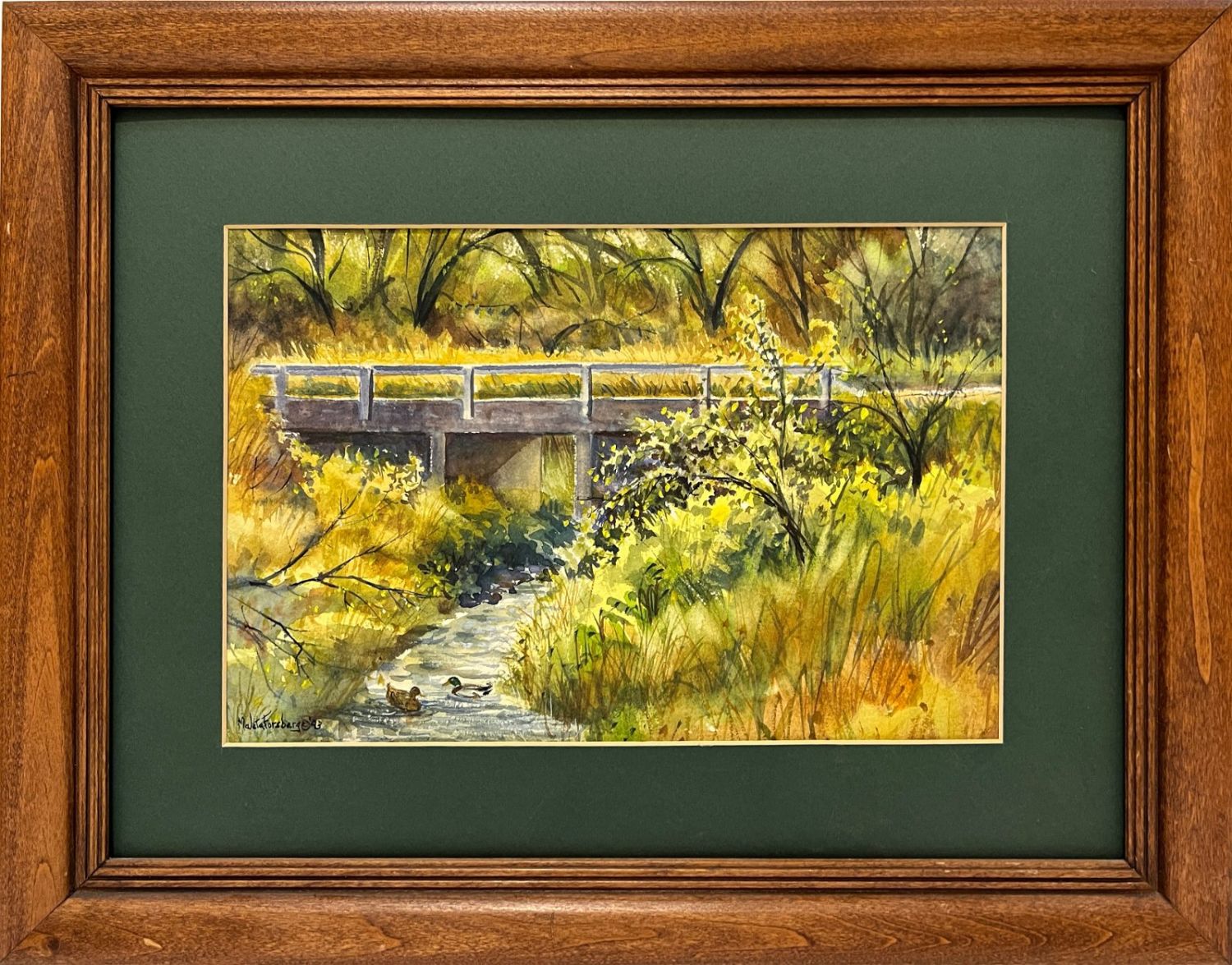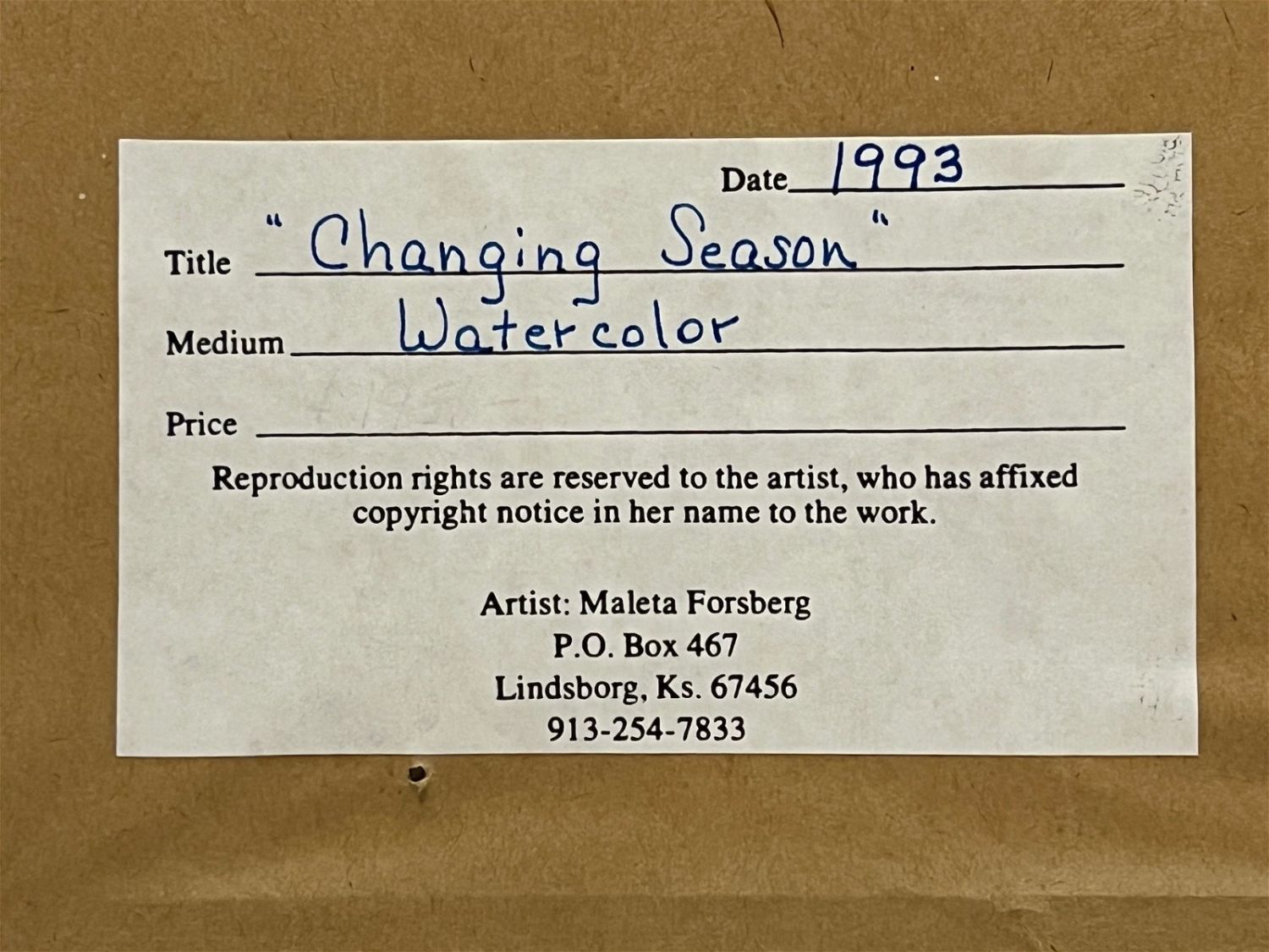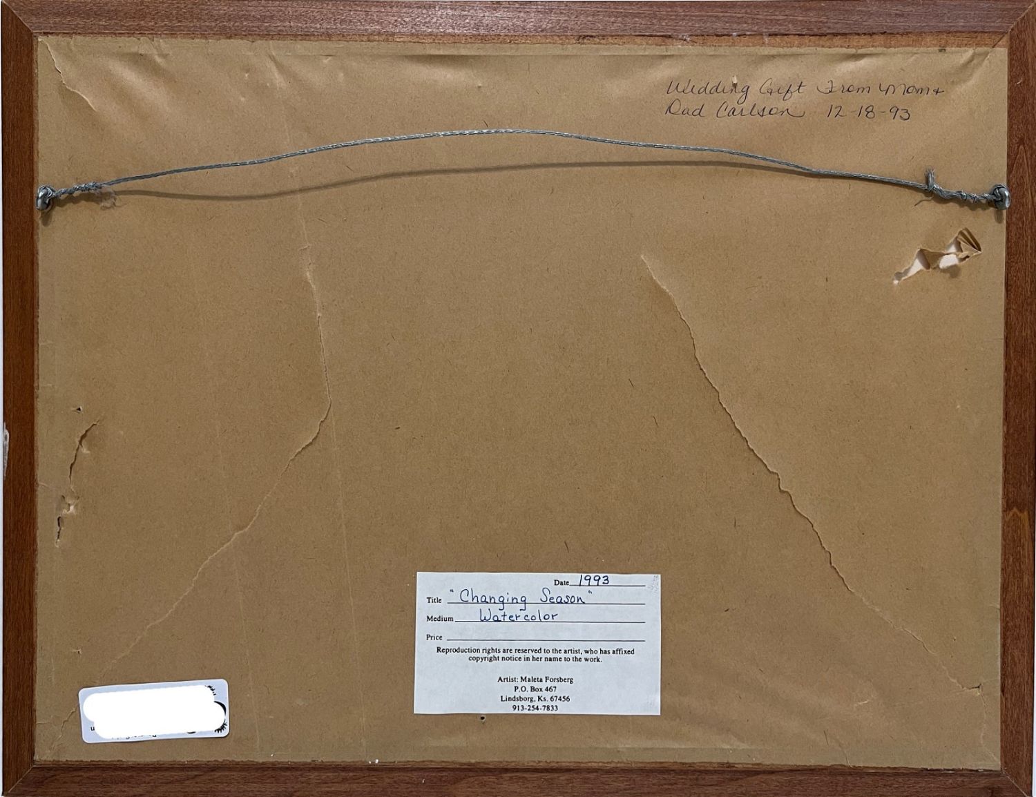 Forsberg, Maleta, "Changing Season" 1993 watercolor, signed in lower left, good condition, no glass in frame, image size: 8 x 12 inches. Maleta Forsberg is active/lives in Kansas. Maleta Forsberg is known for Rural landscape, animal and architecture painting.Attended the Kansas City Art Institute night school while working as a secretary. Lived in Wichita, Kansas before moving to Lindsborg, Kansas. She earned a reputation for her watercolors, oils and acrylics of rural landscapes, animals and architecture in the Midwest. Forsberg has completed major liturgical commissions, as well as paintings and designs that celebrate her Swedish heritage. Member: Artists’ Guild of Wichita; Kansas Watercolor Society; Kansas Academy of Oil Painters. Exhibitions: Wichita Art Assoc.; Kansas Watercolor Society; Sandz?n Memorial Art Gallery, 1997.