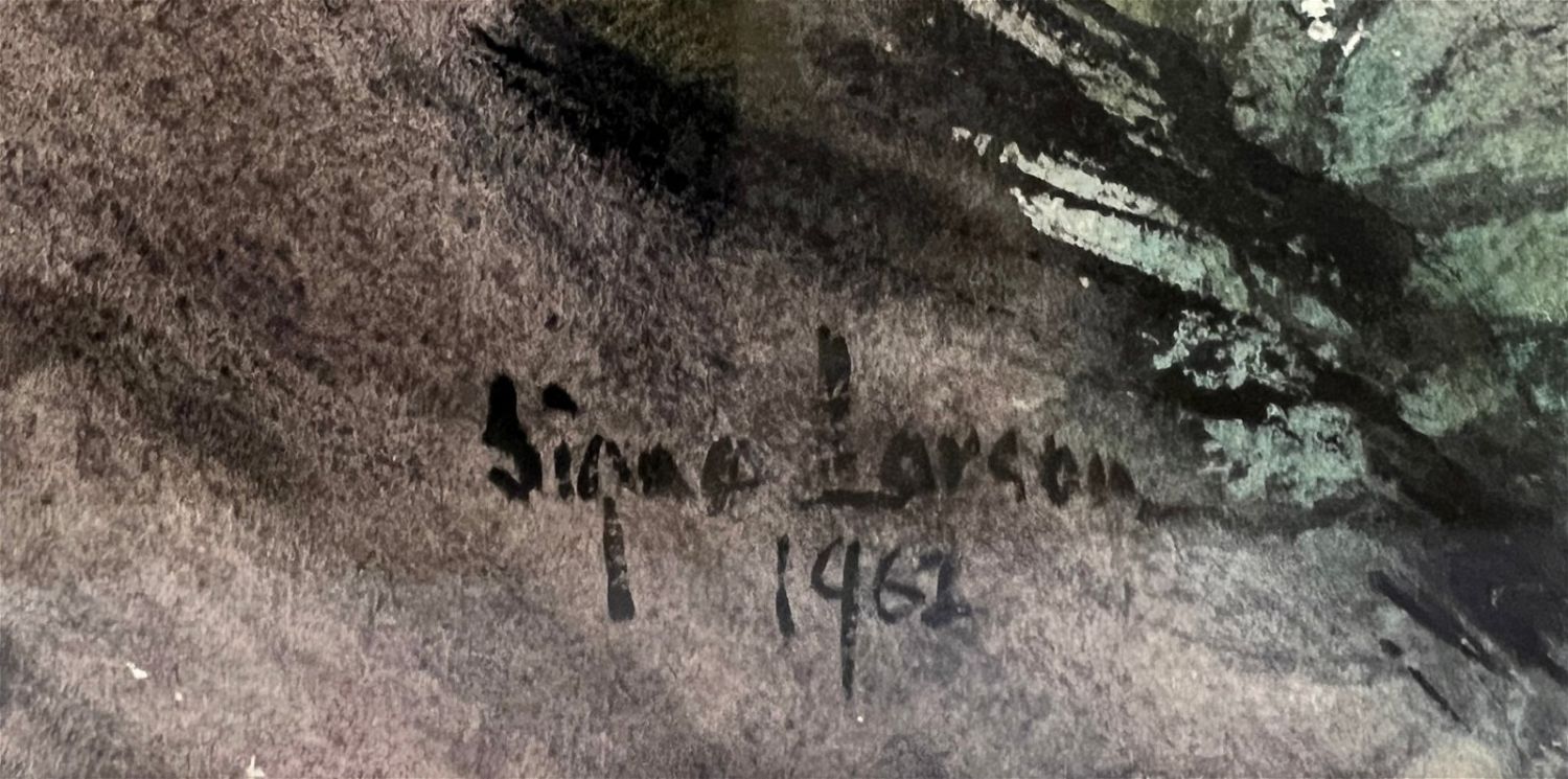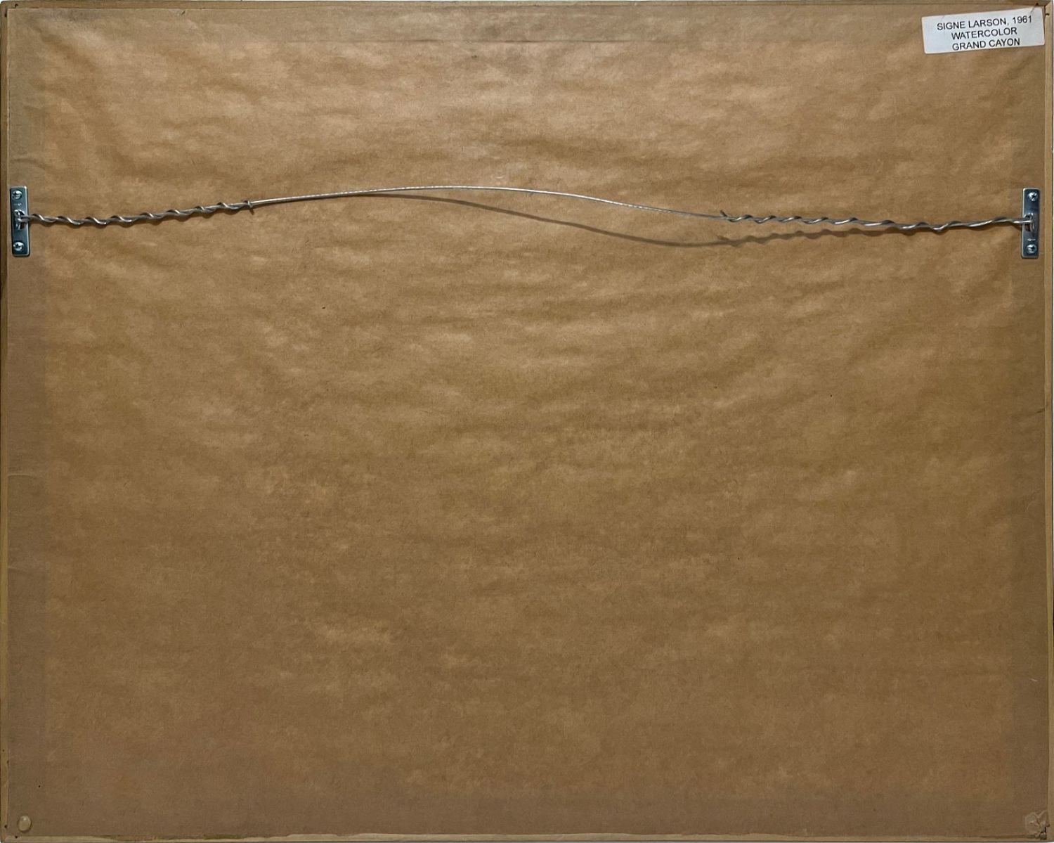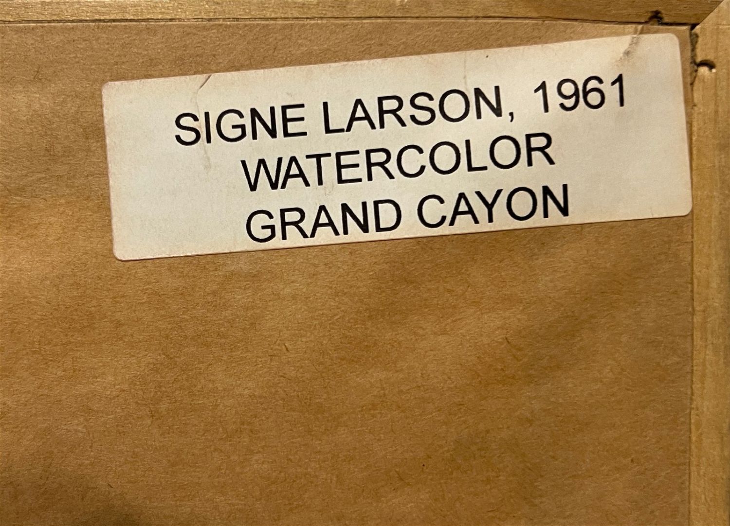 Larson, Signe (1908-1993) "Grand Canyon" 1962 watercolor, signed in lower right, good condition, image size: 16.25 x 20 inches. Signe Larson (1908-1993) was born in Buxton, Iowa. She was the youngest of four children and despite lifelong deafness, she was a successful artist. Her family moved to Lindsborg, Kansas in 1927 so that she could attend Bethany College. She studied under Birger Sandzen (1871- 1954) until 1933, when she graduated. She also later studied at the University of Colorado at Boulder, University of Washington and the Chicago Art Institute.With her sister Elvira, she traveled across the United States, Canada and Europe presenting chalk lectures, called Chalk Talks, in churches. Her paintings and prints were awarded prizes in regional and national exhibitions. Her favorite painting medium was watercolor. Several of her watercolors were reproduced in Ford Times Magazine.A mural by Larson hangs in St. Paul Lutheran Church in Clay Center, Kansas. In Lindsborg, her Village Spire Studio and the home of her and her sister were the centers of her life. Watercolors and prints by Signe have found their way into homes across America.In 1984, having moved to a care home in Cordova, Nebraska, she was named "Alumni Artist of the Year" by Bethany College. She was the featured artist for Hyllningsfest in 1993. Her painting of four women at a Swedish smorgasbord served as the program cover for the festival.