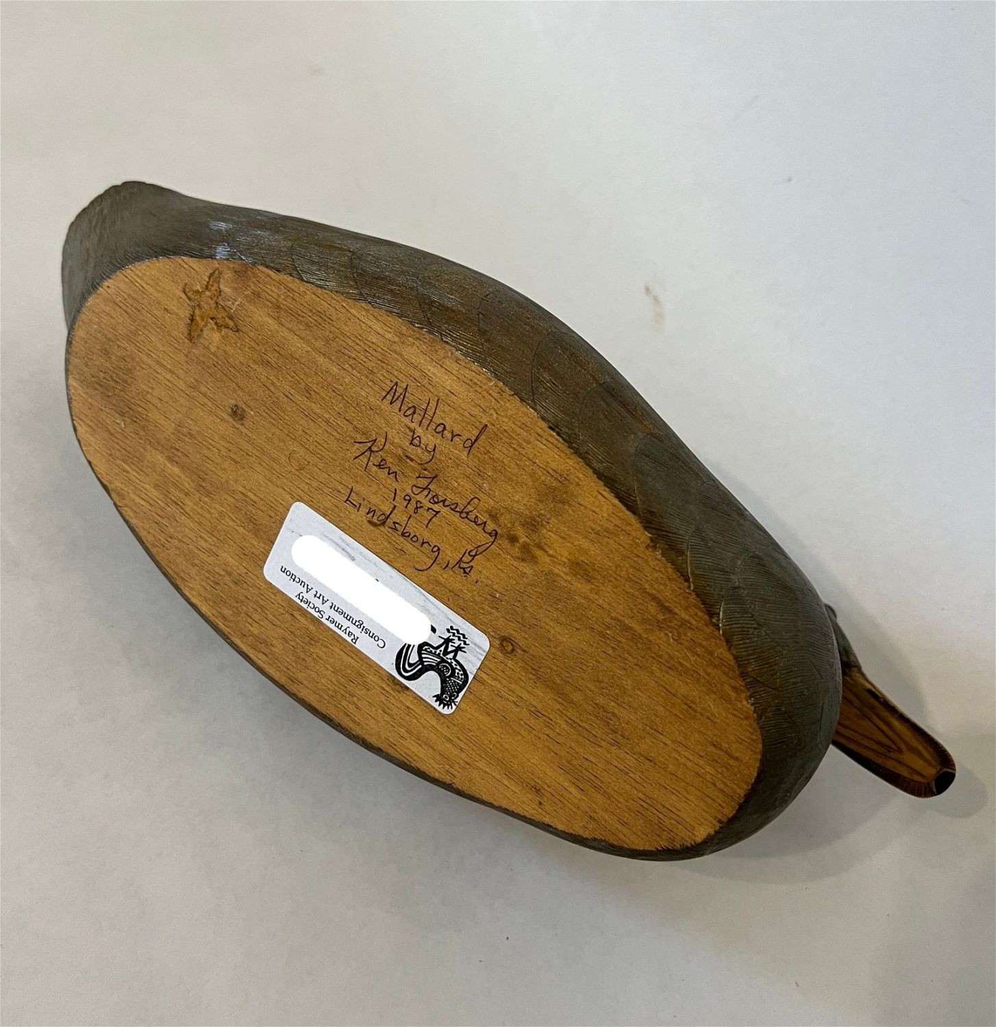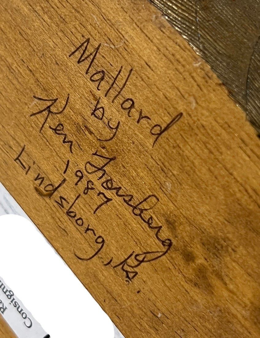 Forsberg, Ken (1929-2007) "Mallard" woodcarving, signed on bottom, good condition, image size: 6.5 x 13.25 x 5 inches. Educator and woodcarver from Lindsborg, KS.