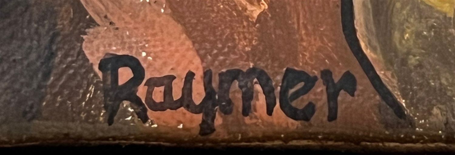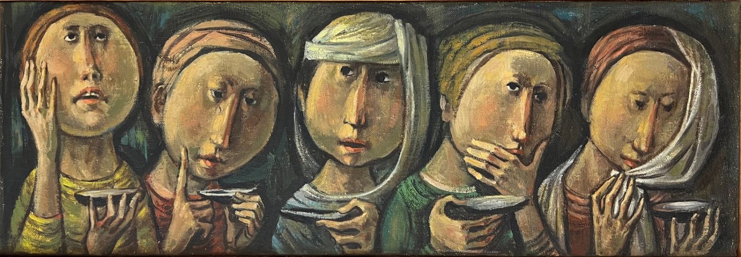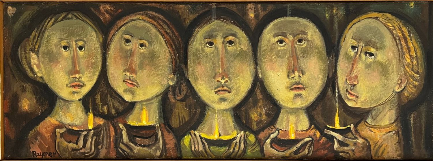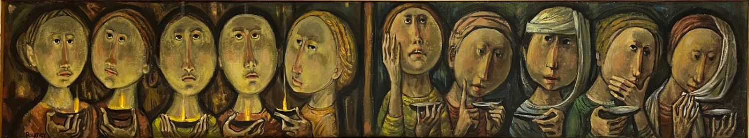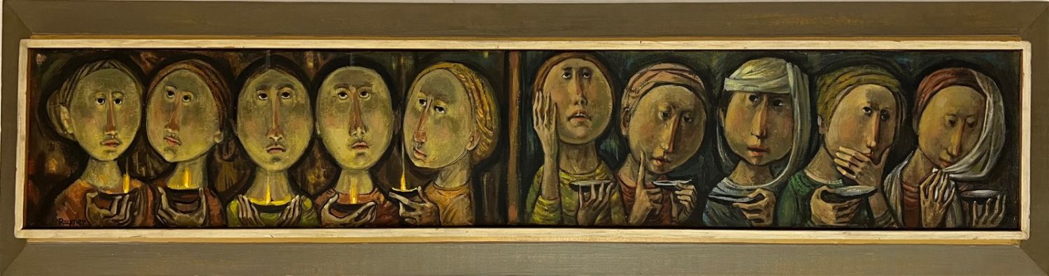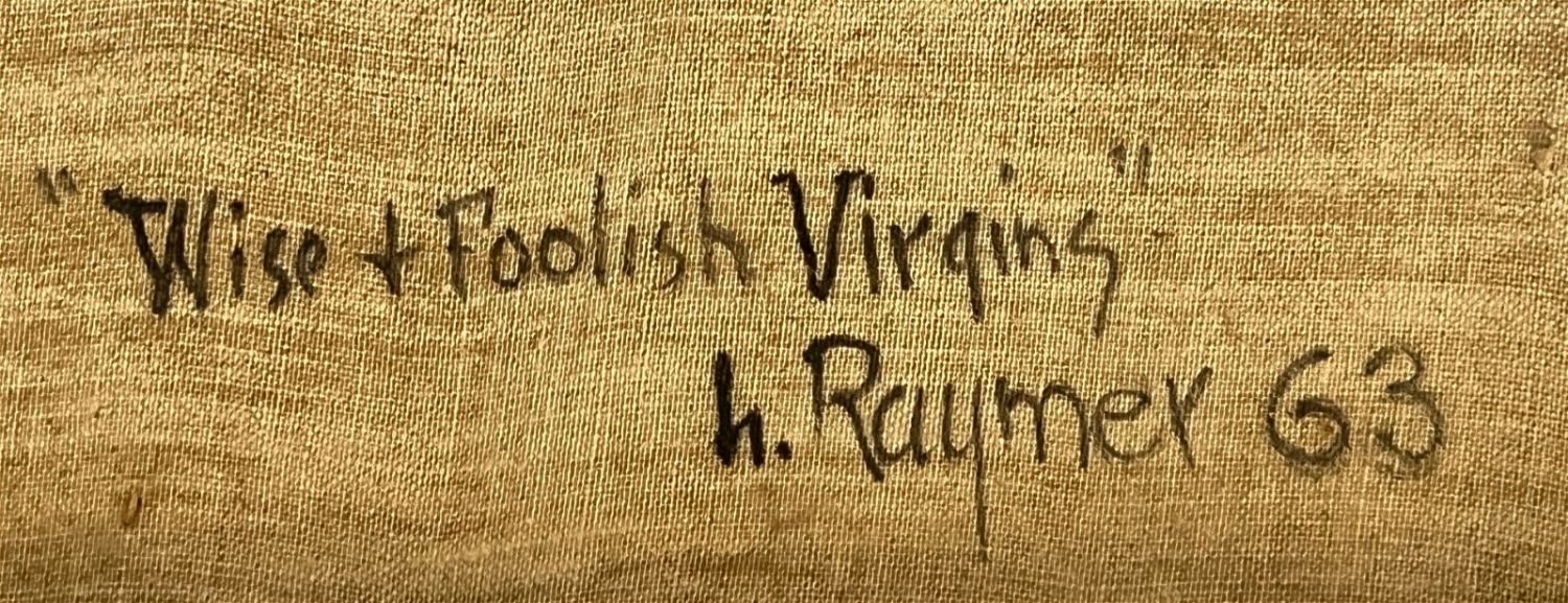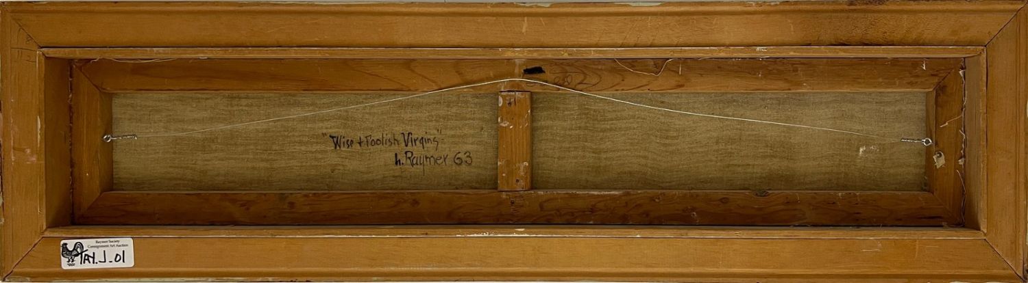 Raymer, Lester (1907-1991) "Wise and Foolish Virgins" 1963 oil on canvas, signed Raymer in lower left, good condition, size with Raymer frame: 9.5 x 36.75 inches. Lester Raymer, born in 1907, grew up on a farm just southwest of Alva, Oklahoma. Raymer worked with a variety of art forms beginning in his early grade school years and continuing throughout his artistic career. He received his bachelor’s degree in art from the Art Institute of Chicago. From 1936 to 1945 Raymer lived on his family farm again and continued to develop his artwork. Raymer met Ramona Weddle, his future wife, at the Art Institute.Raymer’s art was influenced by a number of factors. The circus came to Alva often during Raymer’s childhood. He worked for a poultry business where he did drawings and paintings in his spare time. The "Bible" was a source of imagery beginning in his childhood. Raymer’s painting professor at the Chicago Art Institute was Boris Anisfeld from Russia, and his art history professor was Helen Gardner, author of "Art Through the Ages", long-time used as a textbook of American art. Raymer talked often of the great influence his trips to Mexico had on his artwork and of his desire to remodel his studio in the style of a Mexican home.Raymer won major awards and international recognition with his religious art work and liturgical commissions. He taught one year at Bethany College in the art department and then made his living from the sale of his artwork. He utilized a variety of materials to produce a diverse body of artwork. Lamps, candleholders, furniture, and many of the sculptures in the studio were made for the studio use, not to sell. His paintings were most significant to him.Raymer was a studio artist in Lindsborg, Kansas until his death in 1991