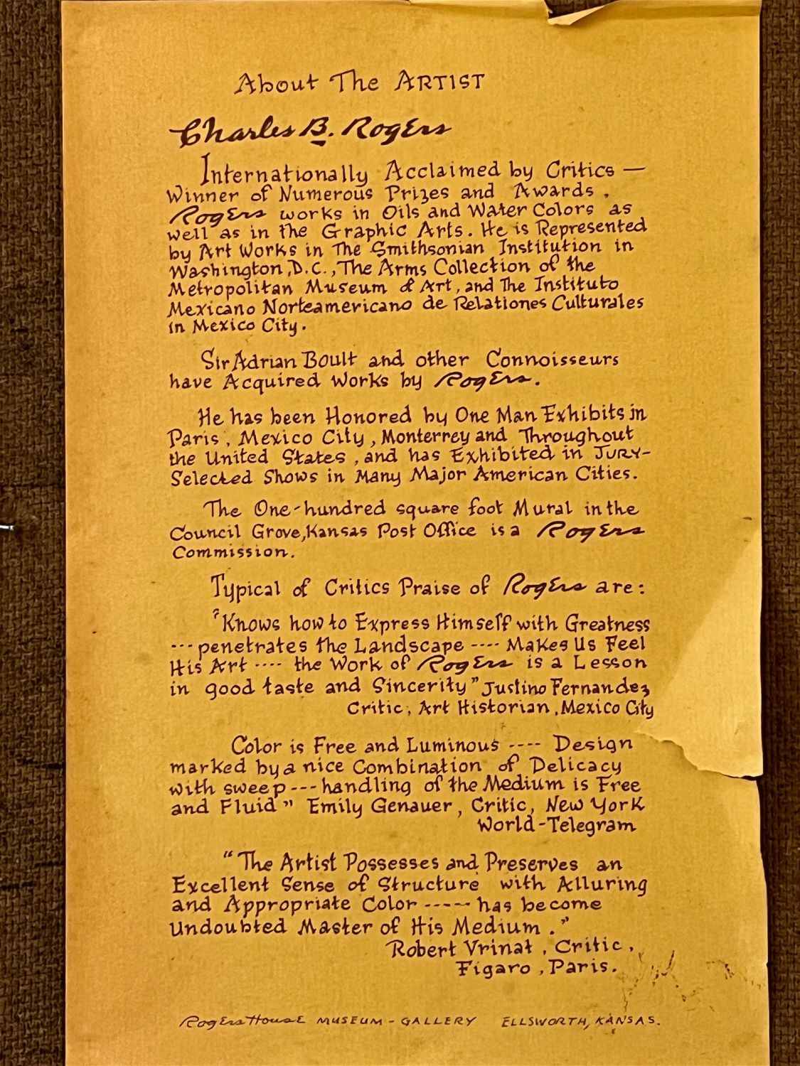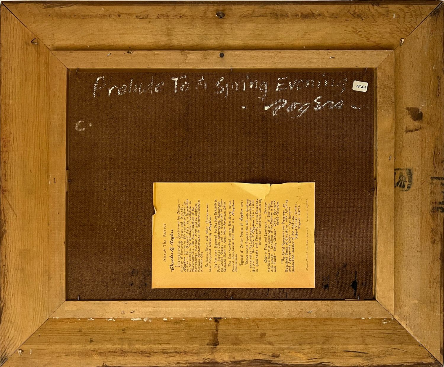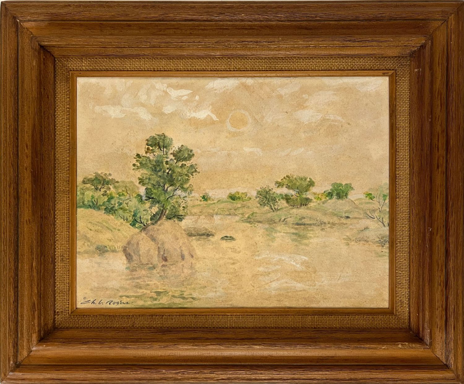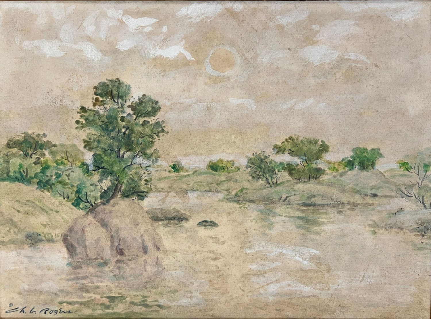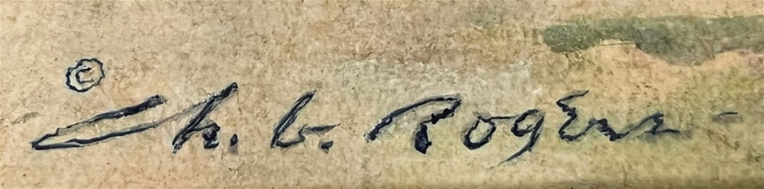Rogers, Charles (1911-1987) "Prelude to a Spring Evening" oil on board, signed in lower right, good but dirty, image size: 12 x 16 inches. A painter, art educator, and member of the Prairie Printmaker Society, Charles B Rogers (1911-1987) was known for his airy landscapes of the American West, often with pastel hues executed in oil. He was born in Great Bend, Kansas, and studied at the National Academy of Design; Bethany College in Lindsborg, Kansas under Birger Sandzen; the California College of Arts and Crafts; and with Dong Kingman and Jay Connaway. From 1947 to 1953, he taught at Lindsborg College, and from 1954 to 1966, he was Manager and Assistant Director of the Huntington Hartford Museum in Los Angeles. After that, he was a Professor of Art at Kansas State University.