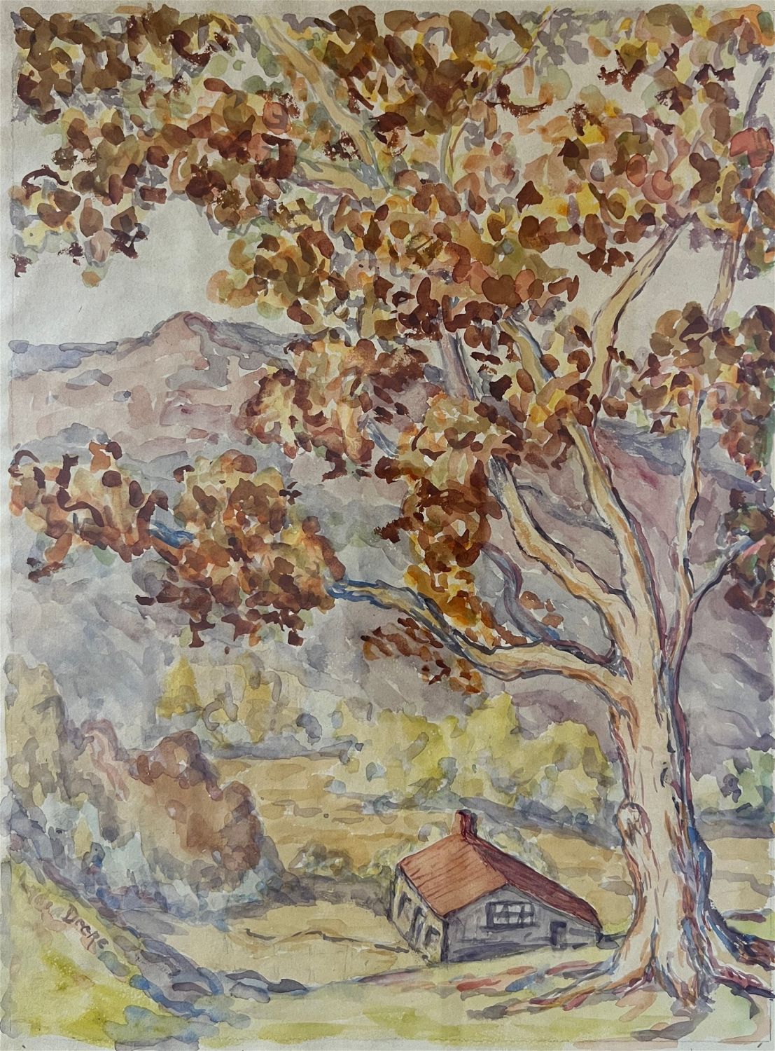 Deere, Lydia (1873-1923) untitled house with large oak, watercolor