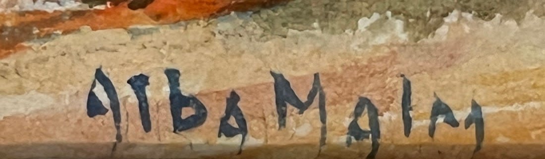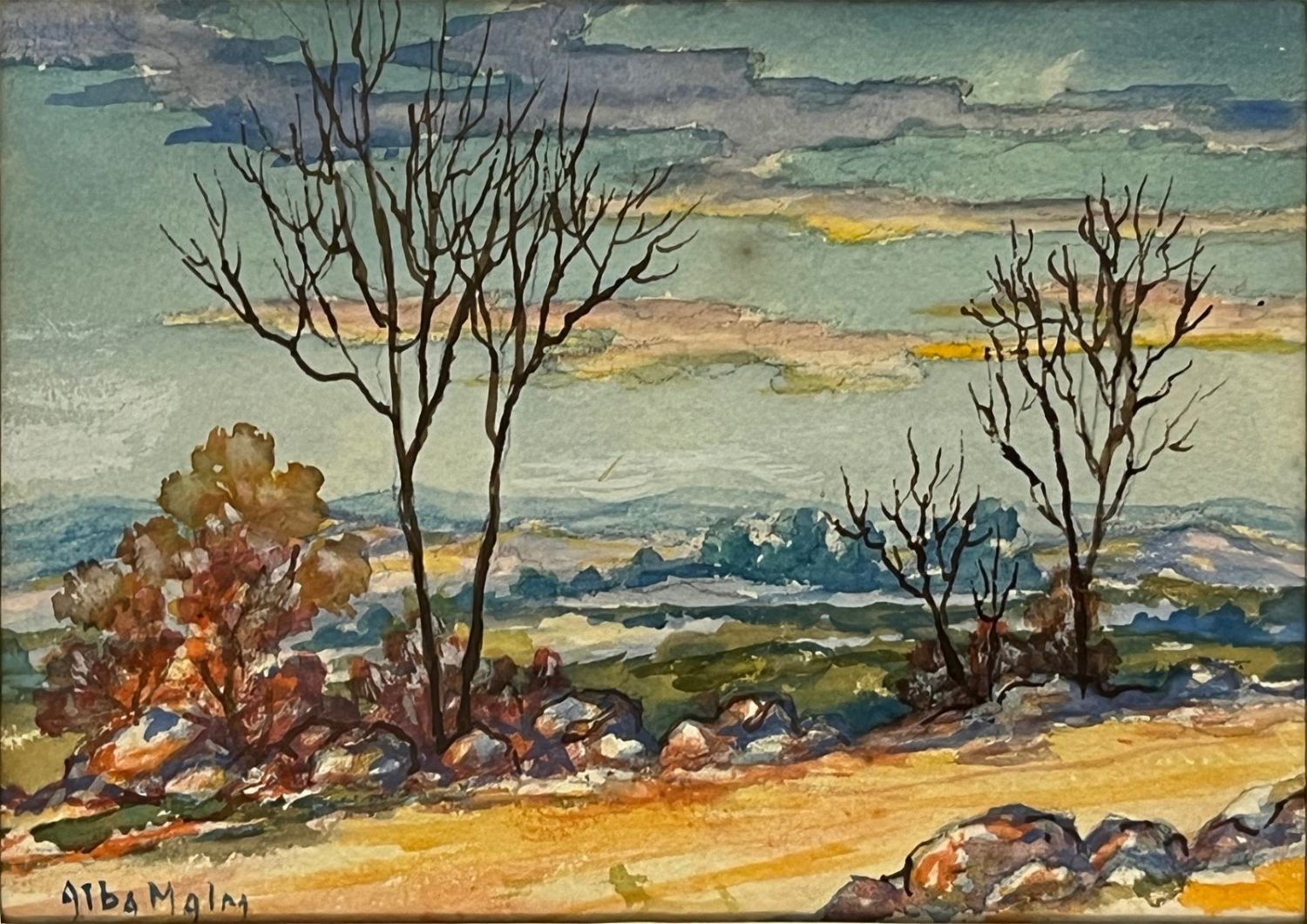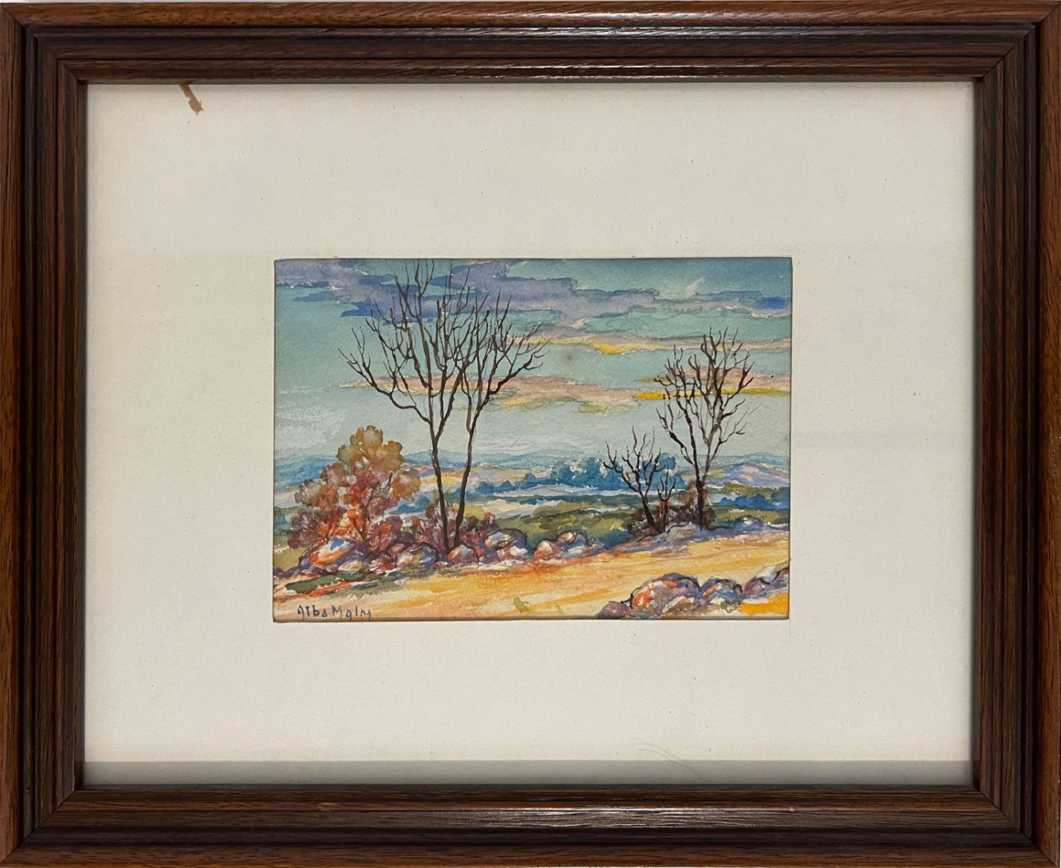 Malm, Alba (1897-1986) untitled, fall landscape, watercolorsigned lower left, good condition, image size: 4 x 5.75 inches. Alba Malm (1897-1986) was born Lindsborg, Kansas, 1897 and died in Lindsborg, 1986. Alba Malm Almquist was a painter and craftswoman. She received a B.A. degree from Bethany College, Lindsborg where she was a pupil of Birger Sandzen and her father, GN Malm.She did graduate work at the University of Kansas, Lawrence on a science scholarship and taught for many years in schools in and around Lindsborg.Some of Alba?s work is signed ?Dahlquist? because she was married to ? She divorced Dahlquist and later in life married Almquist.