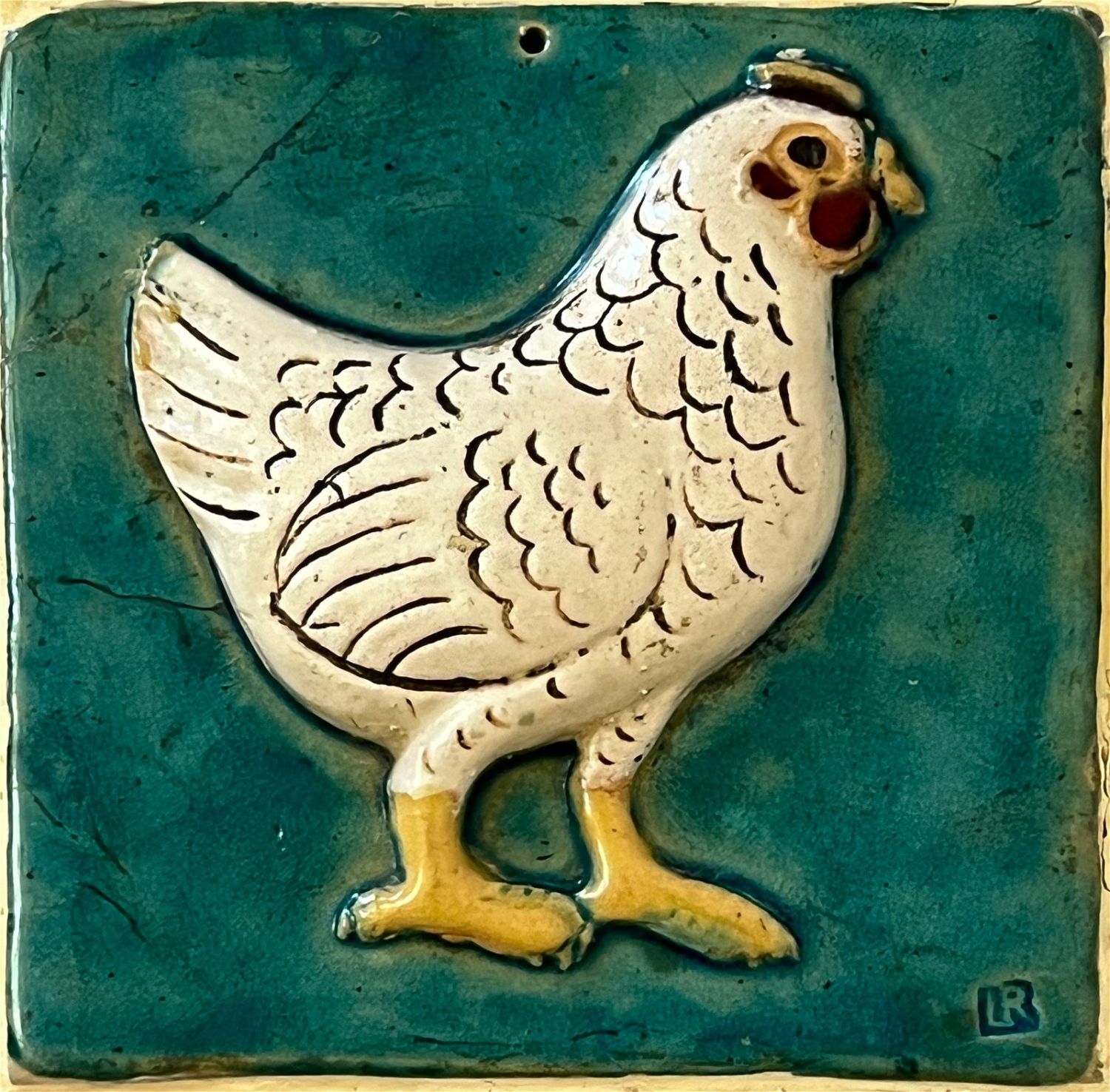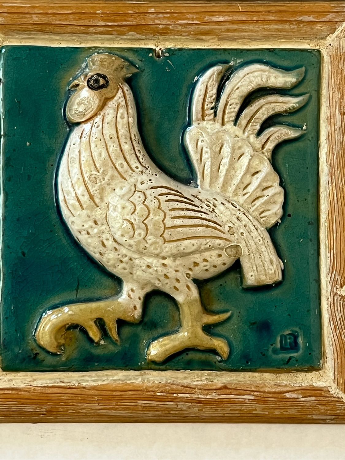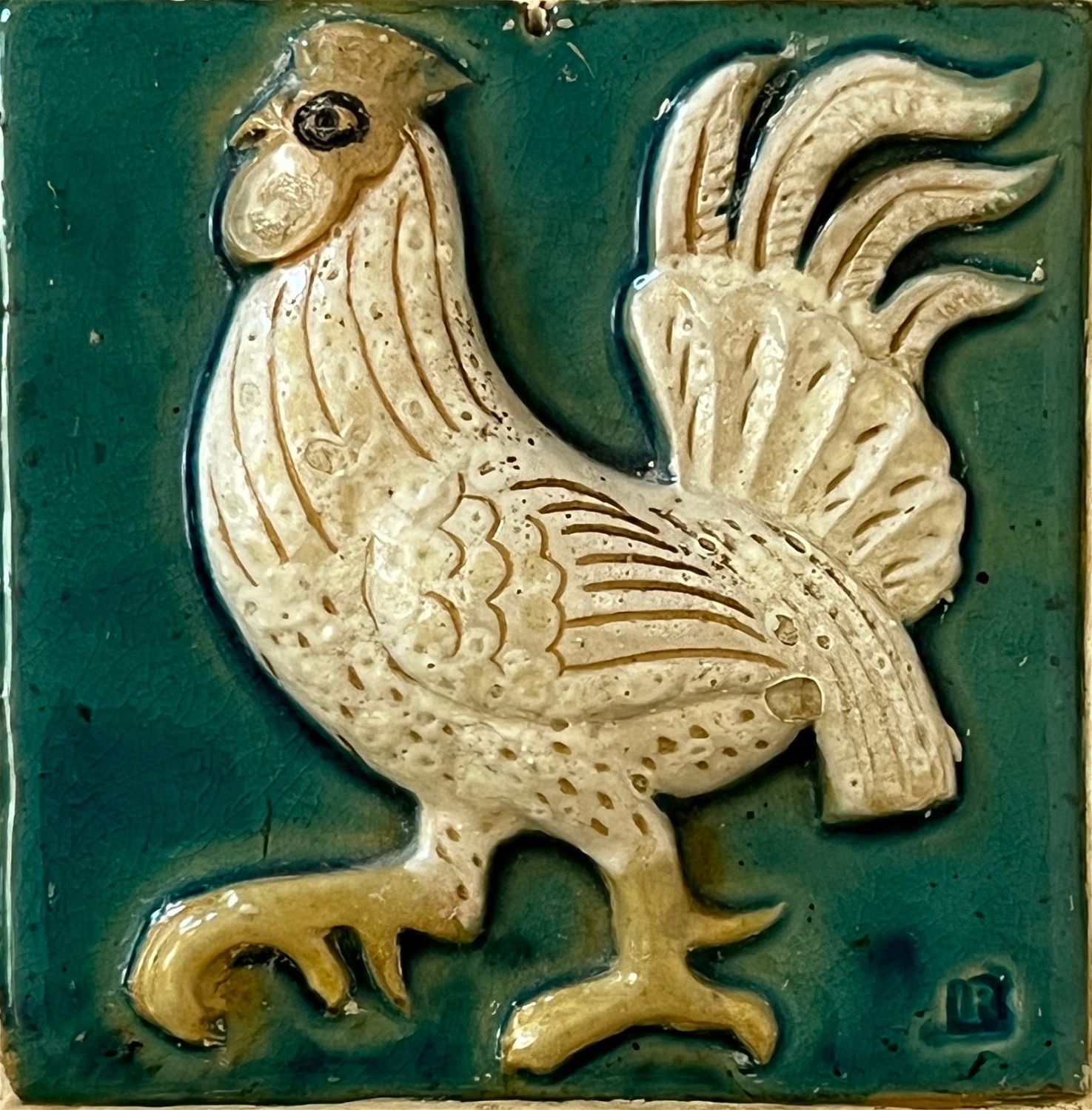 Raymer, Lester (1907-1991) pair of chicken tiles, ceramic, Raymer’s stamp "LR" on lower right on front of each, Raymer’s frames, good condition, tile size: 3.75 x3.75 inches each. one of Raymer’s annual Christmas cards, signed in lower right, good condition, image size: 5 x 4 inches. Lester Raymer, born in 1907, grew up on a farm just southwest of Alva, Oklahoma. Raymer worked with a variety of art forms beginning in his early grade school years and continuing throughout his artistic career. He received his bachelor’s degree in art from the Art Institute of Chicago. From 1936 to 1945 Raymer lived on his family farm again and continued to develop his artwork. Raymer met Ramona Weddle, his future wife, at the Art Institute.Raymer’s art was influenced by a number of factors. The circus came to Alva often during Raymer’s childhood. He worked for a poultry business where he did drawings and paintings in his spare time. The "Bible" was a source of imagery beginning in his childhood. Raymer’s painting professor at the Chicago Art Institute was Boris Anisfeld from Russia, and his art history professor was Helen Gardner, author of "Art Through the Ages", long-time used as a textbook of American art. Raymer talked often of the great influence his trips to Mexico had on his artwork and of his desire to remodel his studio in the style of a Mexican home.Raymer won major awards and international recognition with his religious art work and liturgical commissions. He taught one year at Bethany College in the art department and then made his living from the sale of his artwork. He utilized a variety of materials to produce a diverse body of artwork. Lamps, candleholders, furniture, and many of the sculptures in the studio were made for the studio use, not to sell. His paintings were most significant to him.Raymer was a studio artist in Lindsborg, Kansas until his death in 1991
