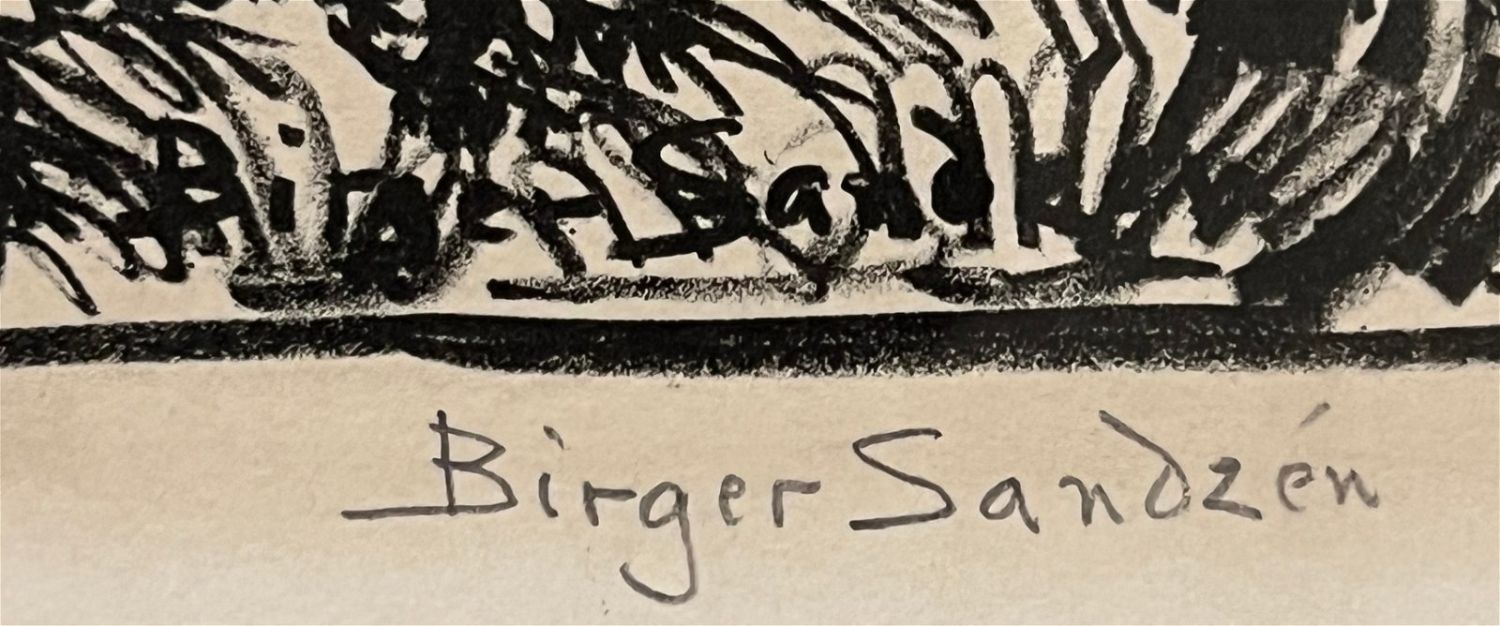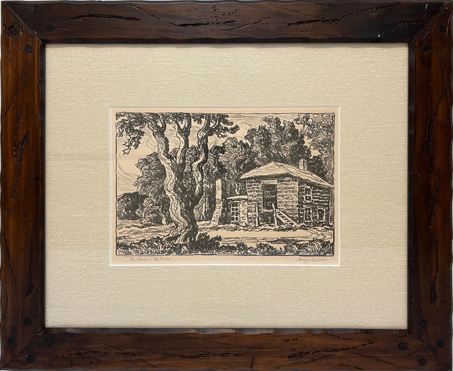 Sandzen, Birger (1871-1954) "The House in the Grove" 1930 lithograph, pencil signed in lower right, good condition, image size: 8 x 12 inches. Birger Sandzen had a long distinguished career as an art professor at Bethany College in Lindsborg, Kansas and as an impressionist landscape painter. He is best known for his modernist style with masses of paint, akin to that of Vincent Van Gogh and Paul Cezanne, and for Rocky Mountain Landscape subjects. His early work is Tonalist in style in the manner of Scandinavian Romanticism, but after he began taking trips to Colorado, his work became much more Expressionist and brightly colored.Sven Birger Sandzen was born in Blidsberg, Sweden to Clara Elizabeth and Johan Peter Sandzen. His mother had studied drawing and his father, a minister, enjoyed writing poetry and playing the violin. When Birger’s parents noticed his artistic inclination, they asked a young minister to give drawing lessons to the nine year old. At the age of ten, he attended the College and Academy of Skara. Here his drawing and painting lessons continued under Olof Erlandsson, a graduate of the Royal Academy at Stockholm. After graduation from Skara College, Sandzen spent a semester at Lund University attending art history lectures and continuing the study of French. Following Lund University he went to the technical high school at Stockholm, where he studied perspective and form drawing. Sandzen joined a group of young artists and they rented a studio at Anders Zorn’s suggestion. They received instruction from Anders as well as Richard Bergh, a well-known portrait painter and Per Hasselberg, one of Sweden’s best sculptors. A doctor from the Caroline Medical Institute of Stockholm gave anatomy lessons. These young artists formed "The Art School of the Artists’ League" which played an important part in the development of modern Swedish art.In the summer of 1894 Sandzen returned to Sweden where he read the book entitled I Sverige by a young Swedish-American educator, Dr. Carl A. Swensson. Dr. Swensson, a college president, told of his struggles on the plains of Kansas and he challenged other young Swedes to come help him. Sandzen was excited by the proposition and wrote Dr. Swensson a letter asking if he could use a young artist who could sing tenor and teach French. As soon as Sandzen received the cable offering him a job, he accepted and arrived in Lindsborg, Kansas the day college opened in the fall.Birger soon realized Lindborg was where he wanted to make his home with the inspiring atmosphere of the new College and energy of the young teachers and president. He built a home, where he continued to live for fifty-four years. In 1900 he married Augusta Alfrida Leksell, a gifted pianist. They had one daughter, Margaret Elizabeth.With time Sandzen became more and more involved in teaching, even his evenings were reserved for class time. At around nine or ten in the evening he would find time for his own drawing. Sandzen’s inspiration came from his summers spent in Colorado, Utah, and New Mexico.Sandzen spent his time trying to generate an interest in art by talking to people about art, organizing exhibitions and establishing art clubs. He donated artwork to the local art club to help raise money for the purchasing of art books for the library, the financing of exhibitions, and the occasional awarding of a scholarship.The Babcock Galleries in New York hosted two large exhibitions of Sandzen’s work in 1922 and 1923. His sponsors, the American-Scandinavian Foundation, enthusiastically invited him to come. Sandzen’s reply was that he had classes and could not leave.Sandzen retired after fifty-two years of teaching at Bethany College. Sandzen had honorary doctorates bestowed upon him by Midland College of Fremont, Nebraska by Nebraska University, and by Kansas State College. In 1940 he was made a Knight if the Swedish Order of the North Star.After many months of failing health, Birger Sandzen passed away quietly in his home on June 19, 1954.