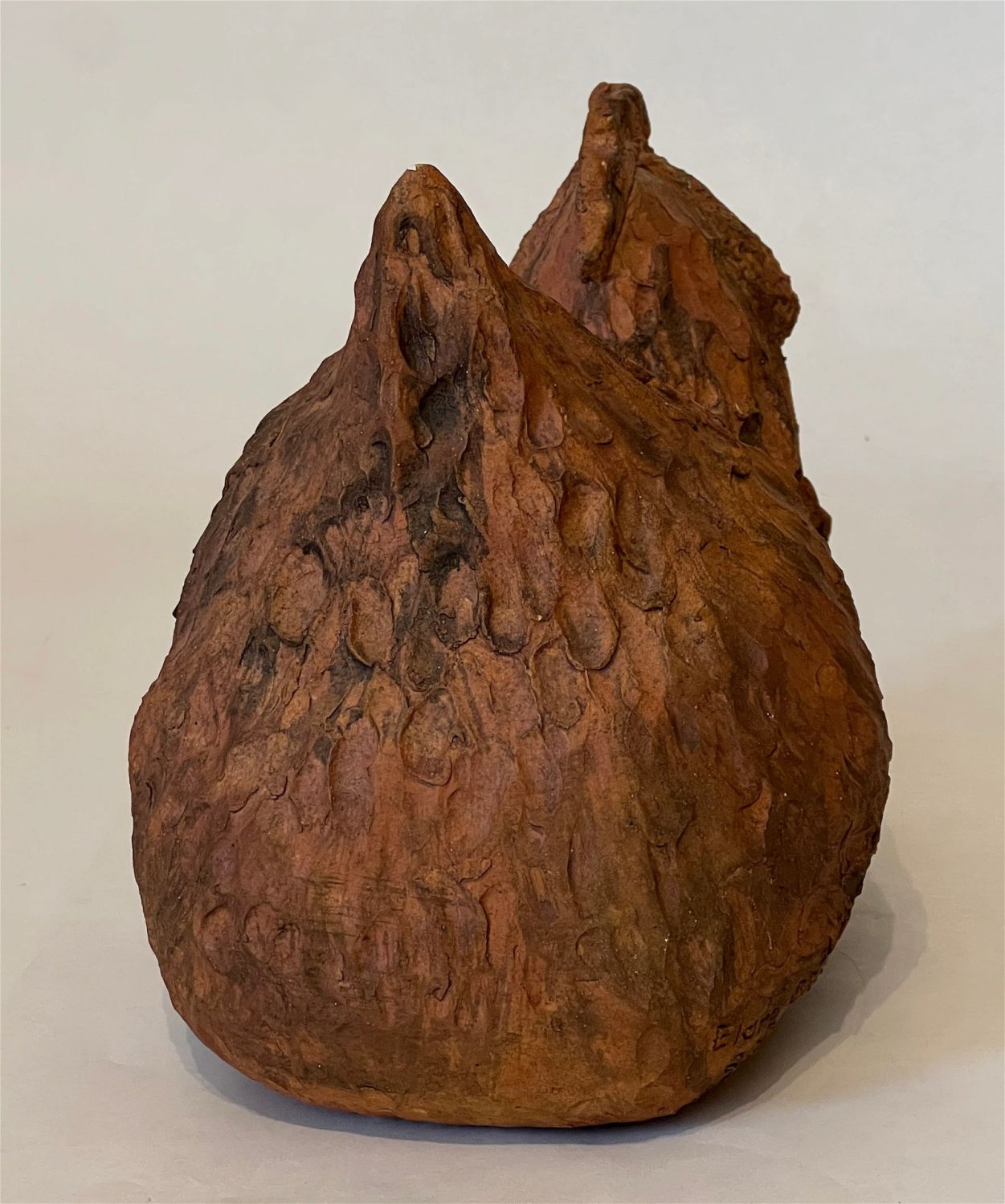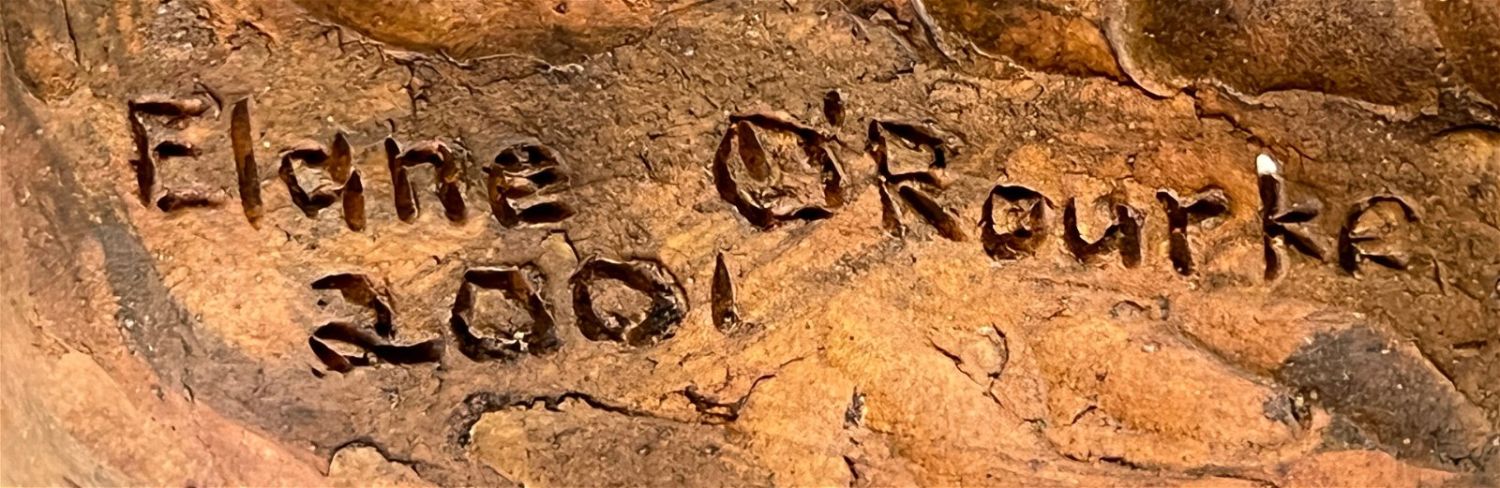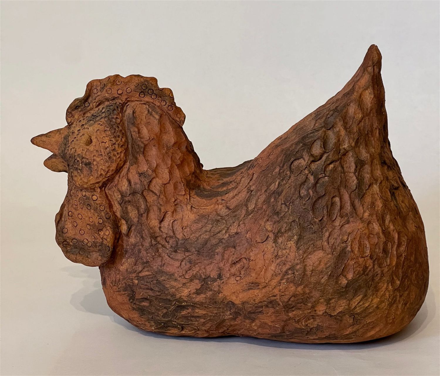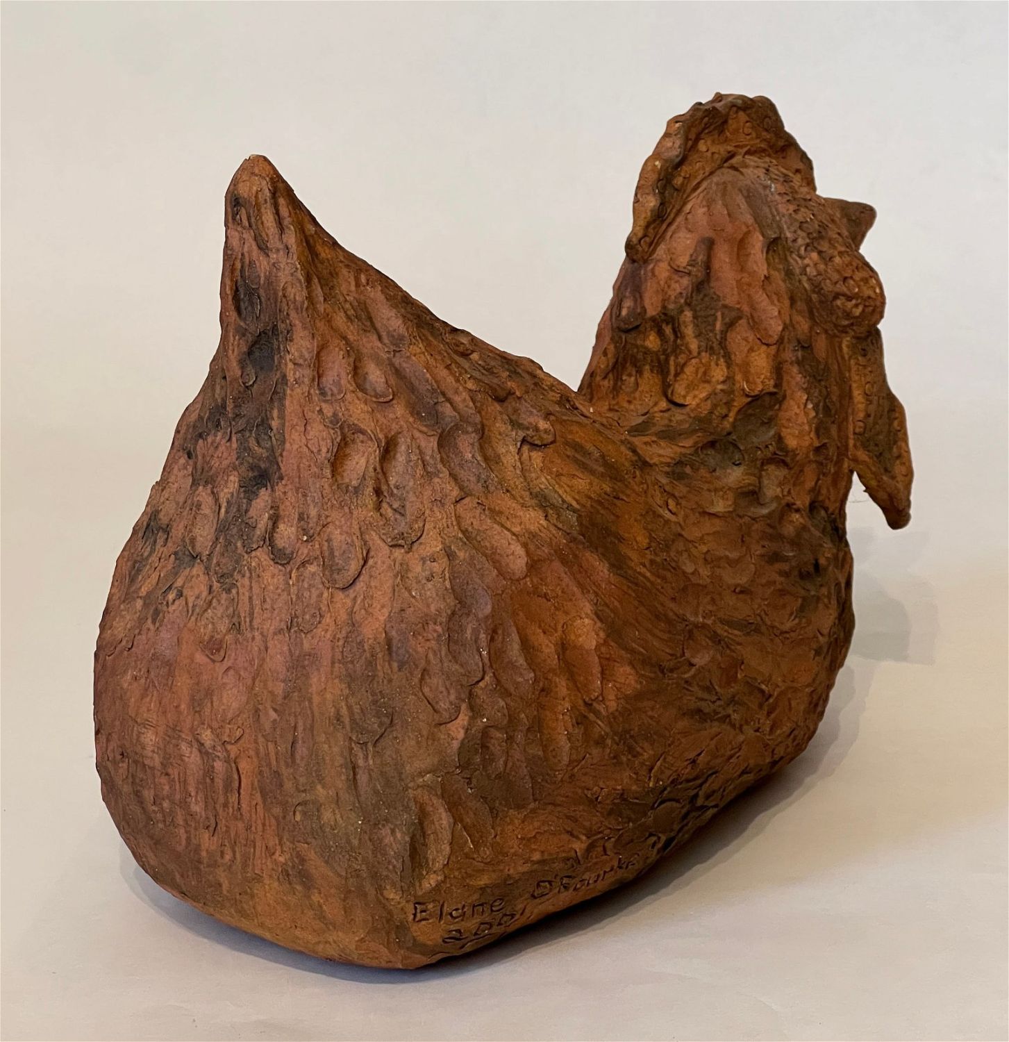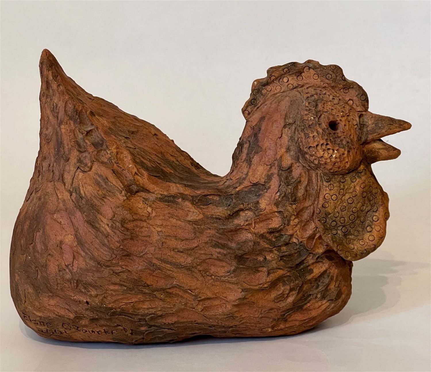 O’Rourke, Elane (1931-2005) untitled red chicken, 2001 ceramic, signed in base, good condition with a small crack in base, size: 8.5 x 11x 6 inches. Lindsborg, KS artist, Elane enjoyed ceramics and was part of a group of people who worked with Max Ebaugh, McPherson, KS. She was an arts supporter and collector.