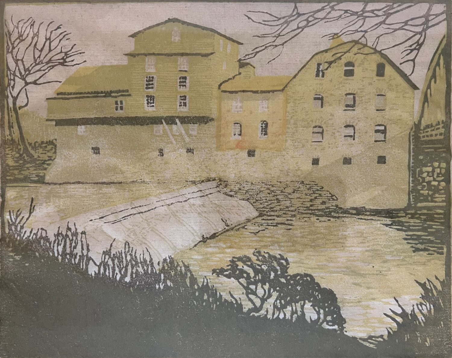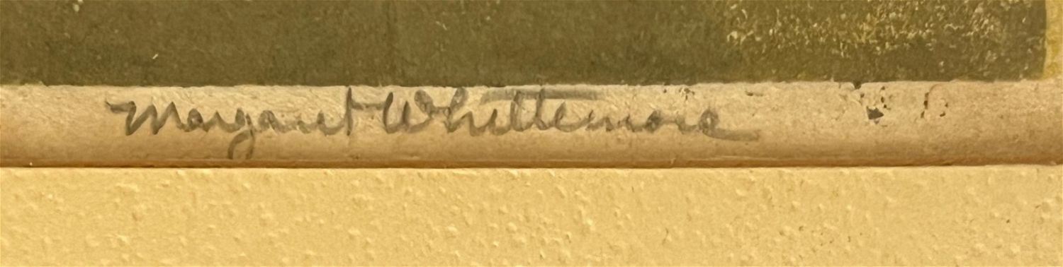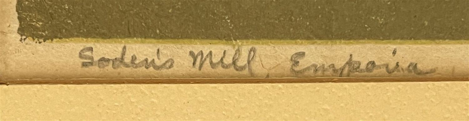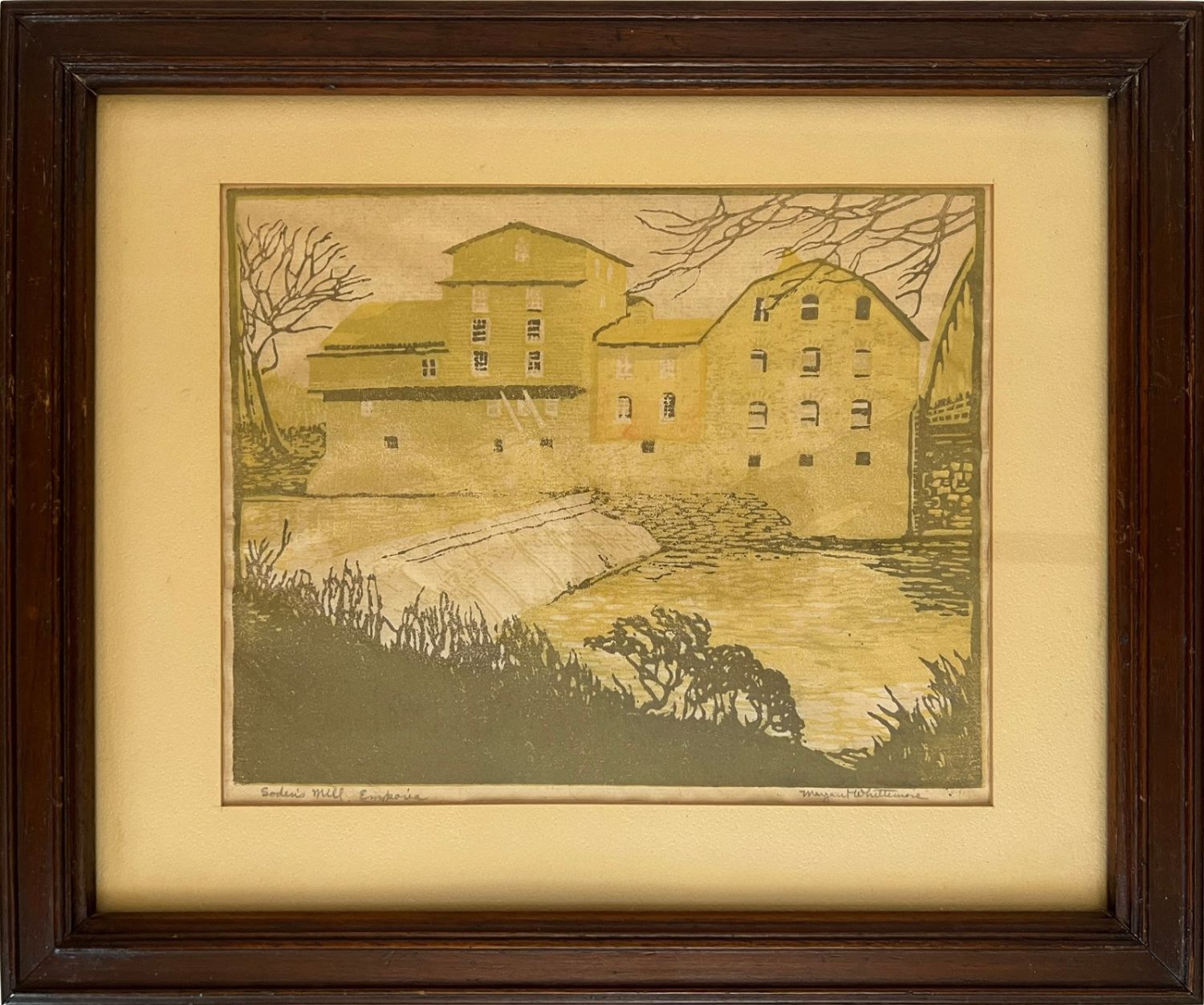 Whittemore, Margaret (1897-1983) "Soden’s Mill, Emporia" woodcut, pencil signed in lower right, fair condition, appears to be faded, image size: 8 x 10 inches. Graphic artist, Margaret Whittemore was born into a family of Washburn College teachers on September 7, 1897, in Topeka, Kansas, growing up there. Her father, Luther D. Whittemore was a professor of Latin and education, and her mother Frances Davis Whittemore was director of the art department. The artist-to-be studied, naturally enough, at Washburn (today a University) from 1915-1919, receiving her degree.From 1920-1923, she studied graphic arts at the School of the Art Institute of Chicago, Illinois. In 1927, she taught art, with Dr. Birger Sanzen, at Bethany College, in Lindsborg, Kansas. From 1928-1935. Whittemore moved from Topeka to Kissimmee, Florida, in 1952, spending a number of years in both Short Hills, New Jersey, and Sarasota, Florida, before choosing Sarasota as her home. She would die there on November 24, 1983.While Whittemore did some work in oil, her primary medium in the expression of Kansas subjects was the graphic arts, wood block prints in particular. Around 1930, magazines and newspapers began publishing her prints of historic landmarks, as well as her earlier birds and trees. She illustrated books by other writers, while also writing and illustrating her own. Sketchbook of Kansas Landmarks, published in 1936, was her first book. It featured drawings and descriptions of historically significant landmarks like the capitol, missions, old trails, homes, bridges and trees. The 1955 Exhibit of Chicago and Midwestern Bookmaking honored Whittemore’s Historic Kansas: A Centenary Sketchbook, 1954. Her One-Way Ticket to Kansas appeared in 1959.An early oil, Santa Fe Poster, was shown at the Kansas City Art Institute in their 1923 exhibition of work by artists of Kansas, Missouri and Oklahoma. Whittemore, during summer study with Birger Sandzen at the Broadmoor Academy, Colorado Springs, painted another oil, Sunrise on Pikes Peak, which was also exhibited at the Institute in the 1924 Midwestern Artists exhibition. Other exhibitions included the Prairie Print Makers, which traveled through Kansas. She won "Best Print by a Kansas Artist" in the 1936 American Block Print exhibition, in Wichita, Kansas.