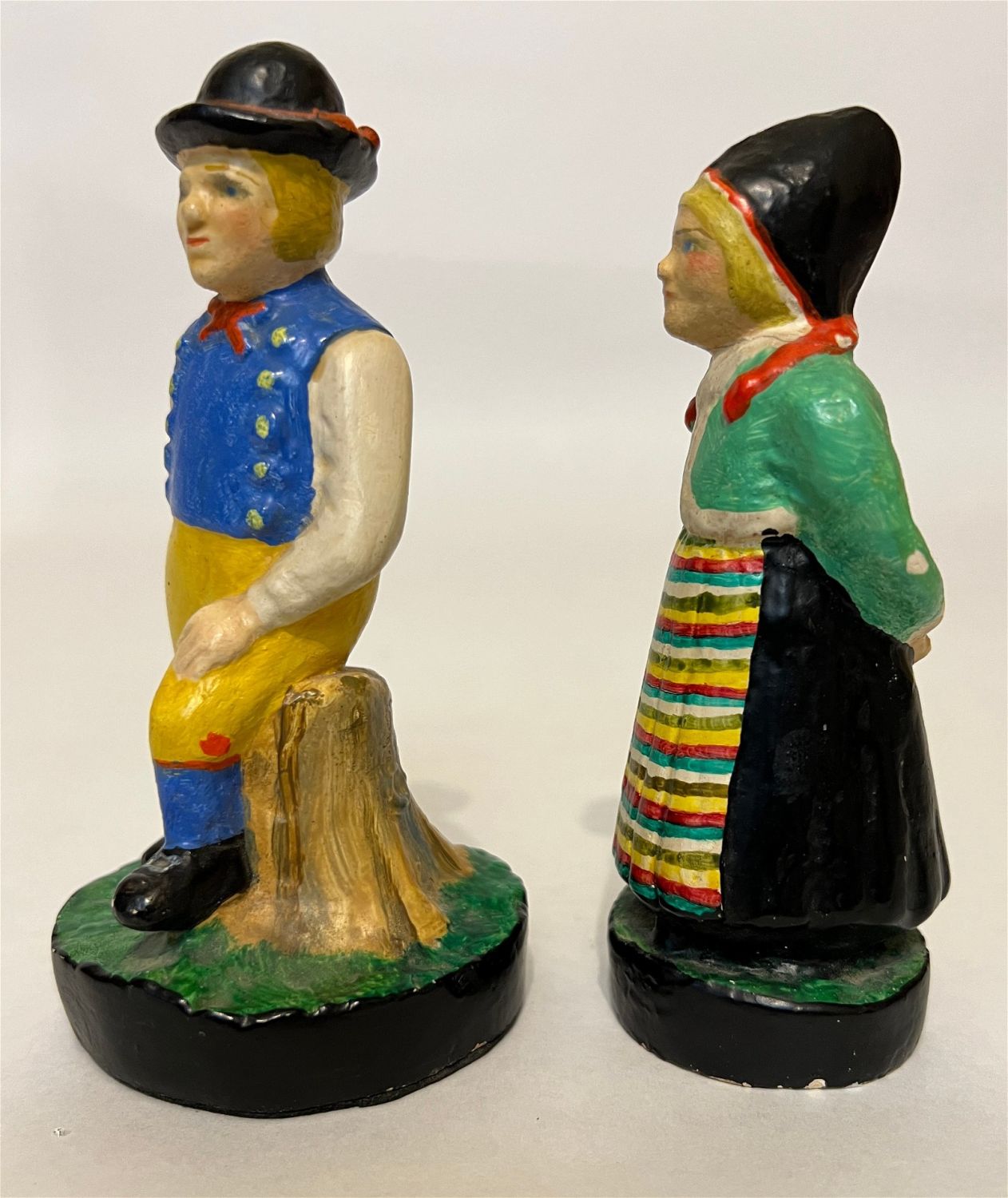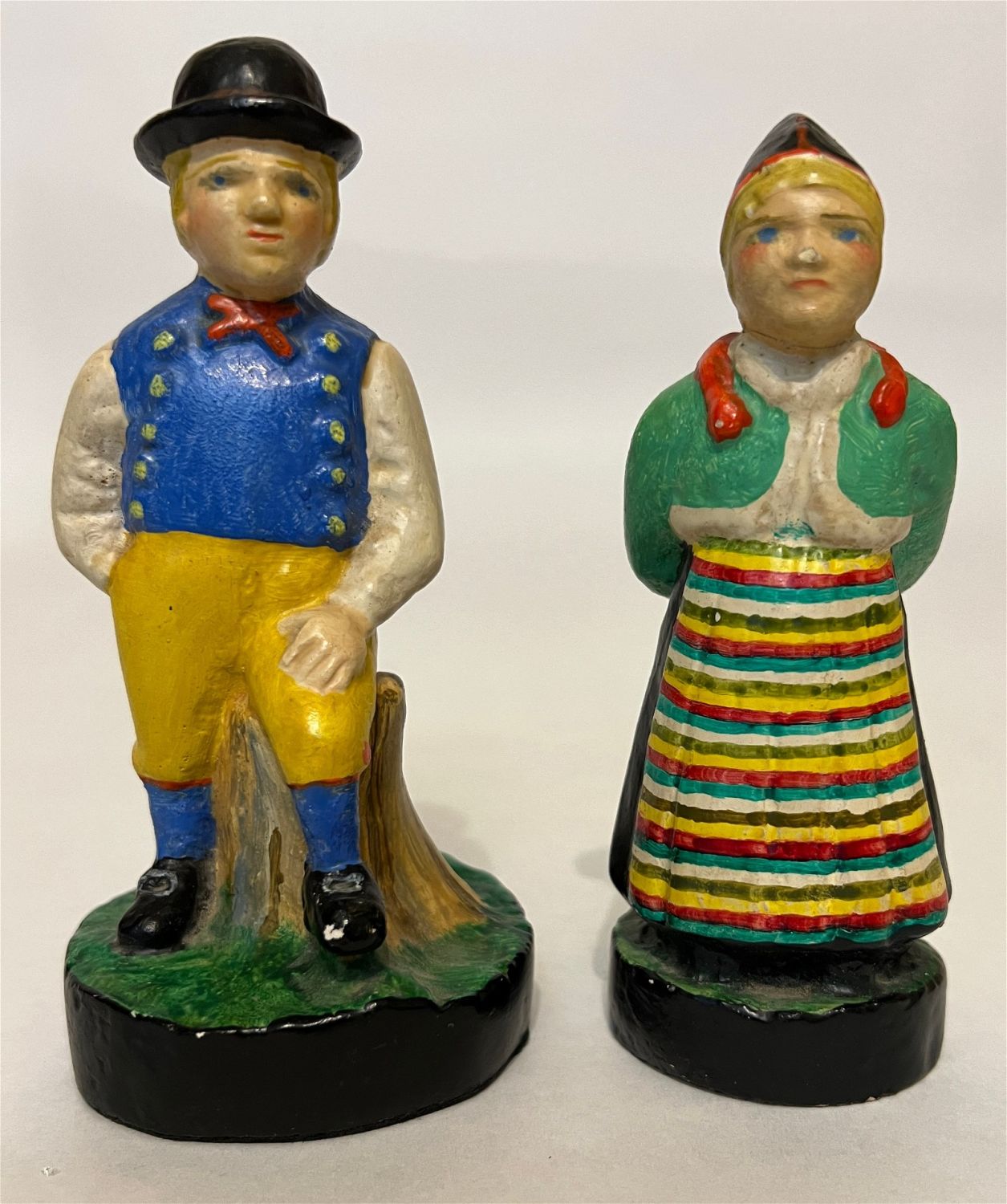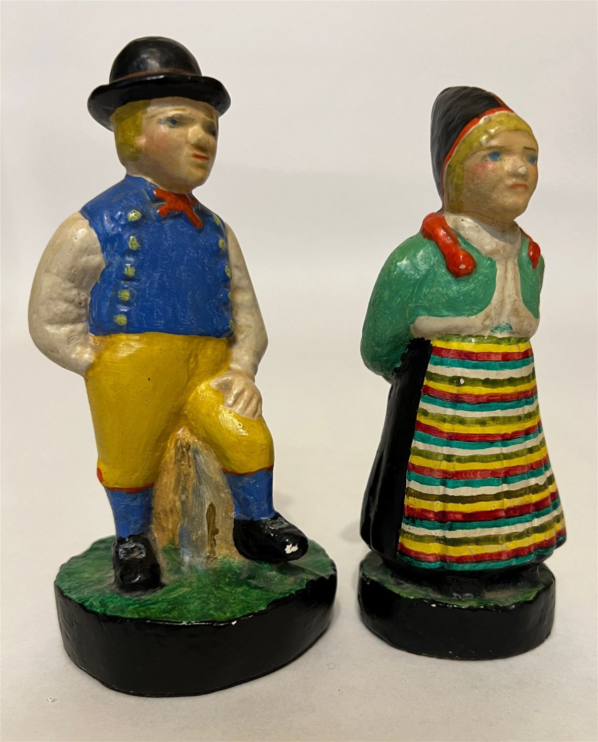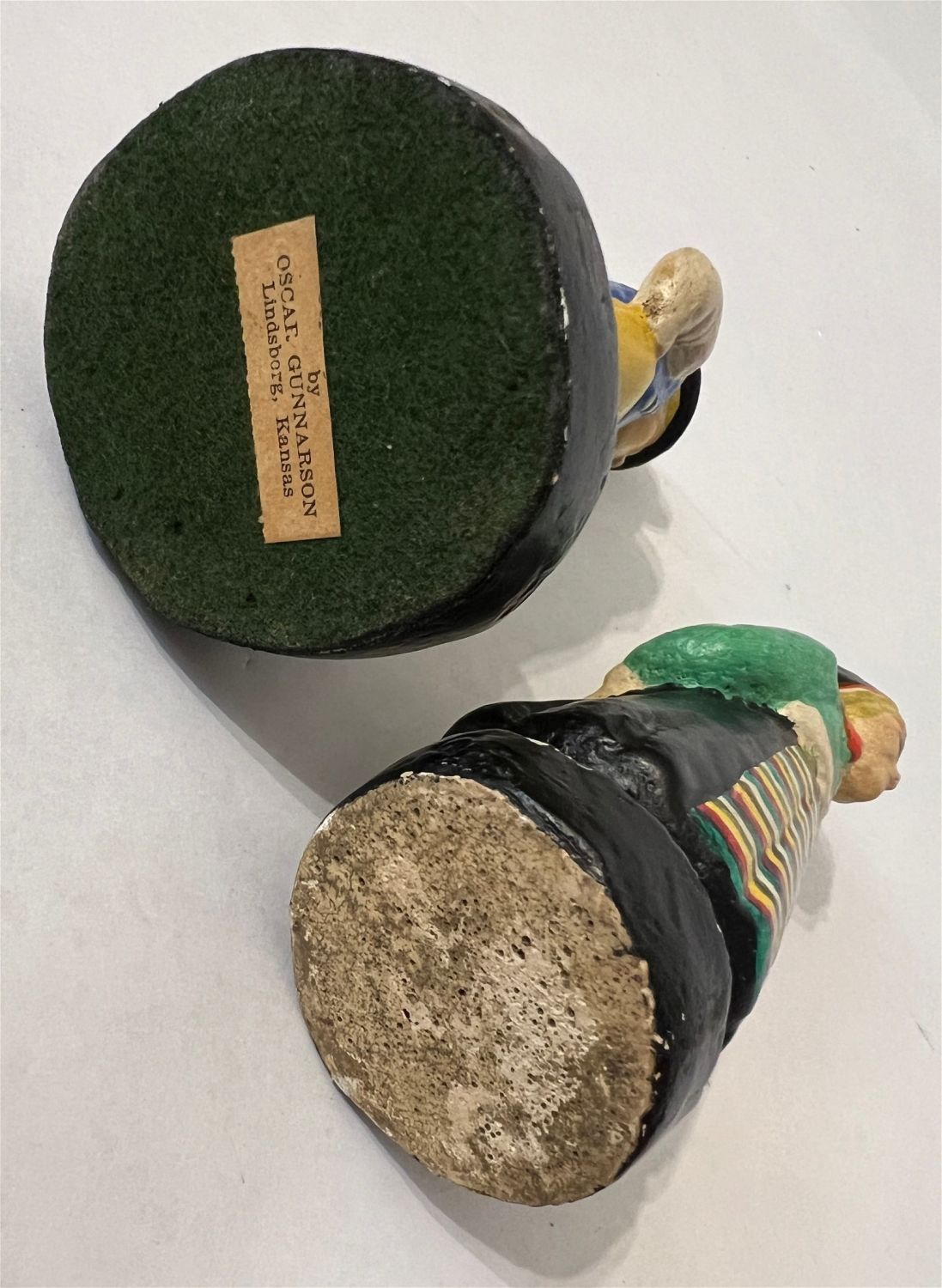 Gunnerson, Oscar (1884-1962) Swedish couple, plaster, signed "O.G. in plaster base on woman, signed O.G. in tree on man, good condition for age, very minor chips in psint, size (pair): 5 x 4 x 2.25 inches . Oscar Gunnarson (1884-1962) was born in Lindsborg, KS on June 17, 1884. His parents came from V?rmland Province in Sweden. Oscar attended the Lindsborg schools and graduated from the Bethany College Commercial Department in 1906.As a young boy, Gunnarson was interested in drawing and painting. Many hours were spent drawing. He also took lessons from Birger Sandz?n, but was largely a self-taught artist. Later, Oscar also developed an interest in sculpture.In the early 1930s Gunnarson began to produce concrete sculpture. A number of local Lindsborg people became the subject of this work. Several of these sculptures are on display at the Old Mill Museum in Lindsborg.Oscar Gunnarson’s landscape oil paintings capture and depict the blowing snow which fills the land of the Smoky Valley. He painted many winter motifs of the farms along the Burma Road (13th Avenue) West of Lindsborg. He captured local farmers milking their cows on cold winter days or their homesteads covered with snow and ice. Birger Sandz?n complimented Oscar for his ability to capture the feeling of blowing snow and for his many scenes of the farms and barns of the Valley. They were friends and shared the art tradition of Lindsborg.Oscar was an active painter until his sudden death in December, 1962. Today his paintings and sculptures are in many homes in the Valley. His wintry scenes in oils depict more than the winter landscape of Kansas as they vibrate with the cold North wind and the bitter cold endured by many who call the Smoky Valley home.