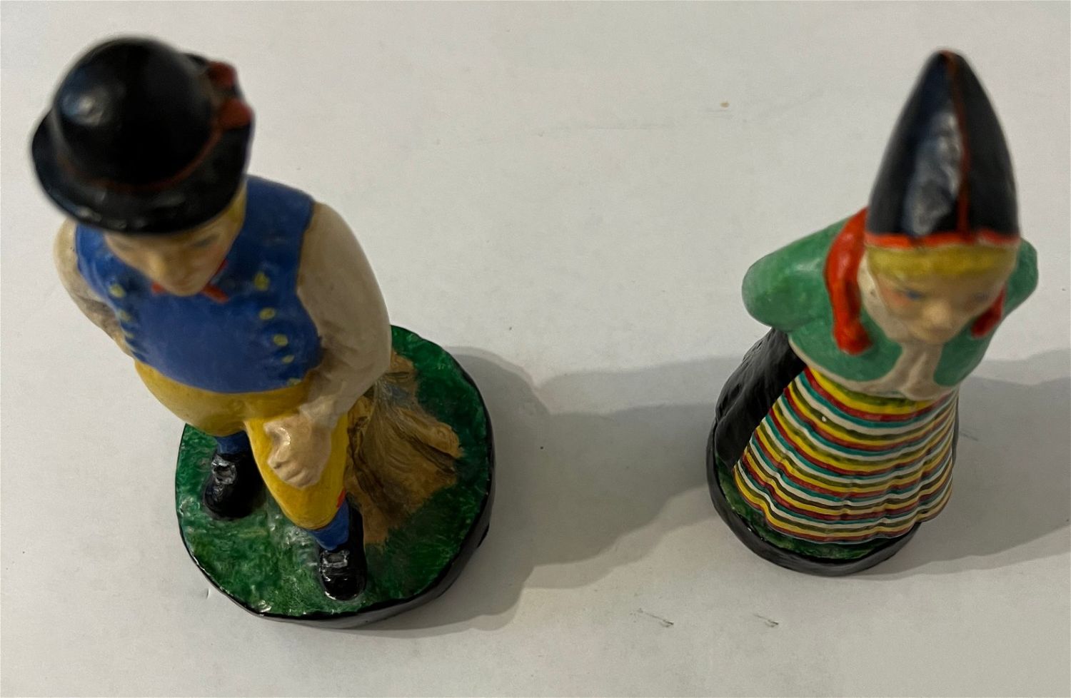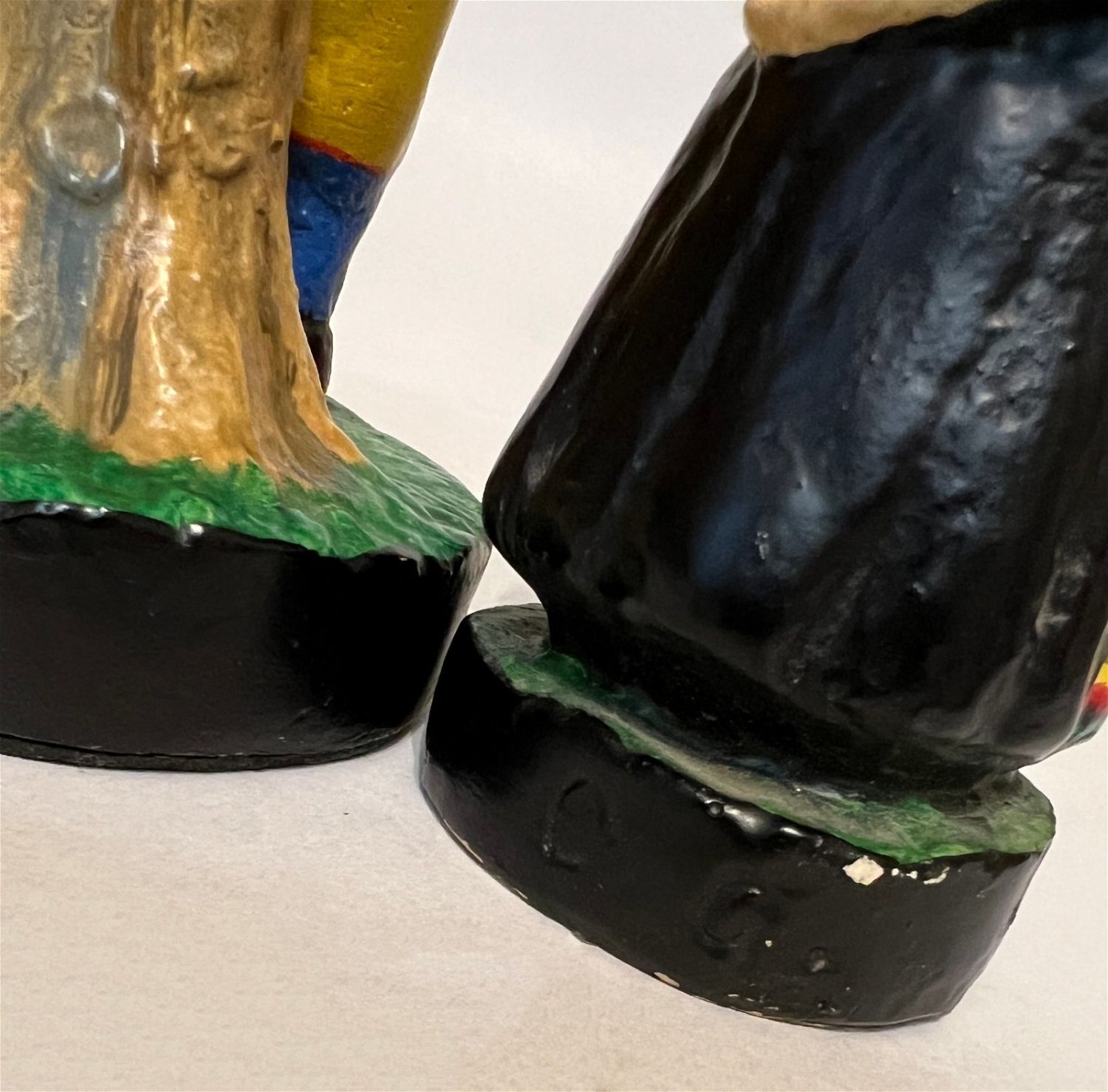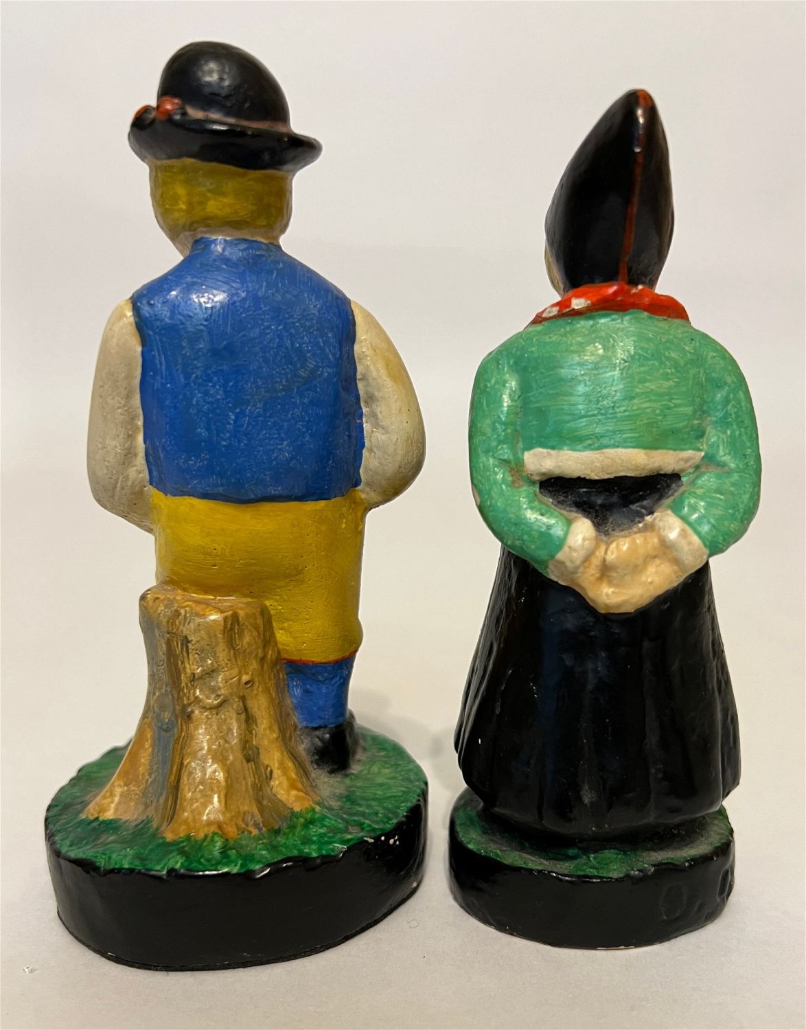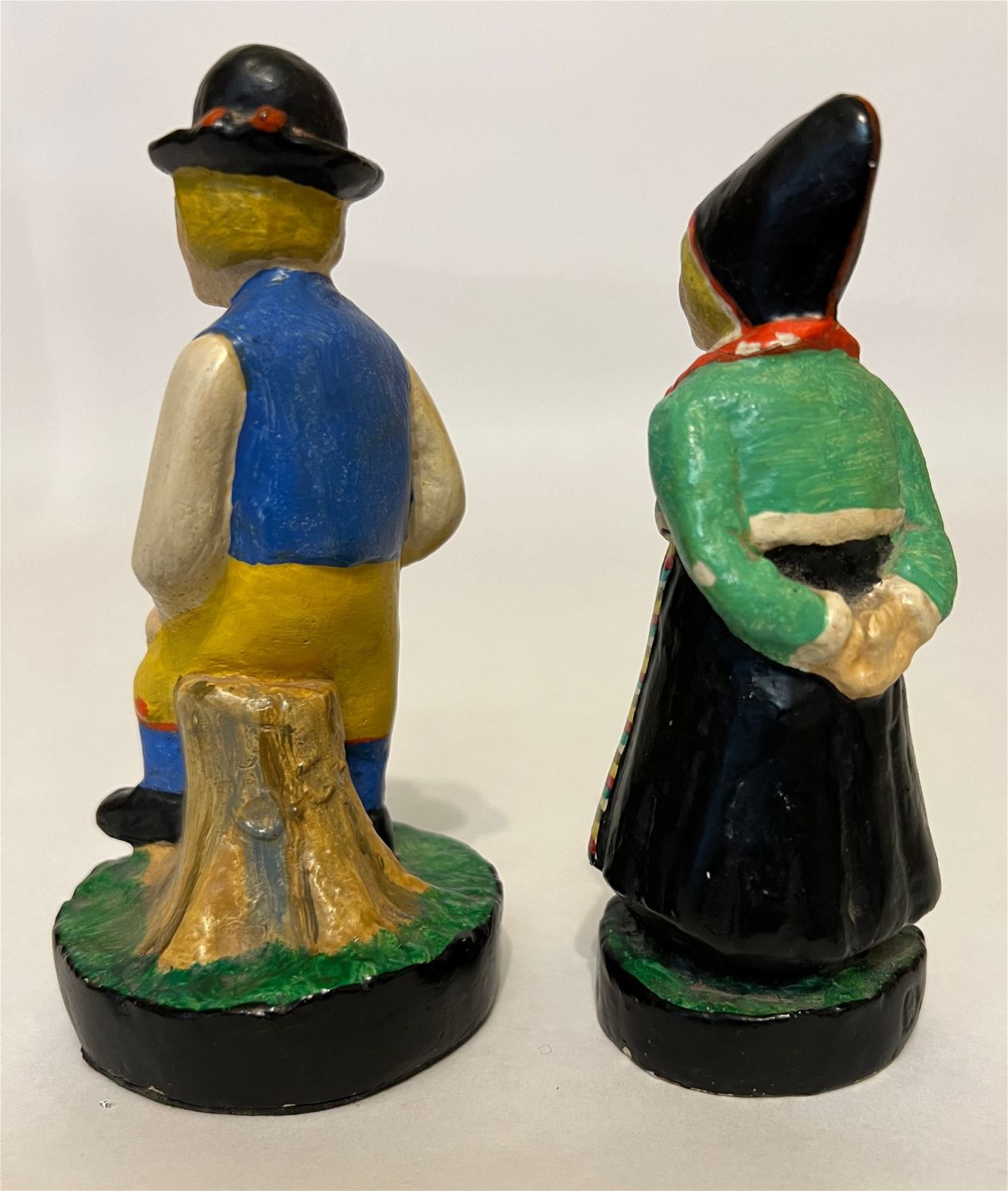 Gunnerson, Oscar (1884-1962) Swedish couple, plaster, signed "O.G. in plaster base on woman, signed O.G. in tree on man, good condition for age, very minor chips in psint, size (pair): 5 x 4 x 2.25 inches . Oscar Gunnarson (1884-1962) was born in Lindsborg, KS on June 17, 1884. His parents came from V?rmland Province in Sweden. Oscar attended the Lindsborg schools and graduated from the Bethany College Commercial Department in 1906.As a young boy, Gunnarson was interested in drawing and painting. Many hours were spent drawing. He also took lessons from Birger Sandz?n, but was largely a self-taught artist. Later, Oscar also developed an interest in sculpture.In the early 1930s Gunnarson began to produce concrete sculpture. A number of local Lindsborg people became the subject of this work. Several of these sculptures are on display at the Old Mill Museum in Lindsborg.Oscar Gunnarson’s landscape oil paintings capture and depict the blowing snow which fills the land of the Smoky Valley. He painted many winter motifs of the farms along the Burma Road (13th Avenue) West of Lindsborg. He captured local farmers milking their cows on cold winter days or their homesteads covered with snow and ice. Birger Sandz?n complimented Oscar for his ability to capture the feeling of blowing snow and for his many scenes of the farms and barns of the Valley. They were friends and shared the art tradition of Lindsborg.Oscar was an active painter until his sudden death in December, 1962. Today his paintings and sculptures are in many homes in the Valley. His wintry scenes in oils depict more than the winter landscape of Kansas as they vibrate with the cold North wind and the bitter cold endured by many who call the Smoky Valley home.