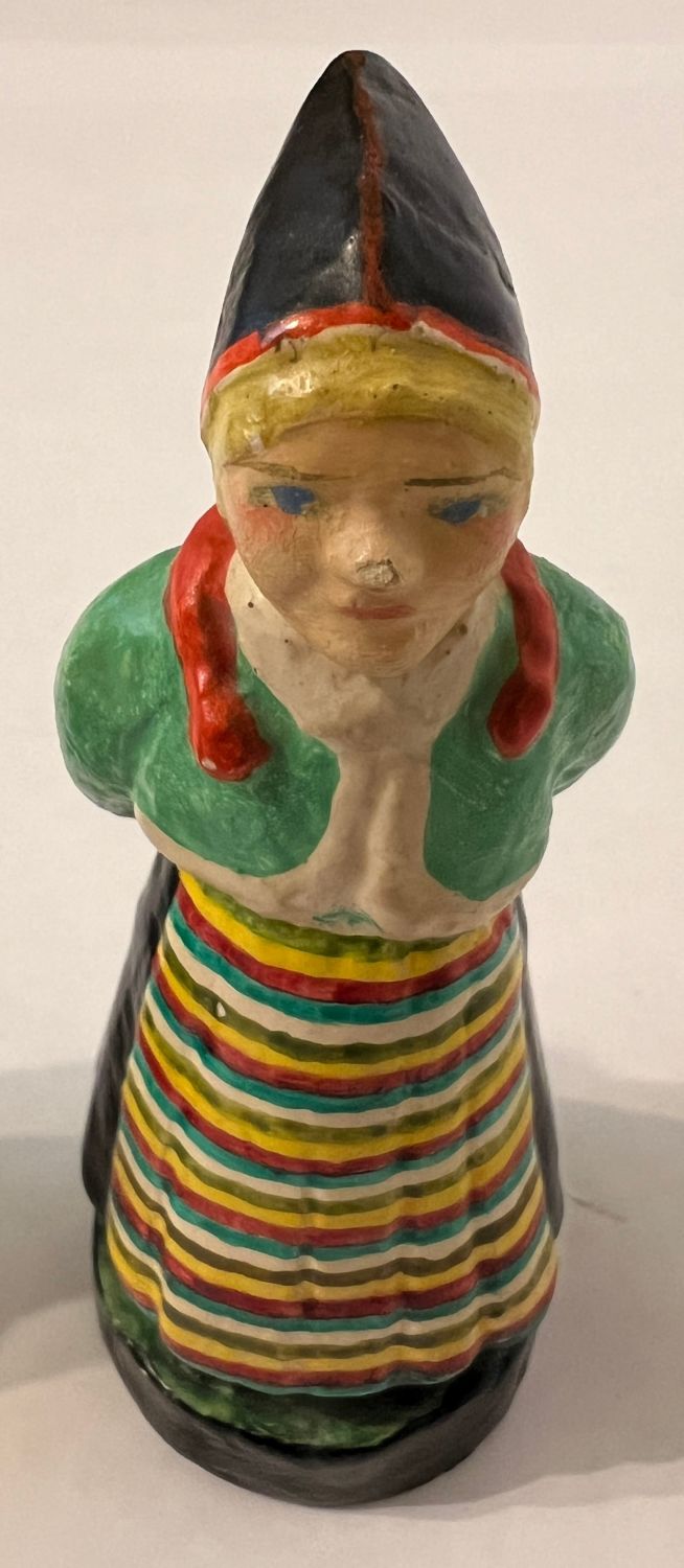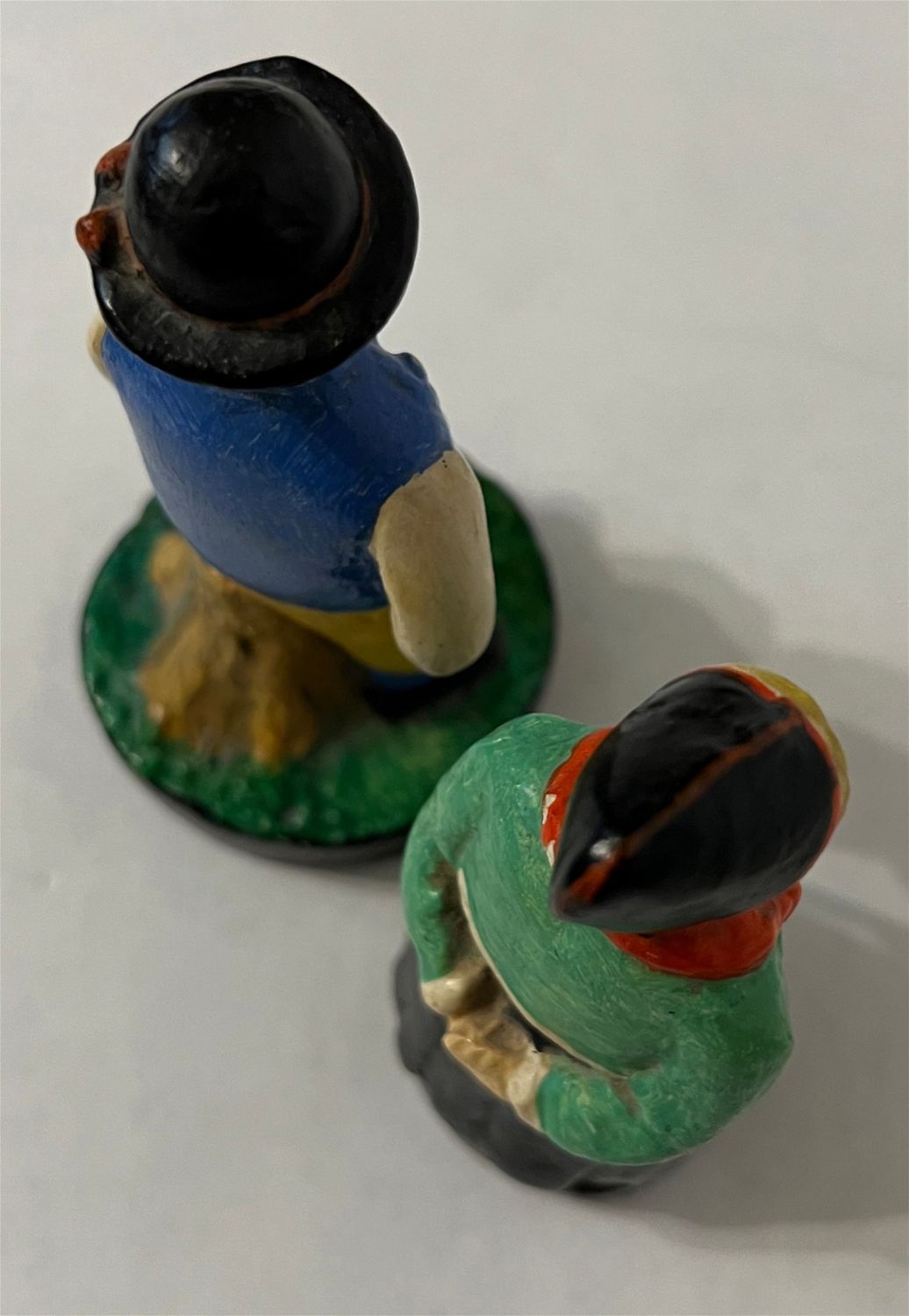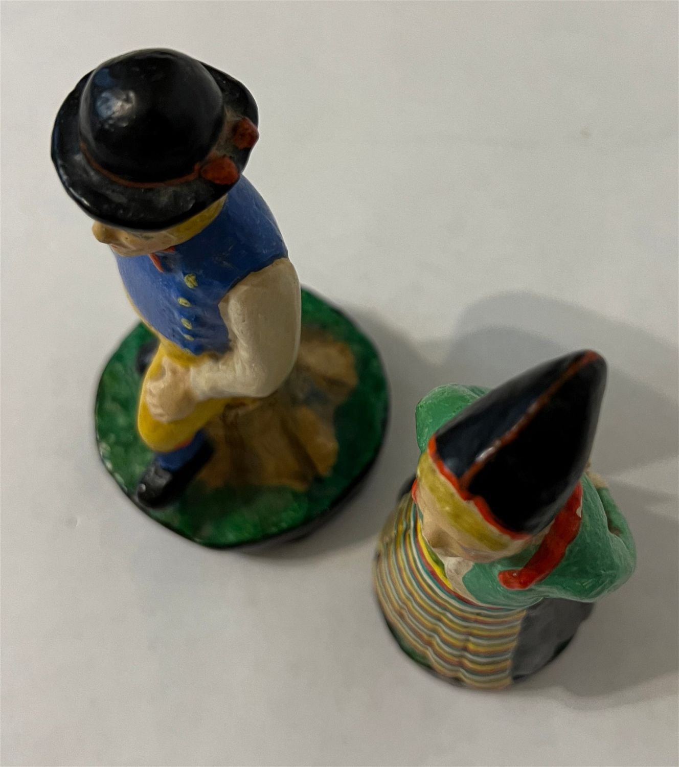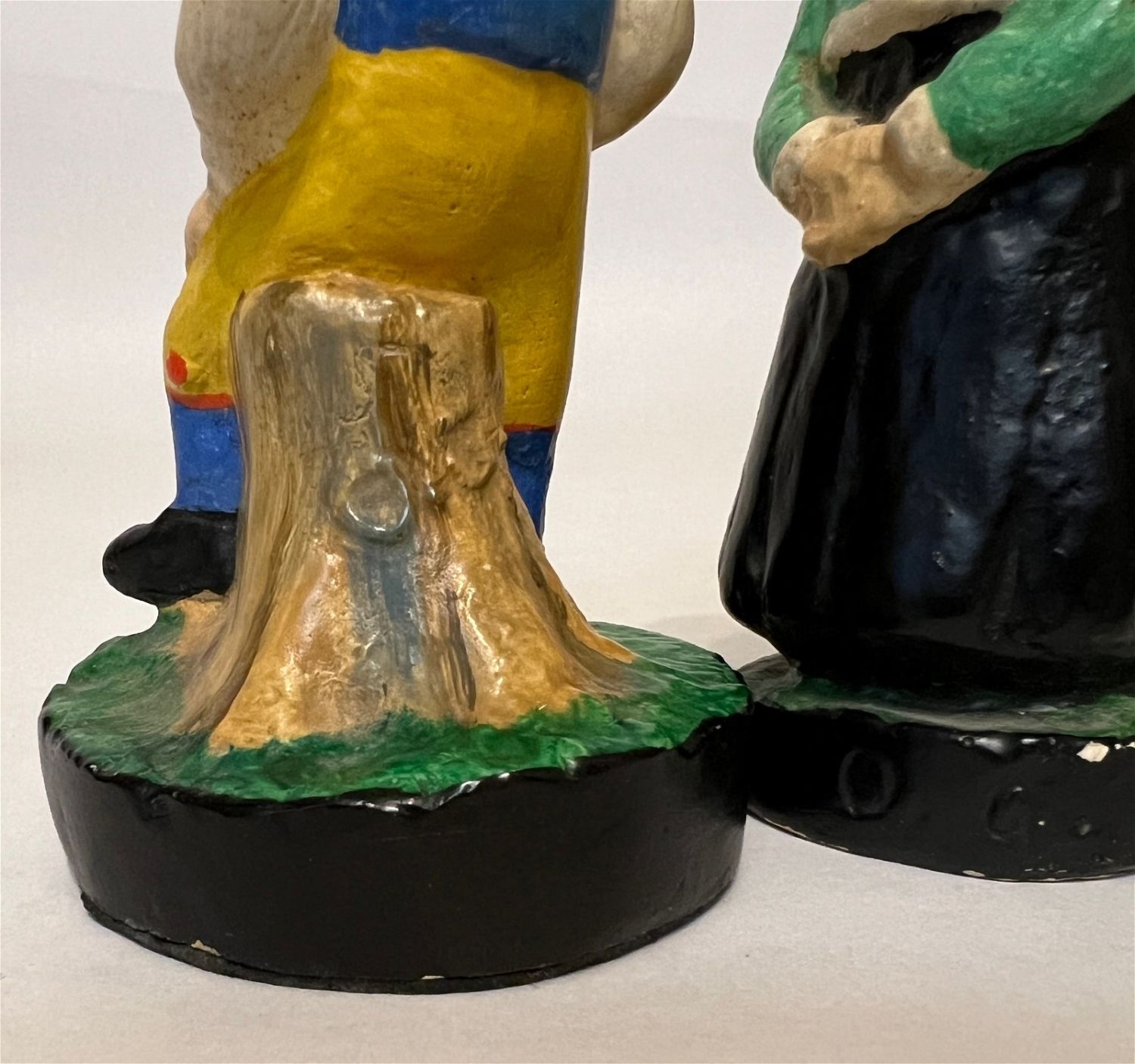 Gunnerson, Oscar (1884-1962) Swedish couple, plaster, signed "O.G. in plaster base on woman, signed O.G. in tree on man, good condition for age, very minor chips in psint, size (pair): 5 x 4 x 2.25 inches . Oscar Gunnarson (1884-1962) was born in Lindsborg, KS on June 17, 1884. His parents came from V?rmland Province in Sweden. Oscar attended the Lindsborg schools and graduated from the Bethany College Commercial Department in 1906.As a young boy, Gunnarson was interested in drawing and painting. Many hours were spent drawing. He also took lessons from Birger Sandz?n, but was largely a self-taught artist. Later, Oscar also developed an interest in sculpture.In the early 1930s Gunnarson began to produce concrete sculpture. A number of local Lindsborg people became the subject of this work. Several of these sculptures are on display at the Old Mill Museum in Lindsborg.Oscar Gunnarson’s landscape oil paintings capture and depict the blowing snow which fills the land of the Smoky Valley. He painted many winter motifs of the farms along the Burma Road (13th Avenue) West of Lindsborg. He captured local farmers milking their cows on cold winter days or their homesteads covered with snow and ice. Birger Sandz?n complimented Oscar for his ability to capture the feeling of blowing snow and for his many scenes of the farms and barns of the Valley. They were friends and shared the art tradition of Lindsborg.Oscar was an active painter until his sudden death in December, 1962. Today his paintings and sculptures are in many homes in the Valley. His wintry scenes in oils depict more than the winter landscape of Kansas as they vibrate with the cold North wind and the bitter cold endured by many who call the Smoky Valley home.