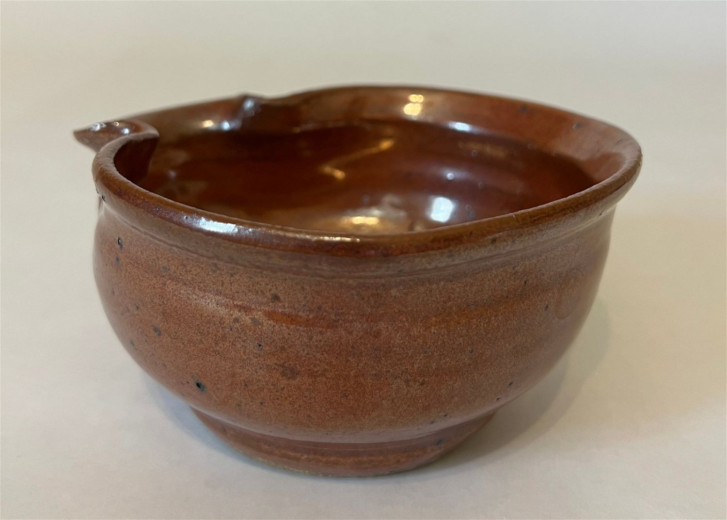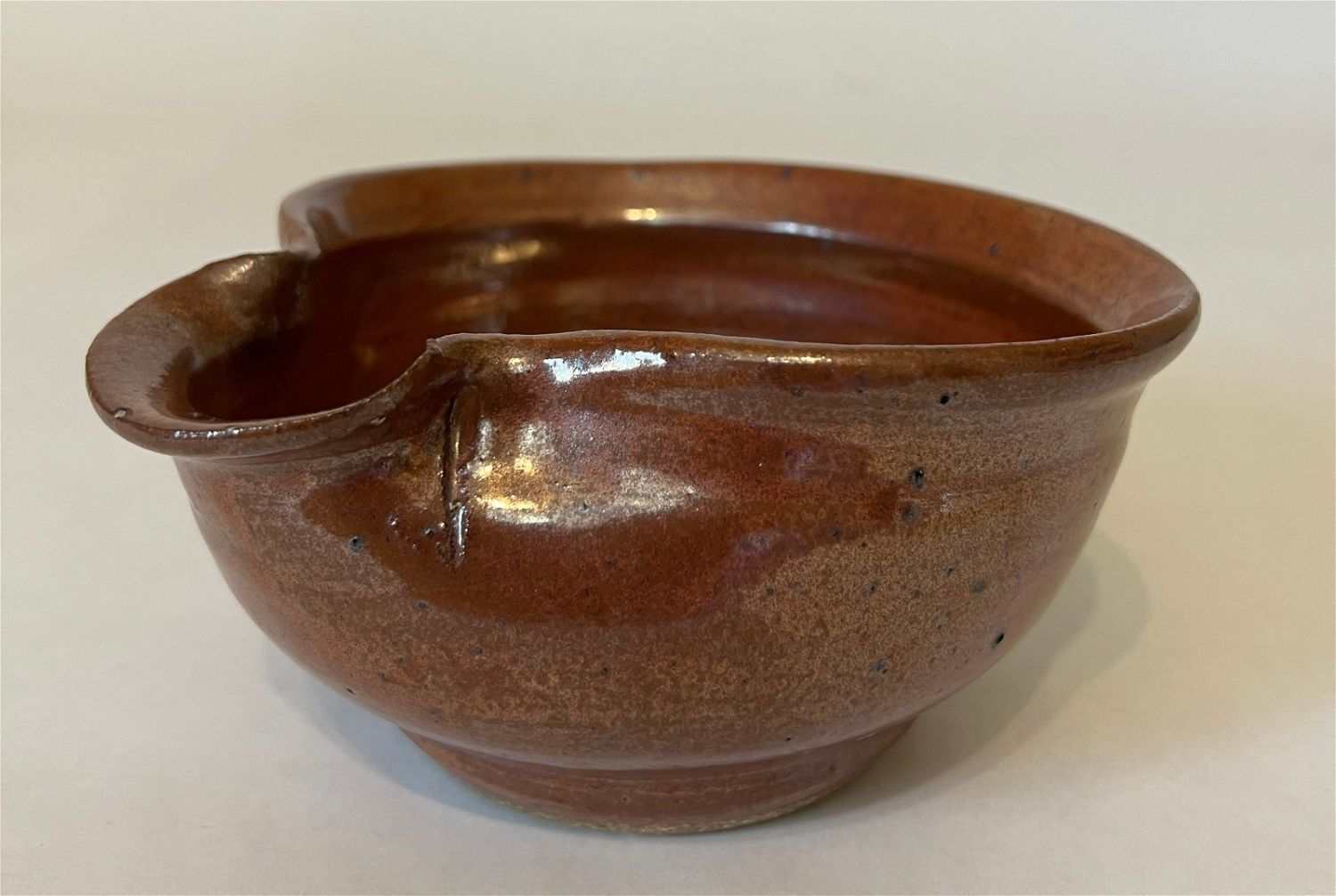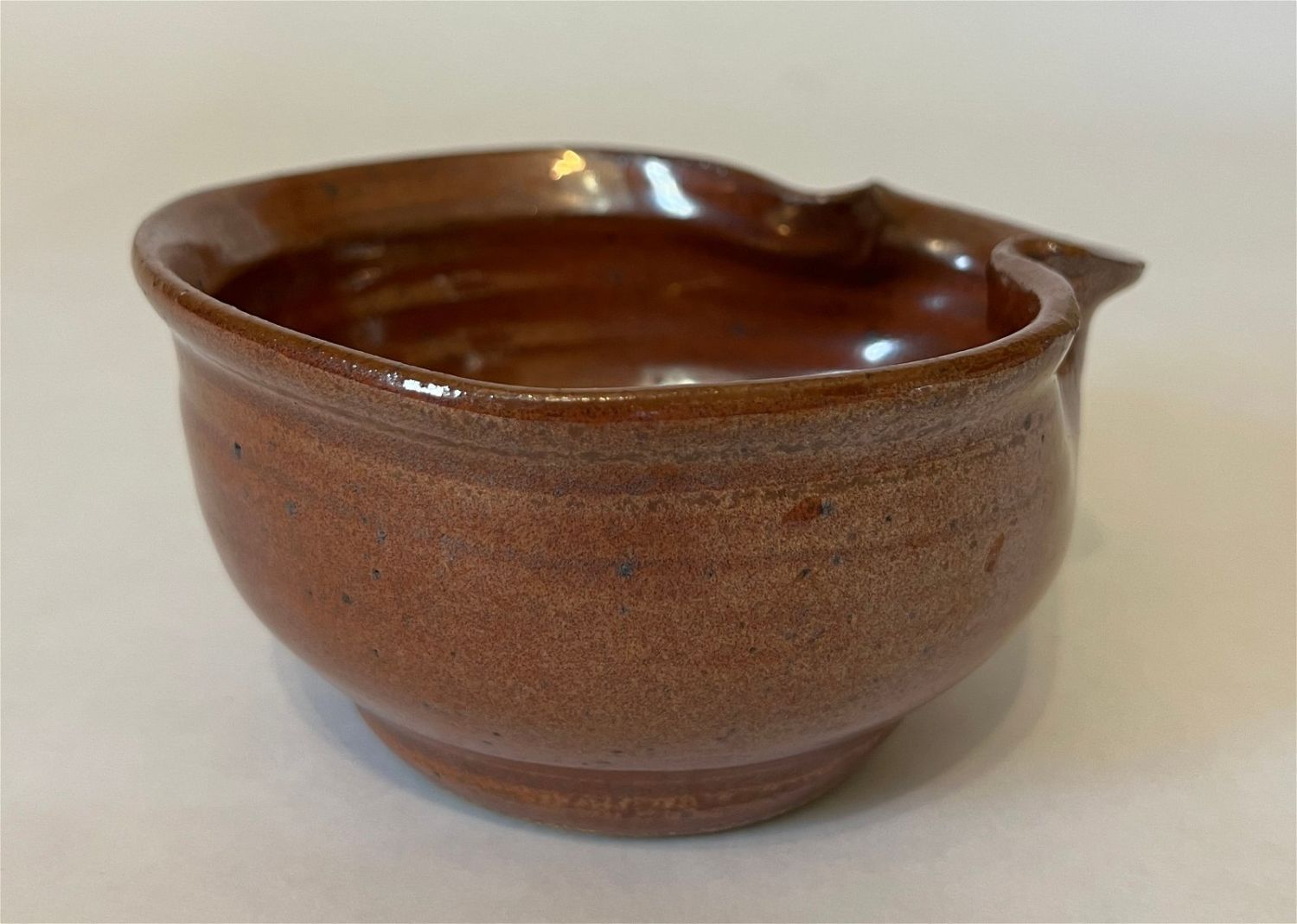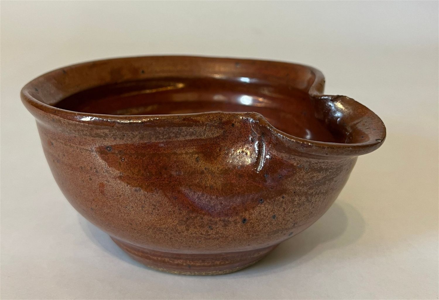 Kahmeyer, Ray (1930-2007) brown batter bowl, stoneware, Kahmeyer stamp on bottom, good condition, no chips or cracks, size: 3 x 6 x 6.5 inches. Ray Kaymeyer was a graduate of Kansas State University with a BFA and MFA. He also attended Alfred University in New York. He was a Professor of Art, teaching ceramics, at Bethany College, Lindsborg, KS. He also served as department head, retiring as the Mary J. Mingen back Distinguished Professor of Art.Kaymeyer belonged to the Kansas Craftsman Assoc. National Council on Education for the Ceramic Arts and American Craftsman Council. Ray Kahmeyer (1930-2007) was born on September 10, 1930, in Nashville, Kansas. Kahmeyer taught ceramics for 25 years at Bethany College (1967-92), heading the art department after his first two years and then earning the endowed position of the Mary J. Mingenback Distinguished Professor of Art in 1973.Kahmeyer graduated from Pratt High School in 1948, and for some years worked as a butcher and did renovation projects for homes in the Pratt and Great Bend area along with woodworking with his father. After a stint in the US Navy during the Korean War, Ray returned home and decided to use the G.I. Bill and his construction skills to become an architect.Settling in Manhattan at Kansas State University, Kahmeyer discovered his life work by chance, taking a ceramics course as an art elective and immediately ?got bit? by the clay bug, as his sister Joy Davis described in 2016. Kahmeyer earned both his bachelor?s degree and Master of Arts from K-State, finishing a thesis on the raku method of ceramic firing and glazing to graduate in 1967. The bulk of Kahmeyer?s work is wheel-thrown, high-fired stoneware, suitable for domestic use.His friendships with important American ceramists Warren MacKenzie (1924- 2018) and Paul Soldner (1921-2011), with their own crucial influences of England?s Bernard Leach (1887-1979) and Japan?s Shoji Hamada (1894- 1978), continued to inform his work in functional pottery throughout his career.Kahmeyer exhibited his pots widely throughout his career, showing in a variety of regional exhibitions each year and occasionally sending work further afield to other states across the country. He earned numerous purchase awards and his work appears in a host of museum and private collections. The professor was also invited often to other colleges and high schools to present lectures, demonstrations, and workshops.Kahmeyer taught ceramics at Bethany for two and a half decades, imparting hard science lessons in the chemistry of glaze mixing and the physics of materials under forces of motion and heat, but gave all his students much more than a typical college education. The ceramics professor retired in 1992 but continued to work in his home studio ? a re-constructed chicken barn rebuilt with salvaged materials, including a plethora of old windows that provided good lighting.Kahmeyer and a few other Lindsborg artists began inviting people in to view and purchase work, inadvertently establishing the annual Artist Studio Open House that continues today.