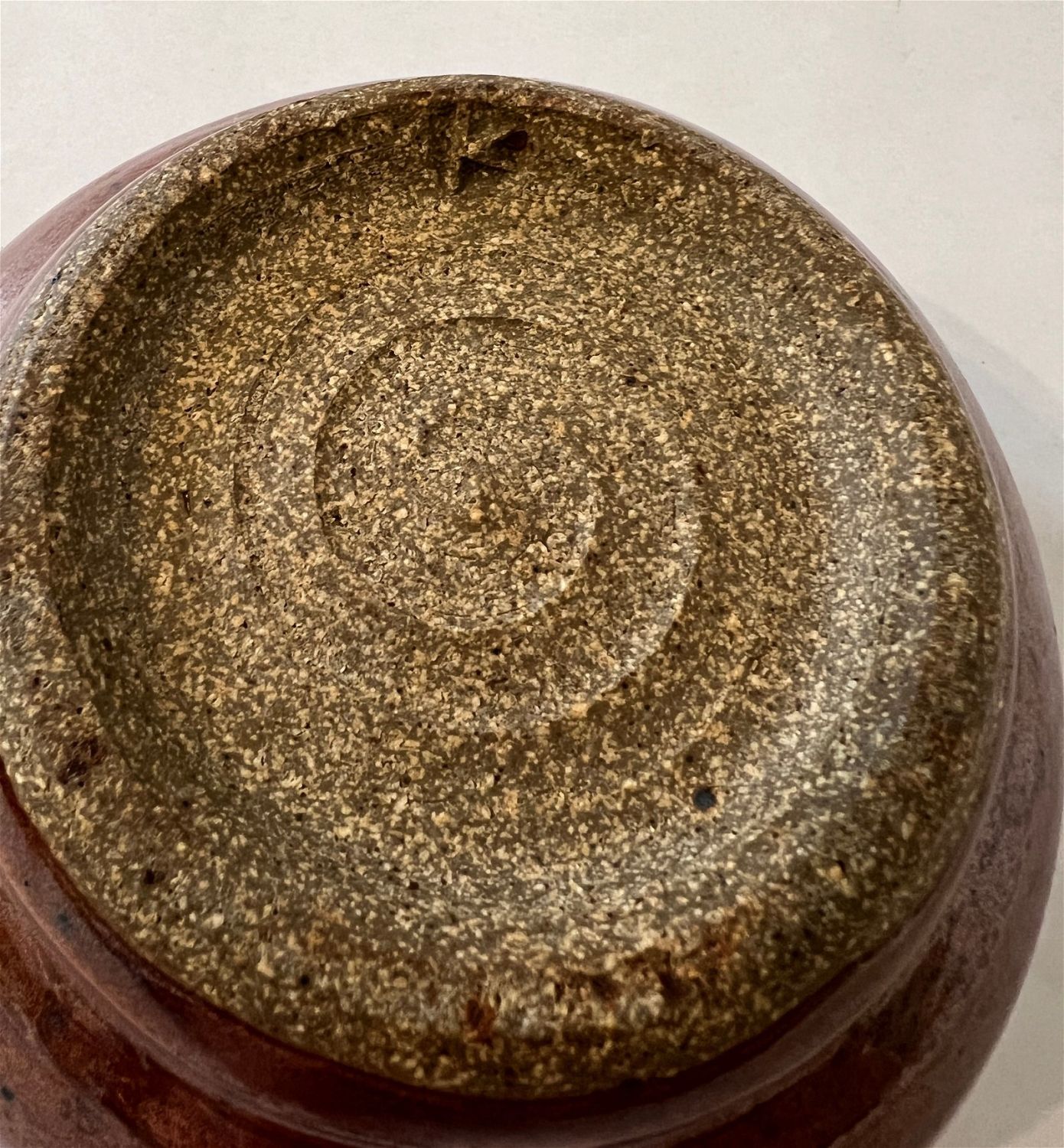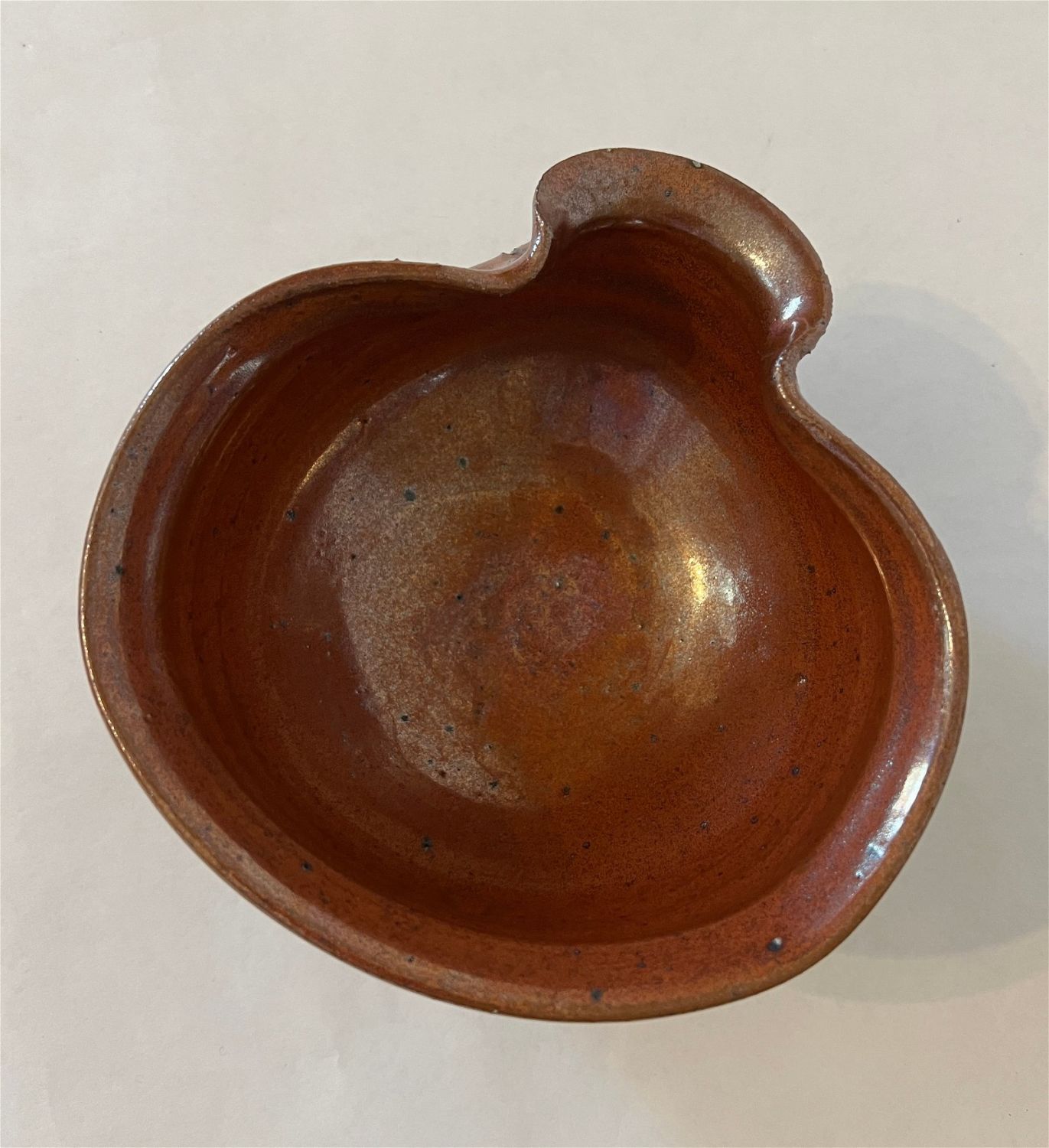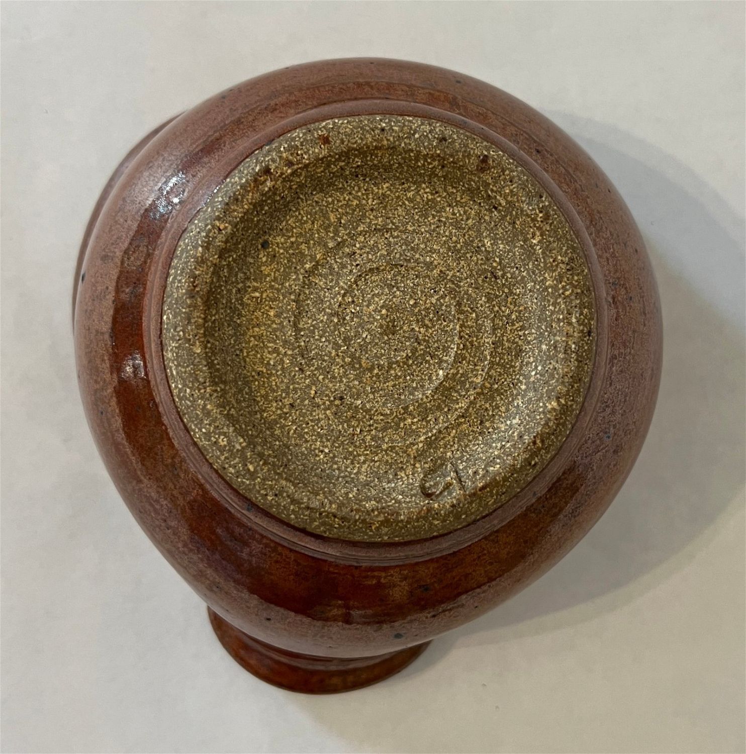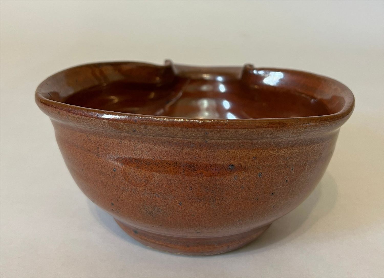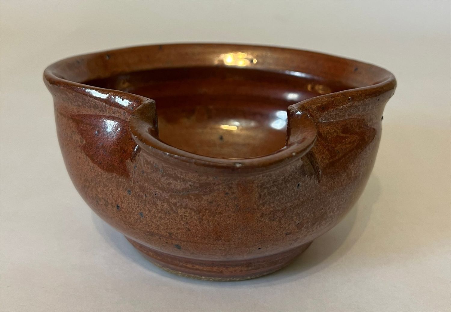Kahmeyer, Ray (1930-2007) brown batter bowl, stoneware, Kahmeyer stamp on bottom, good condition, no chips or cracks, size: 3 x 6 x 6.5 inches. Ray Kaymeyer was a graduate of Kansas State University with a BFA and MFA. He also attended Alfred University in New York. He was a Professor of Art, teaching ceramics, at Bethany College, Lindsborg, KS. He also served as department head, retiring as the Mary J. Mingen back Distinguished Professor of Art.Kaymeyer belonged to the Kansas Craftsman Assoc. National Council on Education for the Ceramic Arts and American Craftsman Council. Ray Kahmeyer (1930-2007) was born on September 10, 1930, in Nashville, Kansas. Kahmeyer taught ceramics for 25 years at Bethany College (1967-92), heading the art department after his first two years and then earning the endowed position of the Mary J. Mingenback Distinguished Professor of Art in 1973.Kahmeyer graduated from Pratt High School in 1948, and for some years worked as a butcher and did renovation projects for homes in the Pratt and Great Bend area along with woodworking with his father. After a stint in the US Navy during the Korean War, Ray returned home and decided to use the G.I. Bill and his construction skills to become an architect.Settling in Manhattan at Kansas State University, Kahmeyer discovered his life work by chance, taking a ceramics course as an art elective and immediately ?got bit? by the clay bug, as his sister Joy Davis described in 2016. Kahmeyer earned both his bachelor?s degree and Master of Arts from K-State, finishing a thesis on the raku method of ceramic firing and glazing to graduate in 1967. The bulk of Kahmeyer?s work is wheel-thrown, high-fired stoneware, suitable for domestic use.His friendships with important American ceramists Warren MacKenzie (1924- 2018) and Paul Soldner (1921-2011), with their own crucial influences of England?s Bernard Leach (1887-1979) and Japan?s Shoji Hamada (1894- 1978), continued to inform his work in functional pottery throughout his career.Kahmeyer exhibited his pots widely throughout his career, showing in a variety of regional exhibitions each year and occasionally sending work further afield to other states across the country. He earned numerous purchase awards and his work appears in a host of museum and private collections. The professor was also invited often to other colleges and high schools to present lectures, demonstrations, and workshops.Kahmeyer taught ceramics at Bethany for two and a half decades, imparting hard science lessons in the chemistry of glaze mixing and the physics of materials under forces of motion and heat, but gave all his students much more than a typical college education. The ceramics professor retired in 1992 but continued to work in his home studio ? a re-constructed chicken barn rebuilt with salvaged materials, including a plethora of old windows that provided good lighting.Kahmeyer and a few other Lindsborg artists began inviting people in to view and purchase work, inadvertently establishing the annual Artist Studio Open House that continues today.