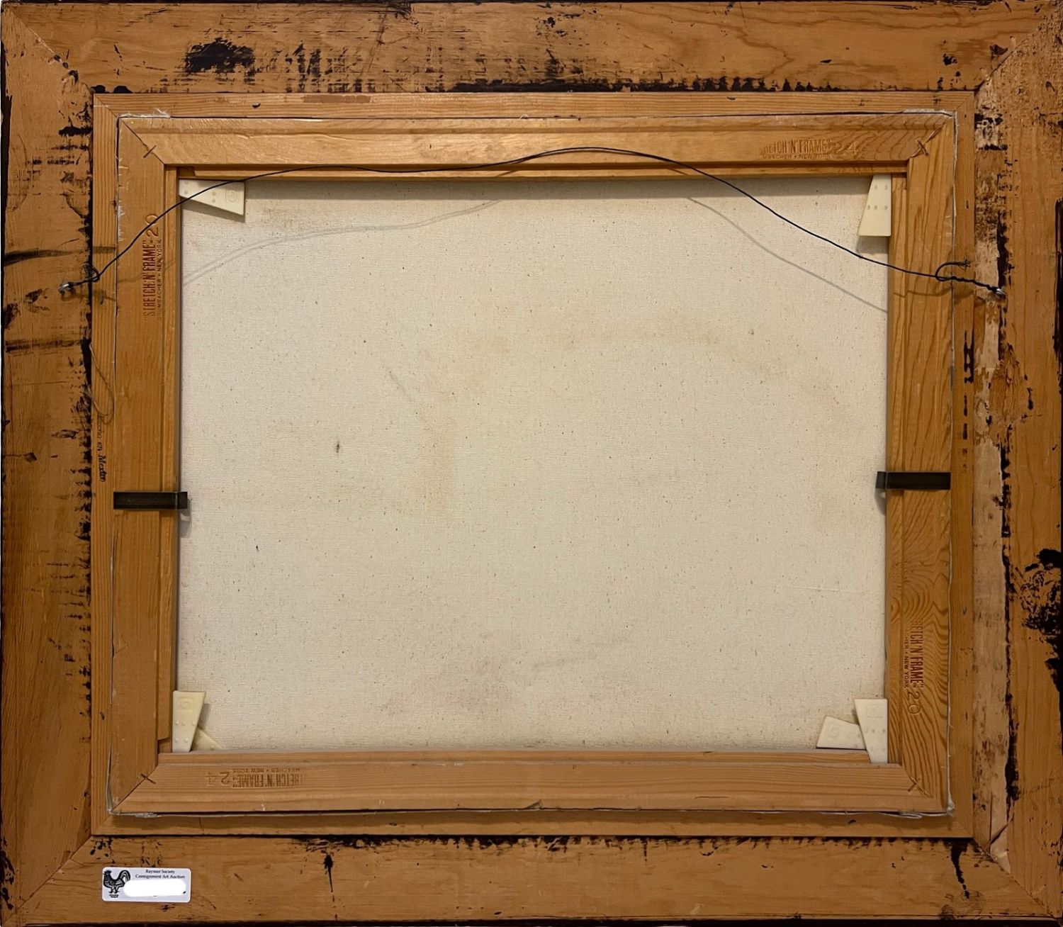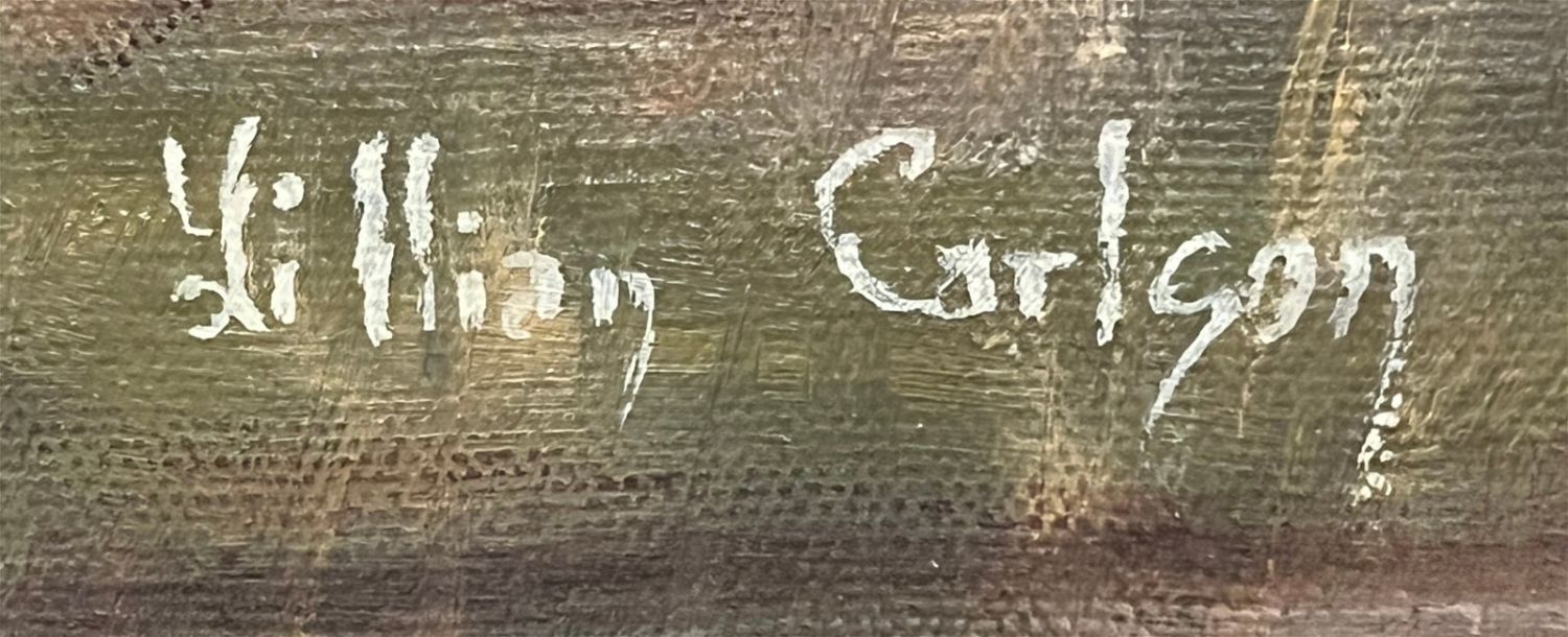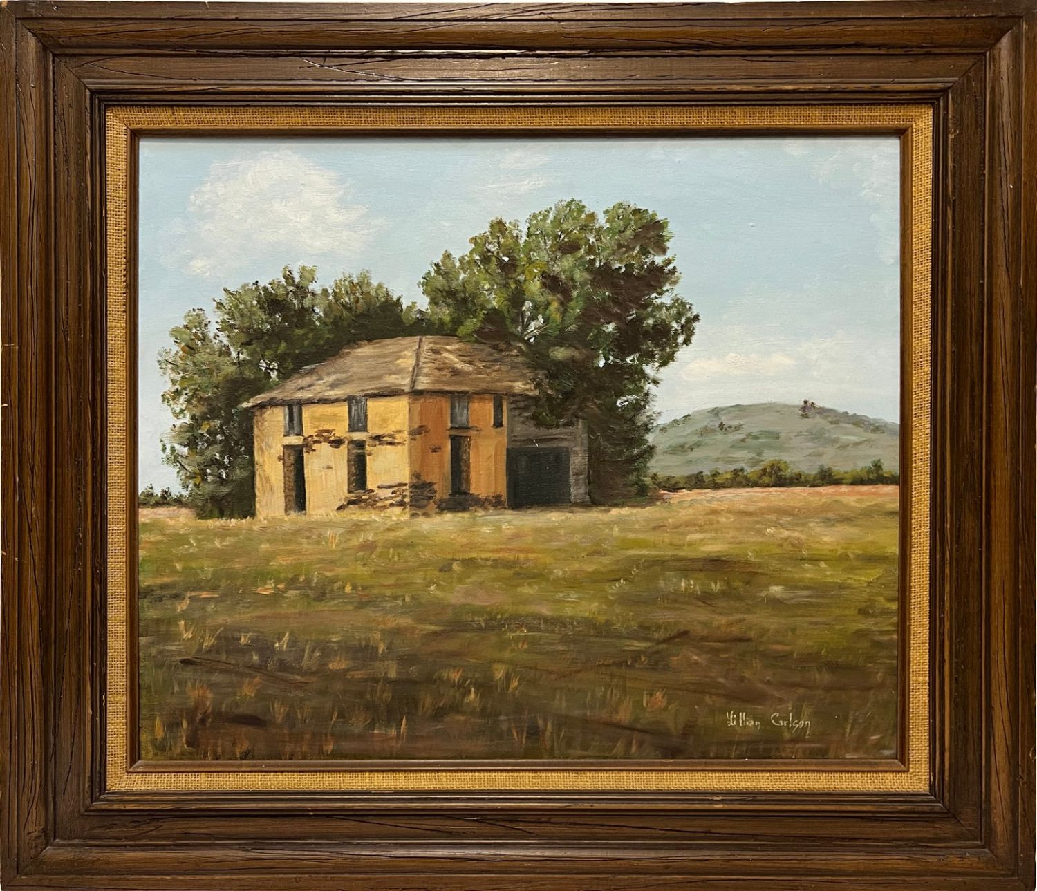 Carlson, Lillian, untitled stone house, Coronado Heights on right, acrylic on canvas, signed inl ower right, good condition, canvas size: 20 x 4 inches. Lillian Carlson (1910-2003) was a familiar face in McPherson?s Arts and Crafts community in the 1970s and 1980s. Lillian was born in 1910 on the Carlson homestead just Southwest of McPherson. She was a missionary in China and India for 25 years. After returning to McPherson in 1973 to care for her mother, she took up painting. In 1982 she was the recipient of the Citations of Merit award by the Board of Trustees of McPherson College. Lillian had a special talent for putting on canvas the beauty of the quiet simplicity of God?s creations in nature and capturing the essence of the rolling plains and farms of Kansas to the mountains of Colorado.