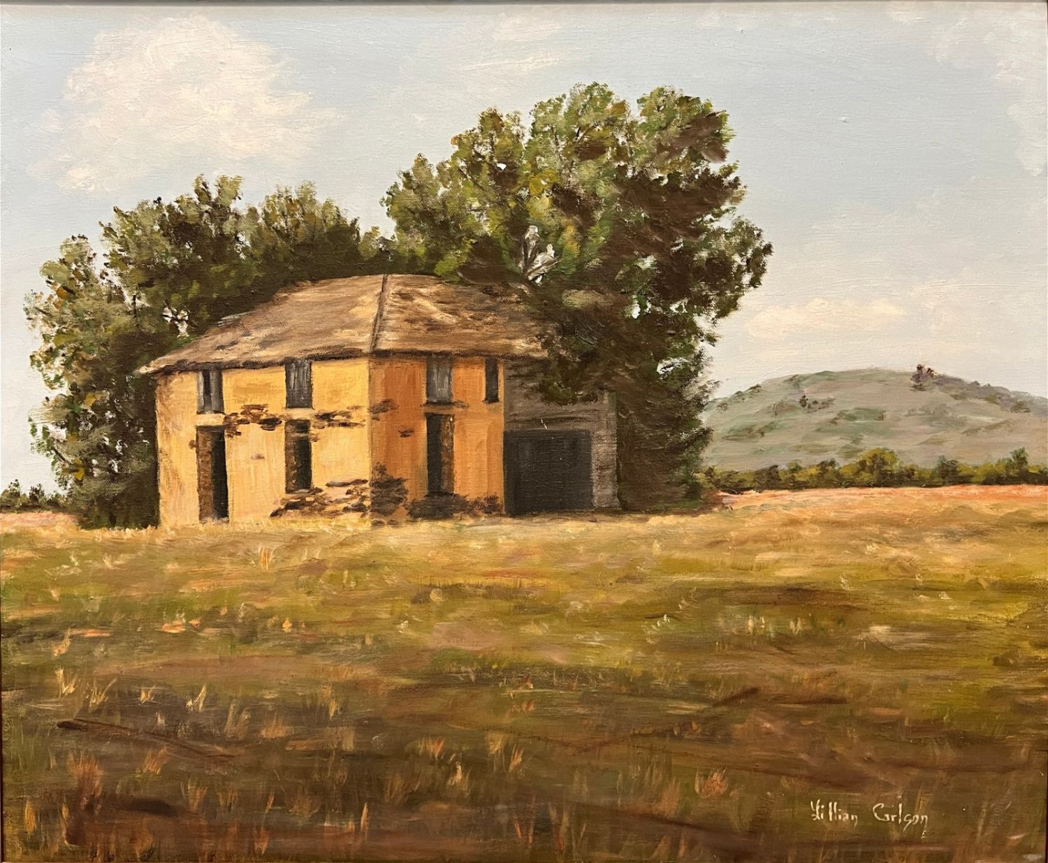 Carlson, Lillian, untitled stone house,Coronado Heights on right, acrylic on canvas
