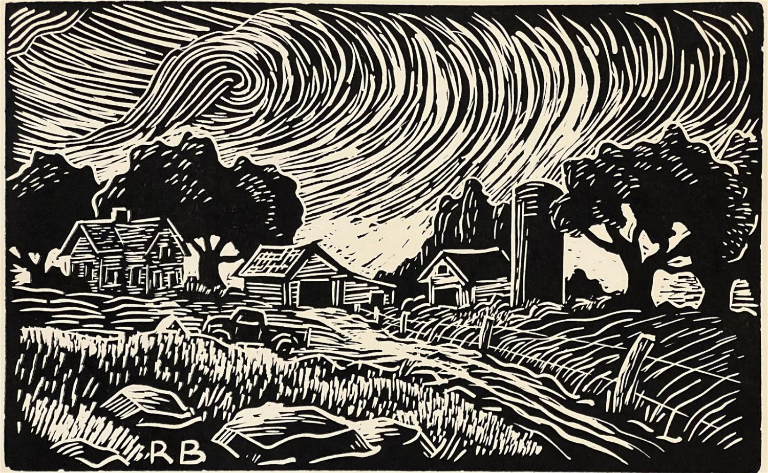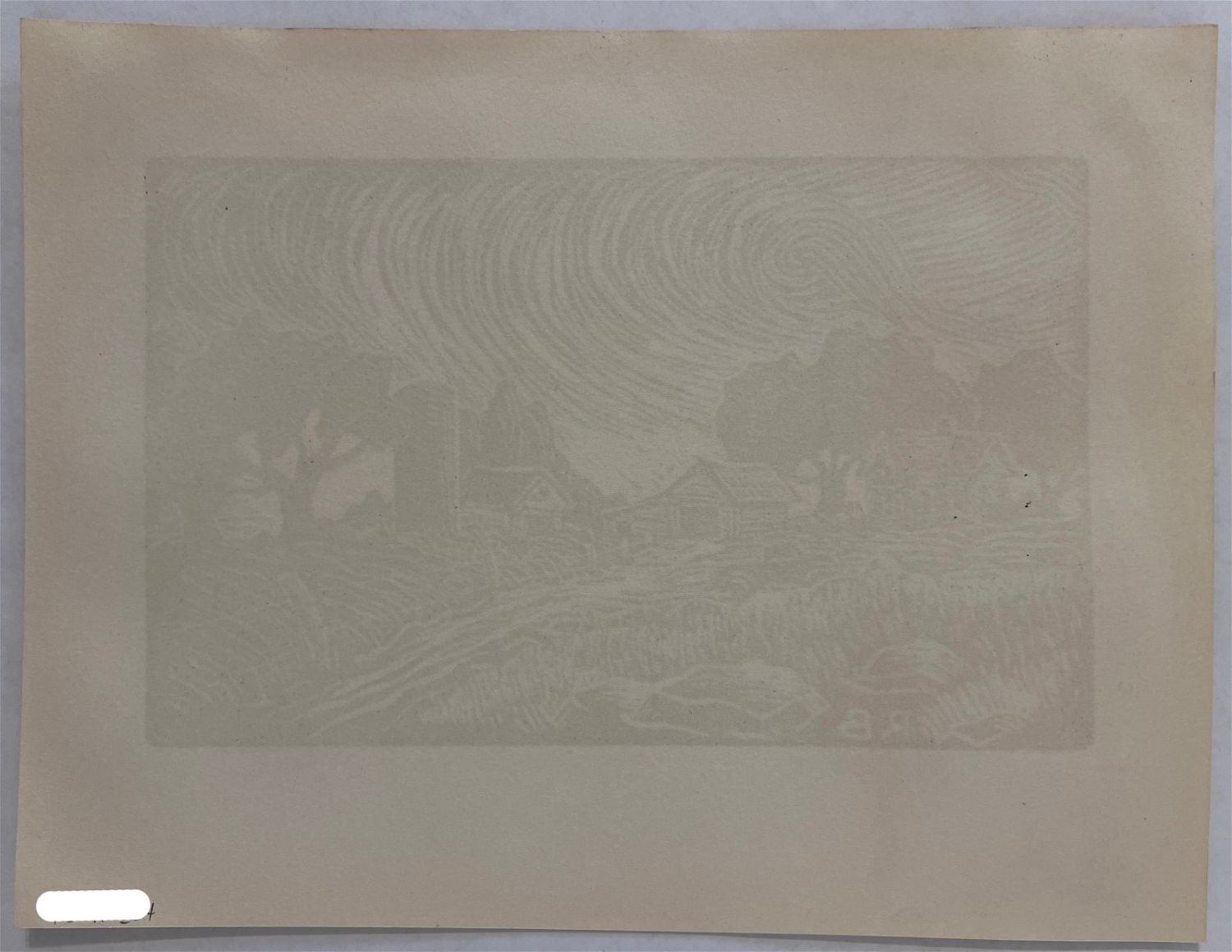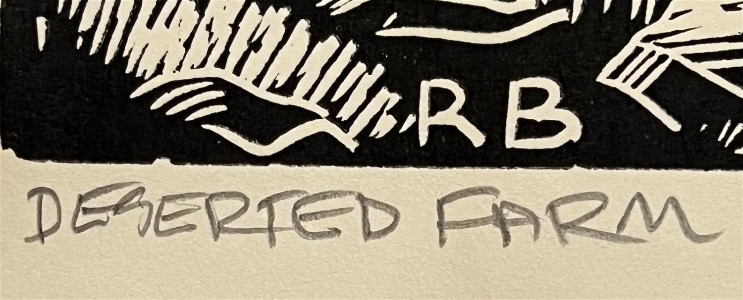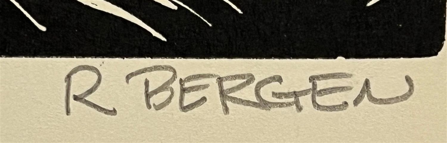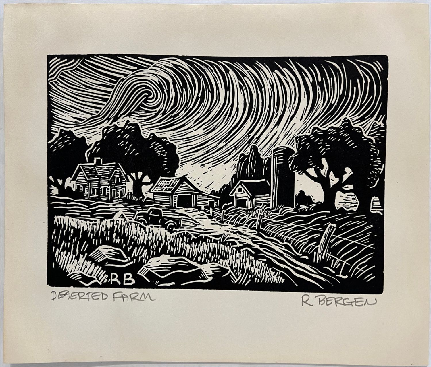 Bergen, Richard (1925-2020) "Deserted Farm" linoleum block print, pencil signed in lower right, good condition, unframed, image size: 5.75 x 9 inches. Dr. Richard D. Bergen, the Kansas artist whose iconic bronze sculpture Ad Astra graces the capitol building in Topeka, died Wednesday, April 22, 2020, in Salina. He was 95. Bergen and son Rich partnered for over 35 years in the Bergen’s Sculpture Studio, a north Santa Fe Avenue gallery and work space, where together they crafted more than 40 monumental bronze sculptures and other works of public art found in cities across Kansas. Named Distinguished Kansan of the Year in 2006, Bergen was a lifelong advocate for the arts and education, who came to Kansas on the GI bill to study art at Bethany College after service in the U.S. Navy during WWII. He ultimately earned degrees from three Kansas institutions of higher education and inspired hundreds of his own students to embrace the creative arts. Bergen made Salina his home for nearly 65 years. As director of art education in the Salina public schools during the late 1950s through 1960s, he taught every child in Salina’s kindergarten through sixth grade classes through his monthly visits to each of the city’s then 16 elementary schools. Bergen became a professor of art and chair of the Art Department at Marymount College in 1967, and studied in the summers to earn a doctorate in art education from the University of Kansas in 1973. His first monumental bronze, Trifinity, was completed during that time. With three intertwining figures, representing the past, present and future of Salina, it stands between the city’s library and court house and was dedicated in January 1975. Trifinity was the first of many sculptures he crafted and installed across Kansas, including the Pony Express Rider in Marysville, Heritage Woman in Wichita Heritage Square, the Buffalo Soldier in Junction City, and most recently, the Terrible Swede on the Bethany College campus in Lindsborg. With a master’s degree in art from Kansas State University earned in 1963, many of his works are found in Manhattan. They include the crouching Wildcat ready to pounce at the K-State Alumni Center, Holy Family at St. Thomas More Catholic Church, Ernie Barrett with hand outstretched at Bramlage Coliseum, and busts of Martin Luther King, Jr., and Marianna Kistler Beach at the K-State art museum named for her. Bergen was also an enthusiastic community and civic leader. He was a founding member of the Salina AMBUCS club, a member of the Masonic Temple, and elected to a term on the Salina School Board in 1973 and served as president. He was an active member of the St. John’s Lutheran Church and the Salina War Memorial Committee, which raised funds to honor Salina’s veterans with a plaza in Sunset Park. His sculpture of an eagle with wings spread wide is atop the memorial. Born January 7, 1925, in Palm Beach, Fla., to Gilbert and Fern (Tyner) Bergen, he grew up in Elizabeth, N.J., where he attended high school. Bergen enlisted in the U.S. Navy in 1941 and served as a machinist in the South Pacific. Encouraged to study art after the war, Bergen attended the Newark School of Fine Art in 1946, then moved to Kansas to enroll at Bethany College in Lindsborg to study with noted artists Birger Sandzen and Charles Rogers. Bergen graduated from Bethany in 1953 with a BFA in art. He met his wife, Marquette native Lou Ann (Lindstrom), in his very first class at Bethany, which sealed his fate to be a Kansan. The two were married on June 3, 1953, and were together for 65 years, until she preceded him in death on Sept. 4, 2018. Bergen is survived by his daughter Lori Bergen (Charles Mangano) of Boulder, Colo., son Rich Bergen (Lynda Buehre) of Salina, grandchildren John Bergen Kamerer of Wichita, Anna Bergen Kamerer of New York, N.Y.