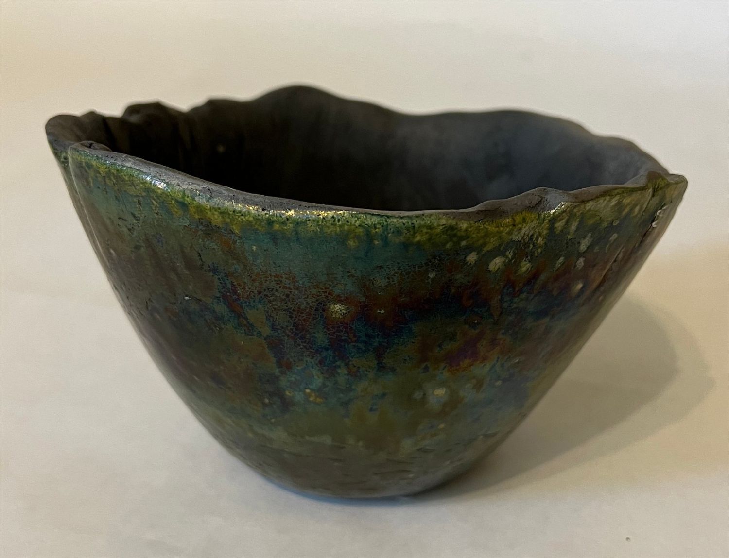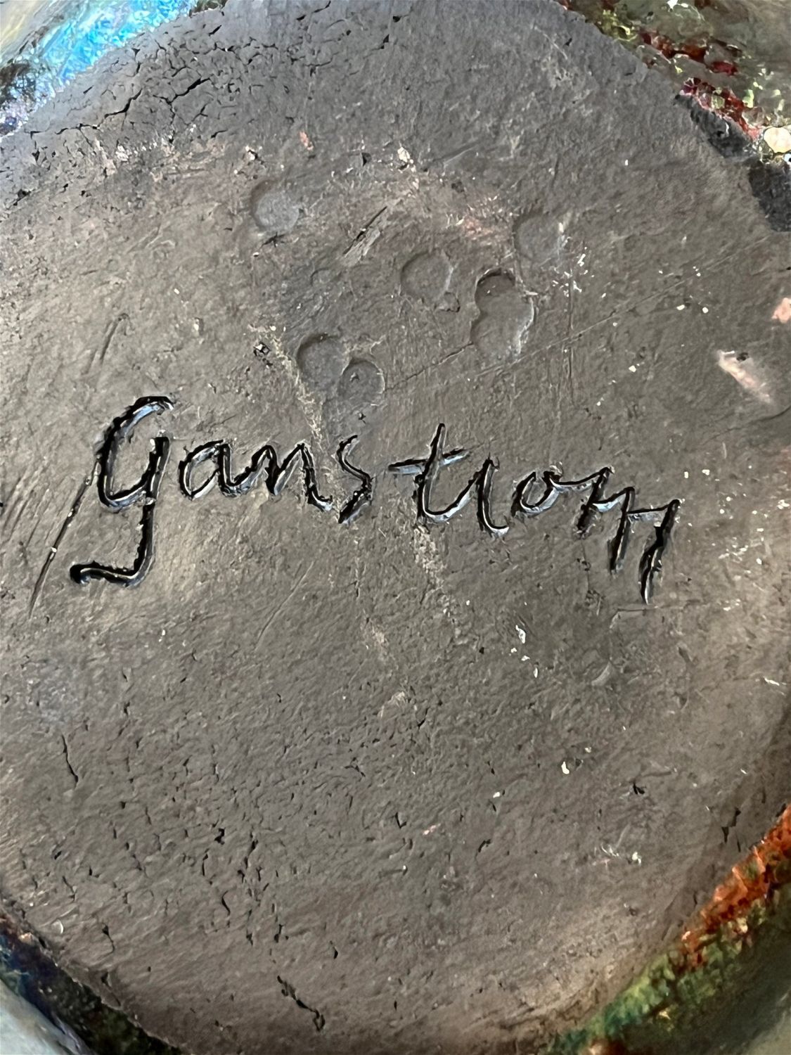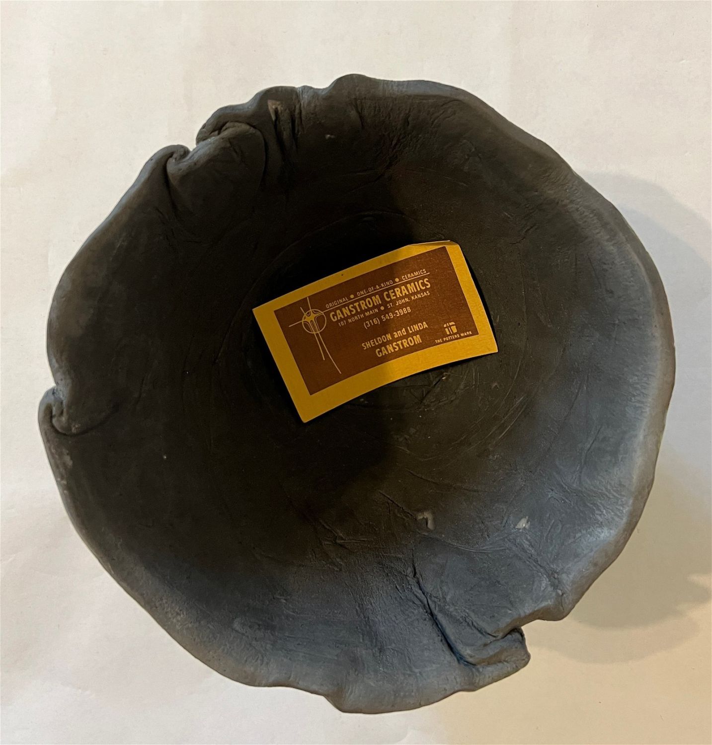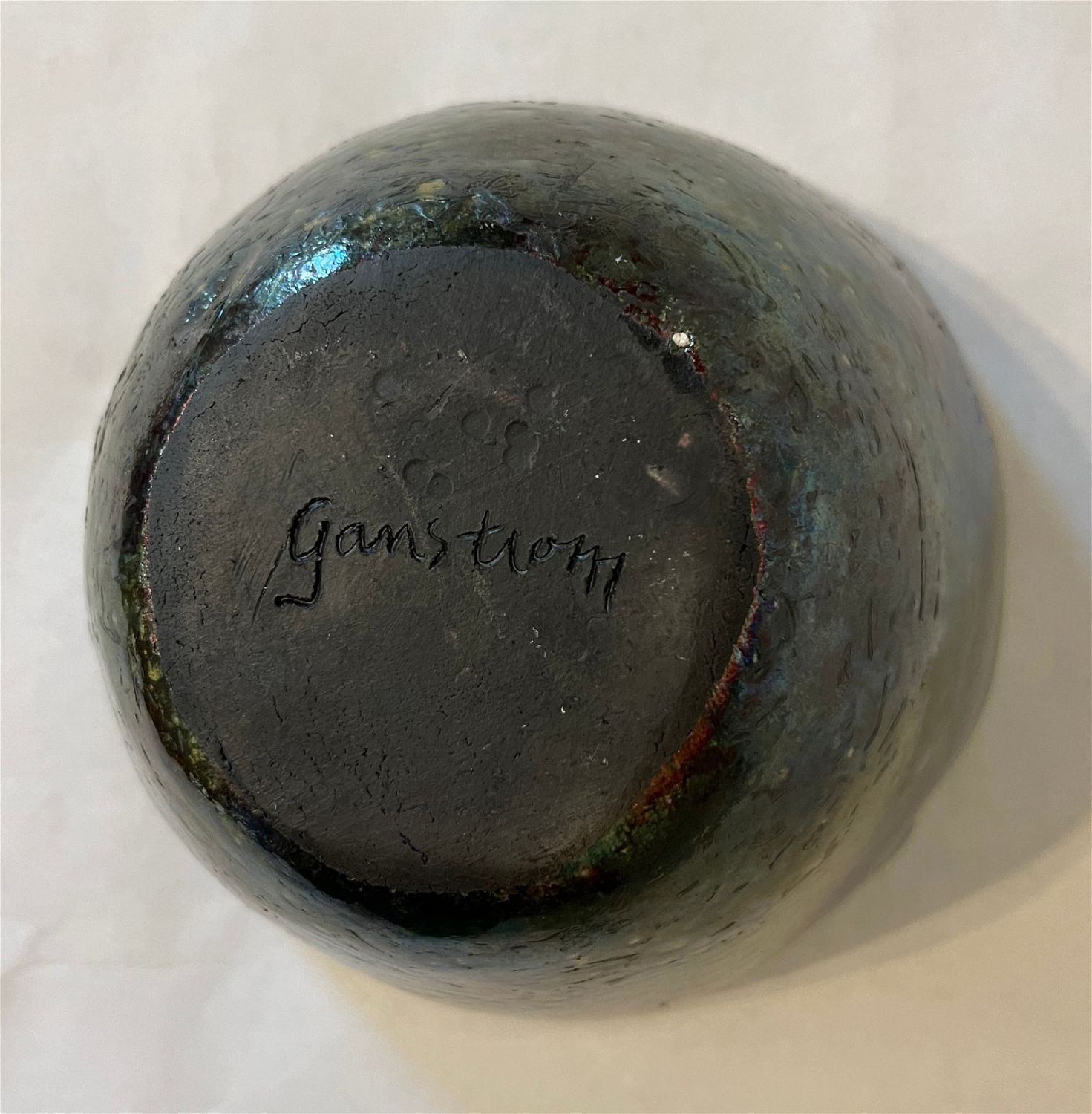 Ganstrom, Sheldon, raku bowl, ceramic, signed in bottom, good condition, no cracks or chips, size: 5 x 7.25 x 7.25 inches. Among the most masterful glaze painters working within the American raku tradition, Sheldon Ganstrom has spent over four decades exploring and developing a unique and personal palette of glaze variations and firing techniques. Hard edge, geometric abstract glaze painting occasionally punctuated by the earthy, organic edges of the clay invites entry into a world of pure emotion. Utilizing incredible colors, textures and smoke affects, his complex and contrasting design elements express the dramatic shift of life and relationships. A master potter, Ganstrom?s expertly crafted ceramic forms allow his glaze paintings to escape the wall and enter the world on a three dimensional canvas full of actual textures and tactile wonder. As an artist, Sheldon Ganstrom began his education as a painter and print-maker before discovering the expressive, sculptural potential of ceramics. By focusing on electric kiln fired glazes, smoked in post firing reduction, Ganstrom has developed an extensive and unique glaze palette. Carefully designing and executing his glaze paintings over days, even weeks; each work is submitted to the demanding test of fire. Intense focus and technical expertise is required as Ganstrom pulls his glazed piece from the kiln while the glaze is still molten and the clay hot enough to accept the effects of the smoke. The risk and adventure of the smoking process adds subtle variation to his meticulous glaze painting producing a unique work that combines his carefully controlled painting with the spontaneous patterns of the smoking process. After a decade of teaching, Sheldon Ganstrom has exclusively dedicated himself to his studio practice for the last three decades. Exhibiting in art events across America, this graduate of Kansas State University has work in public and private collections across the United States, China, Japan, Europe and Russia and is featured in numerous books and publications. ?Raku: Origins, Impact, and Contemporary Expression? at the American Museum of Ceramic Art in Pomona, CA was a career highlight as ?Pilgrimage Relic? was purchased for the museum?s permanent collection.