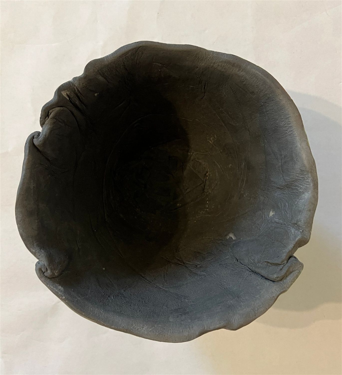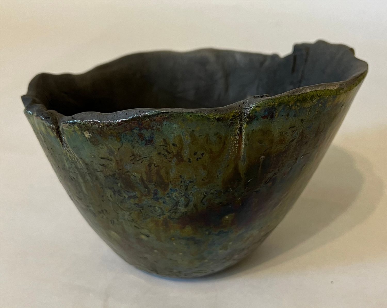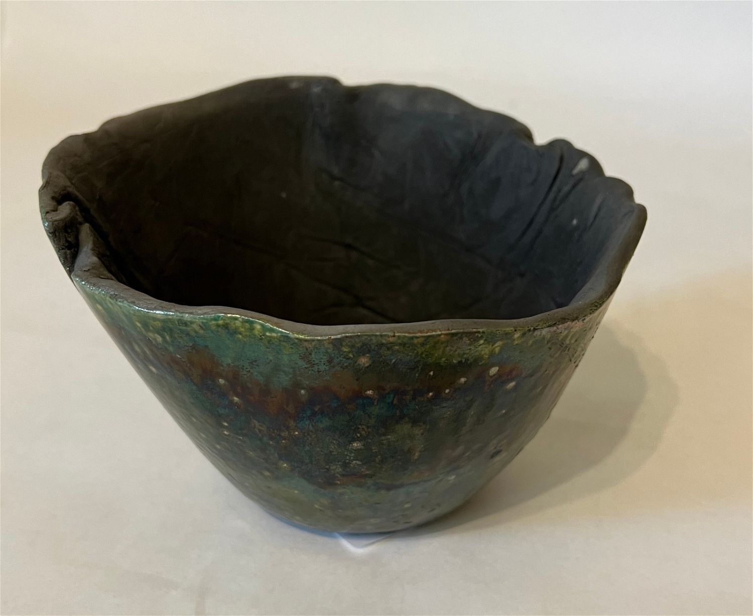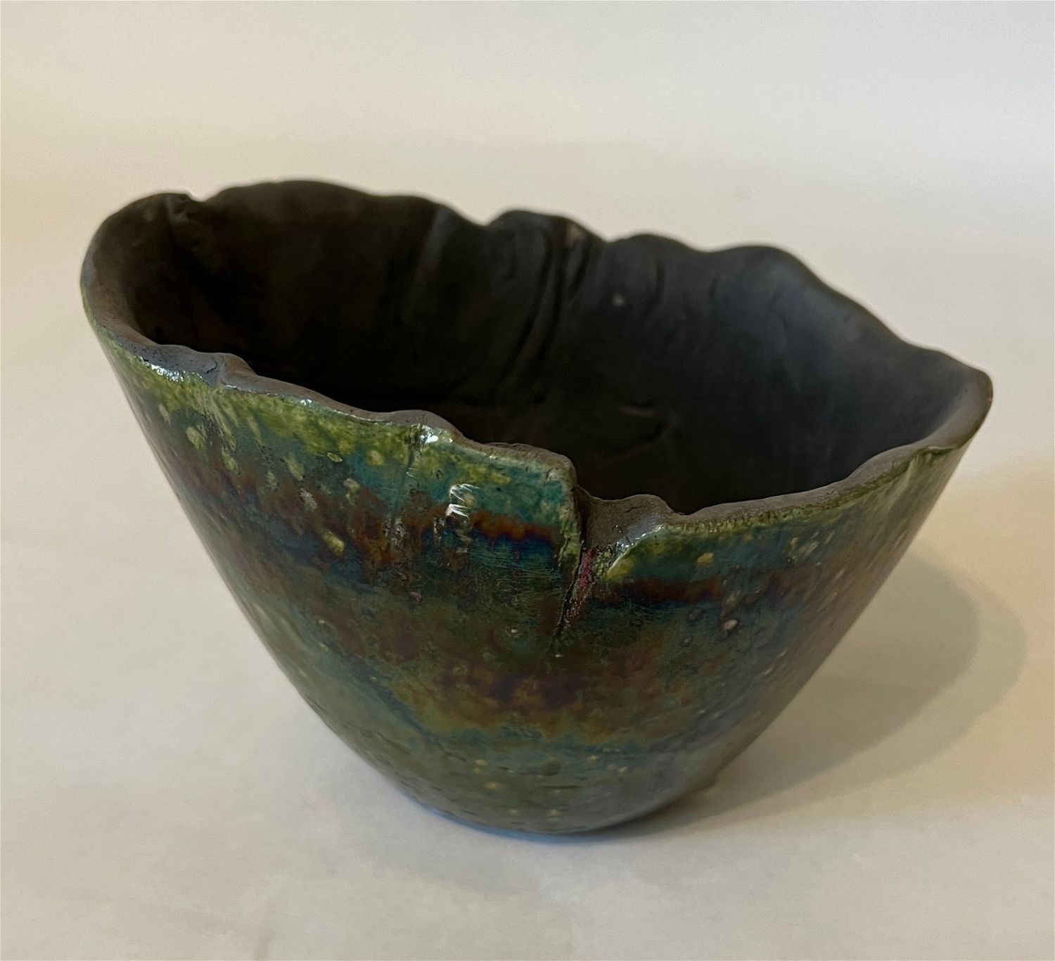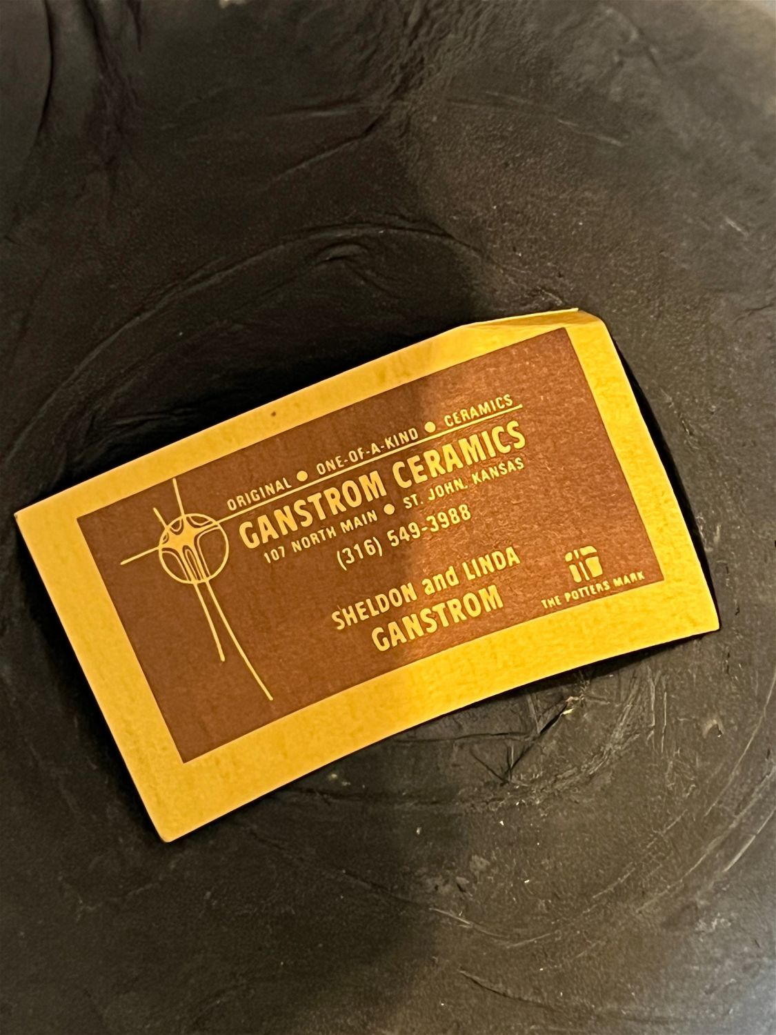 Ganstrom, Sheldon, raku bowl, ceramic, signed in bottom, good condition, no cracks or chips, size: 5 x 7.25 x 7.25 inches. Among the most masterful glaze painters working within the American raku tradition, Sheldon Ganstrom has spent over four decades exploring and developing a unique and personal palette of glaze variations and firing techniques. Hard edge, geometric abstract glaze painting occasionally punctuated by the earthy, organic edges of the clay invites entry into a world of pure emotion. Utilizing incredible colors, textures and smoke affects, his complex and contrasting design elements express the dramatic shift of life and relationships. A master potter, Ganstrom?s expertly crafted ceramic forms allow his glaze paintings to escape the wall and enter the world on a three dimensional canvas full of actual textures and tactile wonder. As an artist, Sheldon Ganstrom began his education as a painter and print-maker before discovering the expressive, sculptural potential of ceramics. By focusing on electric kiln fired glazes, smoked in post firing reduction, Ganstrom has developed an extensive and unique glaze palette. Carefully designing and executing his glaze paintings over days, even weeks; each work is submitted to the demanding test of fire. Intense focus and technical expertise is required as Ganstrom pulls his glazed piece from the kiln while the glaze is still molten and the clay hot enough to accept the effects of the smoke. The risk and adventure of the smoking process adds subtle variation to his meticulous glaze painting producing a unique work that combines his carefully controlled painting with the spontaneous patterns of the smoking process. After a decade of teaching, Sheldon Ganstrom has exclusively dedicated himself to his studio practice for the last three decades. Exhibiting in art events across America, this graduate of Kansas State University has work in public and private collections across the United States, China, Japan, Europe and Russia and is featured in numerous books and publications. ?Raku: Origins, Impact, and Contemporary Expression? at the American Museum of Ceramic Art in Pomona, CA was a career highlight as ?Pilgrimage Relic? was purchased for the museum?s permanent collection.