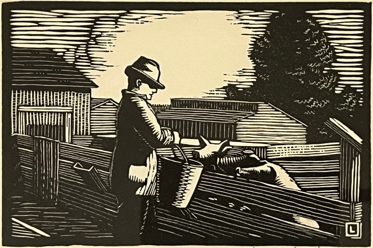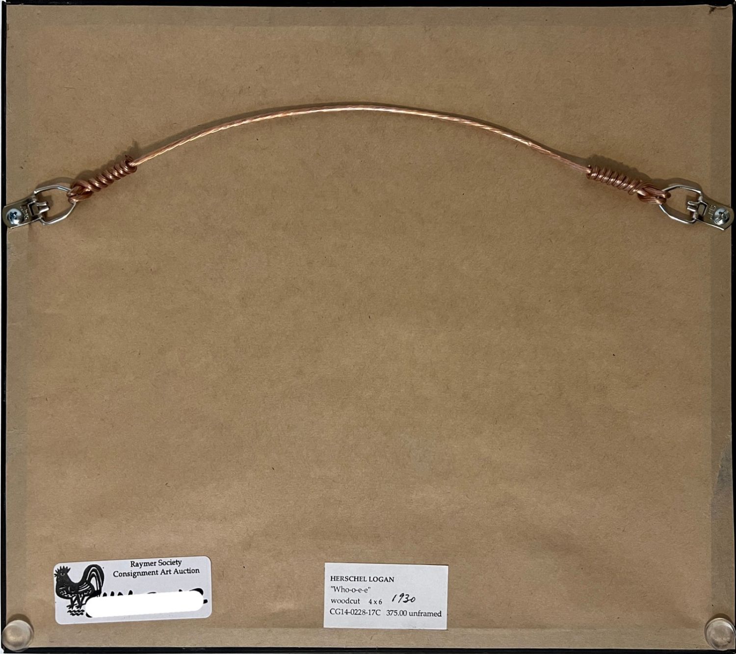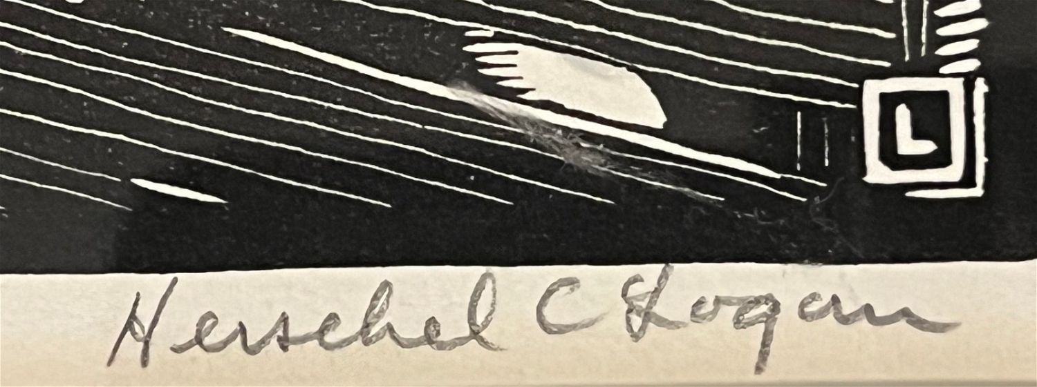 Logan, Herschel (1901-1987) "Who-o-e-e" woodcut block print, pencil signed lower right, good condition, image size: 4 x inches. Born in Magnolia, Missouri in 1901, and reared from early childhood on a farm near Winfield, Kansas, Herschel Logan was surrounded by common things and found them beautiful.Logan is distinguished among Midwestern artists for the force and vitality of his woodcut prints. He had never heard of woodcuts until he became employed in the art department of a Wichita printing company. He spent a year in the Chicago Academy of Fine Arts, taking all the drawing he could get in by day classes and studying by correspondence at night. He was also an eager student of design.By chance a customer of a Wichita printing firm urged Logan to go talk to Mr. C. A. Seward (1884-1939). That very evening he went to see Seward and learned for the first time about the making of woodcuts. The next day he set out to find a piece of cherry wood. Putting a fine edge on his pocket knife, he made his first woodcut print.The Kansas landscape he found along the roadside became the subject for many of his prints. Blazing sunlight effects in summer, falling snow and drifted farmsteads in winter are found in his prints. He often masses areas of black in contrast to splashes of light.As a charter member of the Prairie Print Makers Society, Herschel Logan (1901 – 1987) was recognized among his peers as one of the foremost printmakers in Kansas when the group was founded in 1930. Over his lifetime, Logan’s woodcuts received more than thirty prizes in art exhibitions throughout the region and U.S. They are represented in the permanent collections of the Library of Congress, New York Public Library and other esteemed institutions.Logan’s method of creating a woodcut is best documented in the book, Herschel Logan: Man of Many Careers by Anthony Lehman. He writes, "working either from photographs or field sketches, he would first make a rough outline on the block using tracing paper, then ponder the initial design for several days. After his imagination and innate artistic sense had a chance to function, the completed picture – which had largely evolved in his mind – was then realized on the wood." Generally, his editions numbered 50 prints.Logan made approximately 140 woodcuts from 1921 to 1938. In the early 1930s, he was named Art Director for Consolidated Printing in Salina and remained there until his retirement in 1967.Throughout his life, he was active in civic and service organizations, including the Masons and Rotary International. He was an authority on antique firearms, the Civil War, and active in the National Rifle Association – writing a monthly article for the National Rifleman magazine from approximately 1945 to 1965. He also created a cartoon called "the Colonel Says" that ran in the Salina Journal and was sponsored by Consolidated Printing. After he retired, Logan moved to Santa Ana, California, and began printing miniature books using a Baby Reliance Press.He died in Santa Ana in 1987.Although he created a limited amount of woodcuts, he established a reputation as one of the finest masters of the medium and received numerous awards in juried competitions. His prints have a decisively elegant aspect that makes them instantly recognizable.