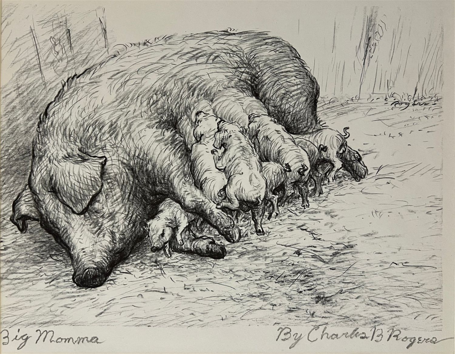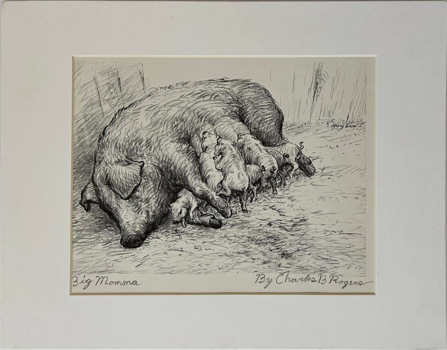 Rogers, Charles (1911-1987) "Big Mama" lithograph, signed by the estate of Charles B Rogers. good condition, no frame, images size: 6.75 x 9.5 inches.A painter, art educator, and member of the Prairie Printmaker Society, Charles B Rogers (1911-1987) was known for his airy landscapes of the American West, often with pastel hues executed in oil. He was born in Great Bend, Kansas, and studied at the National Academy of Design; Bethany College in Lindsborg, Kansas under Birger Sandzen; the California College of Arts and Crafts; and with Dong Kingman and Jay Connaway. From 1947 to 1953, he taught at Lindsborg College, and from 1954 to 1966, he was Manager and Assistant Director of the Huntington Hartford Museum in Los Angeles. After that, he was a Professor of Art at Kansas State University.