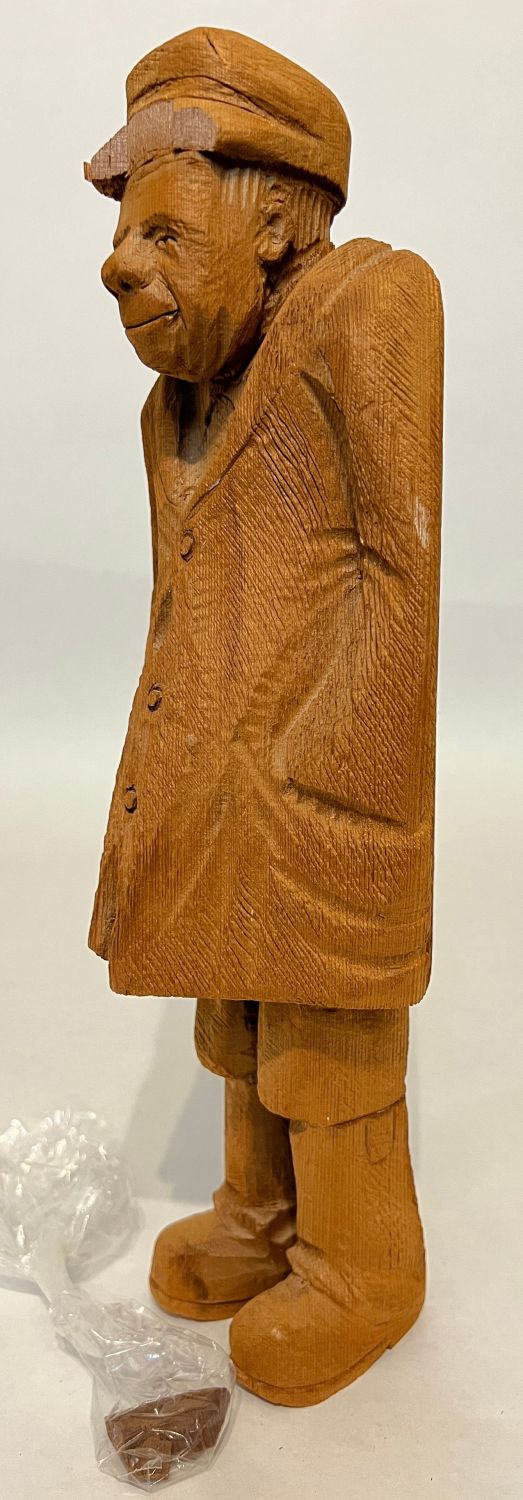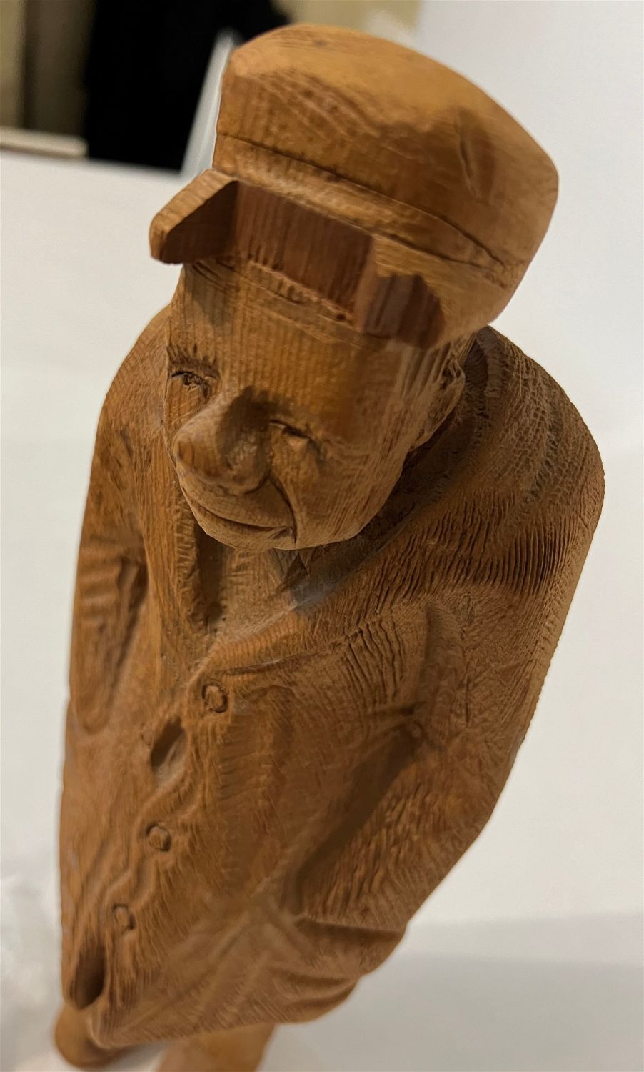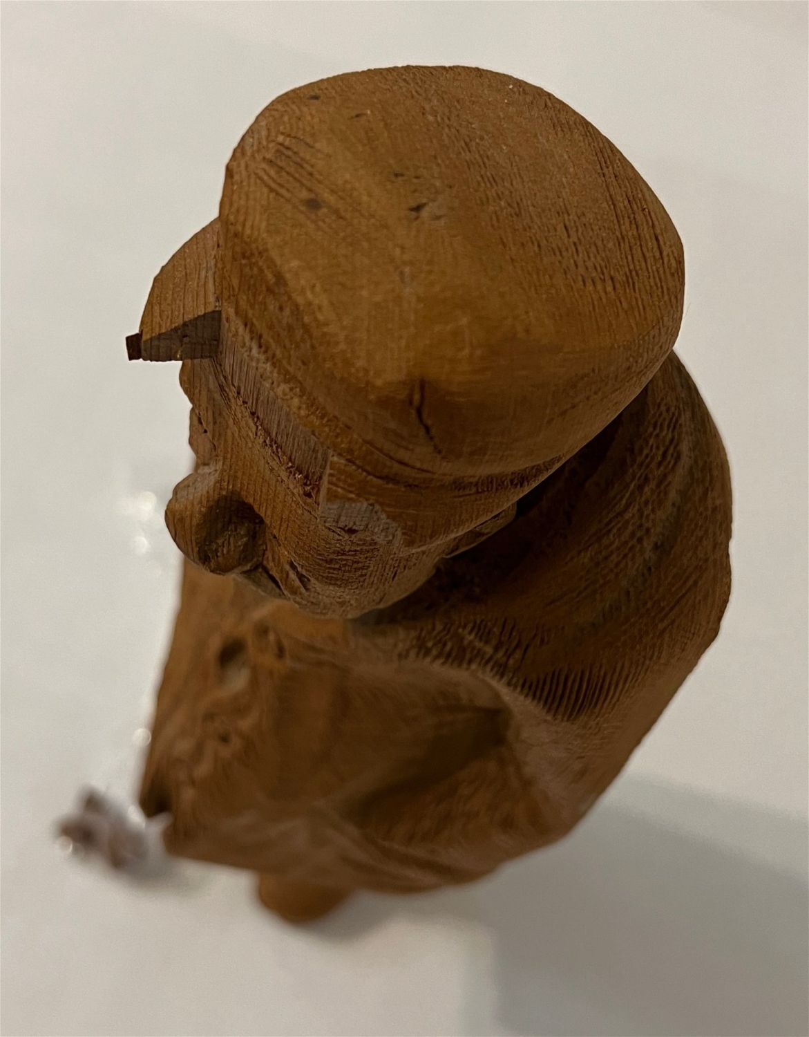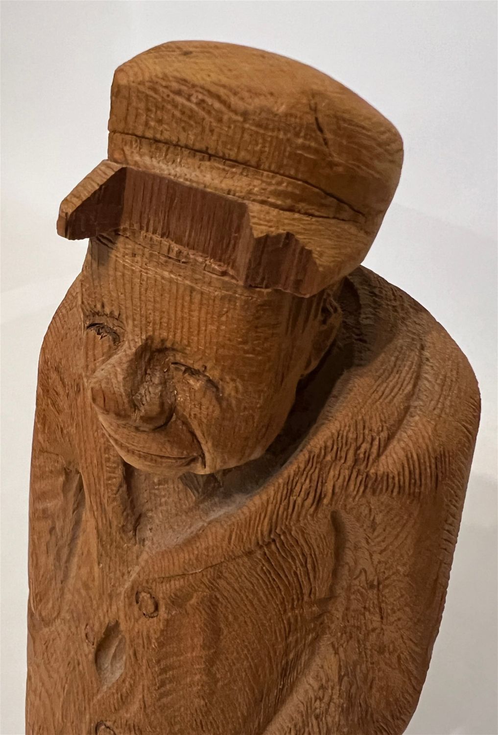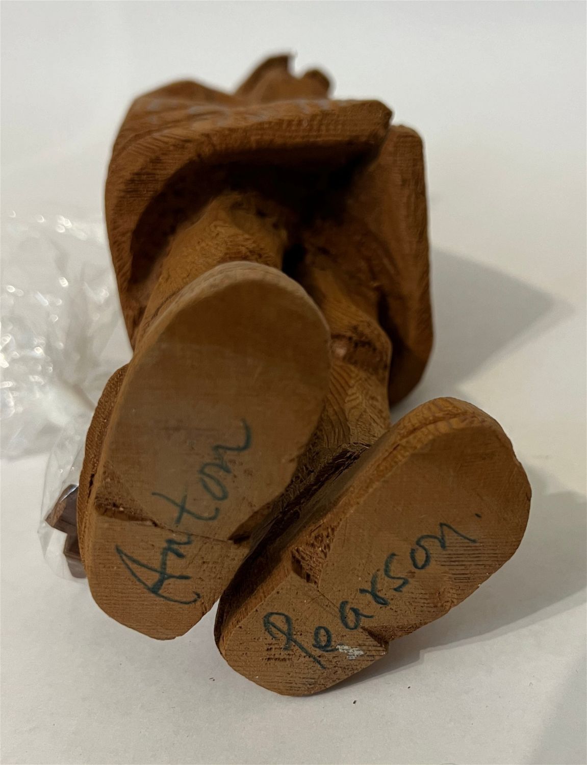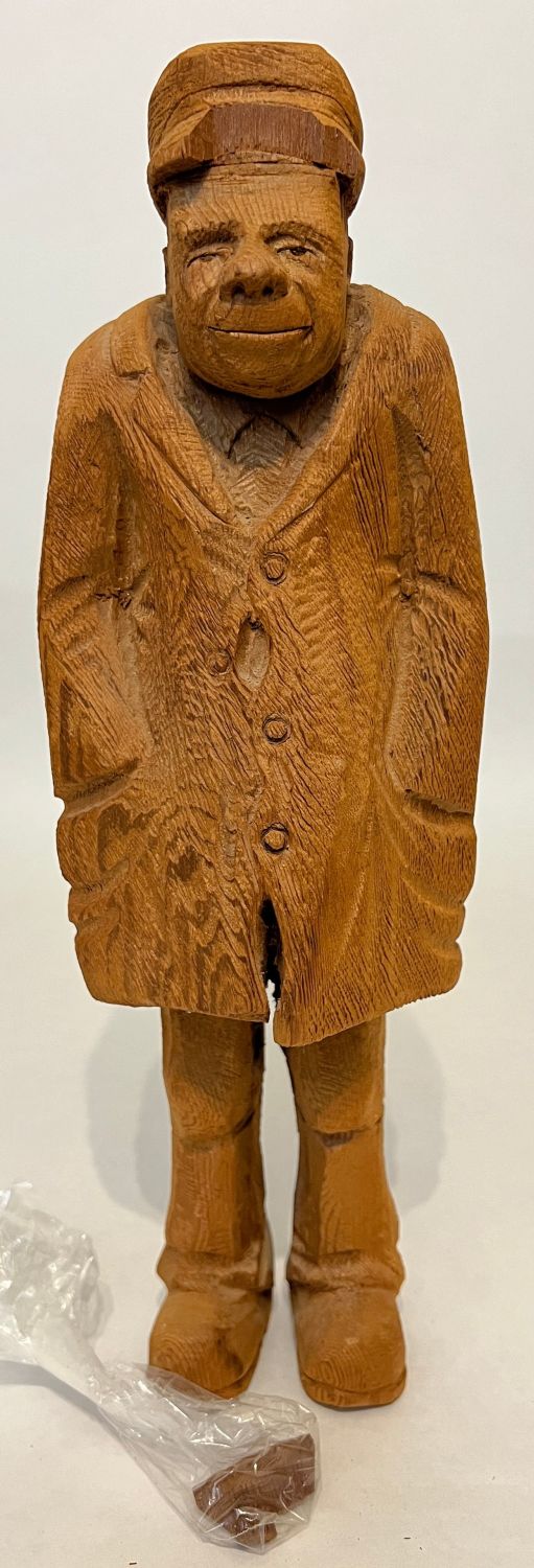 Pearson, Anton (1892-1967) Old man with newsboy cap, woodcarving, signed onbottom, fair condition, bill of newsboy cap is broken with pieces, size: 13.5 x 4.5 x 5 inches. Nils Anton Pearson was born 23 May 1892 in Lund, Sweden. He started carving at the age of nine. Many of the boys in his school were also learning to carve, all of them inspired by the Swedish woodcarver D?derhultarn. Anton attended a technical school at the University of Lund because his father wanted him to be an engineer. Anton was more interested in the arts.It is unclear at this time why Anton decided to travel to America. His family suspects his adventurous personality played a part in the decision. Whatever the reason, he tried to book passage on the RMS Titanic, but the ship was sold out.Anton arrived in America in May 1912, just a few days before his twentieth birthday. He settled in Chicago for a time.In 1915, after visiting the world’s fair in San Francisco, Anton decided to make a stop in a little town called Lindsborg, Kansas, a stop that would change the course of his life. Anton enrolled in Bethany College to study fine arts under his friend and mentor Birger Sandzen. By December 1918, he was exhibiting paintings at art shows locally and in surrounding areas.Anton in Lindsborg supported himself during these years by being a field agent for the Capper Publishing Company as well as selling Wearever aluminum kitchen utensils and as an "oil man" working for an oil company securing land owners contracts to drill on their property.During his Bethany College years, Anton met a quietly delightful piano student named Grace Lane. She was a direct descendant of the Pilgrim William Brewster. Their courtship was a long one, as Anton had many adventures he wanted to experience.In 1922, Anton took a four-month sojourn traveling by horse and wagon, homemade houseboat, car and rail over 3,600 miles to travel the US and get inspiration for his art. He returned with nearly 200 paintings. Anton sent Grace many letters during this trip.Anton’s friendship with Birger Sandzen was a rewarding one. Sandzen was not only Anton’s teacher and mentor, but a friend as well. Many Saturdays would find the two driving around in a Model T Ford from sunup to sundown seeking interesting scenes to sketch for paintings.After many adventures, Anton married Grace Lane in 1929. Anton and Grace honeymooned in Colorado. Their daughter Rosemary was born in 1933.Anton and Grace built their home in Lindsborg in 1929. Anton collected many interesting things during his travels: rocks, antiques, discarded building materials. Anton enjoyed finding treasures and repurposing them for his home and studio. Anton would later build a garage in the rear that eventually became his woodcarving studio.Anton served his adopted country in WWI. He was stationed at Camp Cody, NM. He worked for the aircraft industry in Wichita, KS during WWII. After the war, he continued to carve and amassed quite a collection of wonderful carvings. He opened his studio to tourists and visiting school groups. He went to schools and spoke about carving and the arts.In his studio, Anton indulged in his childhood passion: woodcarving. He continued to paint as well, but the majority of his time was spent carving.Anton’s pioneer figures were mostly carved from redwood, catalpa, mahogany, cottonwood and even limestone. He did many other creative carvings, from funny figures to large animals. Anton admired the pioneers of Lindsborg. He listened intently to their stories and they influenced his carvings. They show Swedish pioneers at work and at play, living their daily lives.Anton said he created the characters he carved by closing his eyes and envisioning them. It’s been suggested that perhaps Lindsborg residents crept into his mind, as many of his carvings certainly resembled Lindsborgians he encountered.
