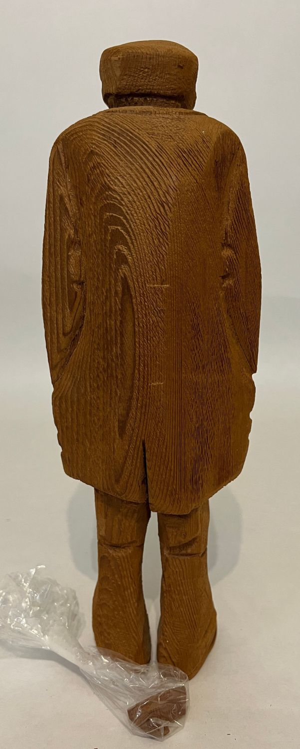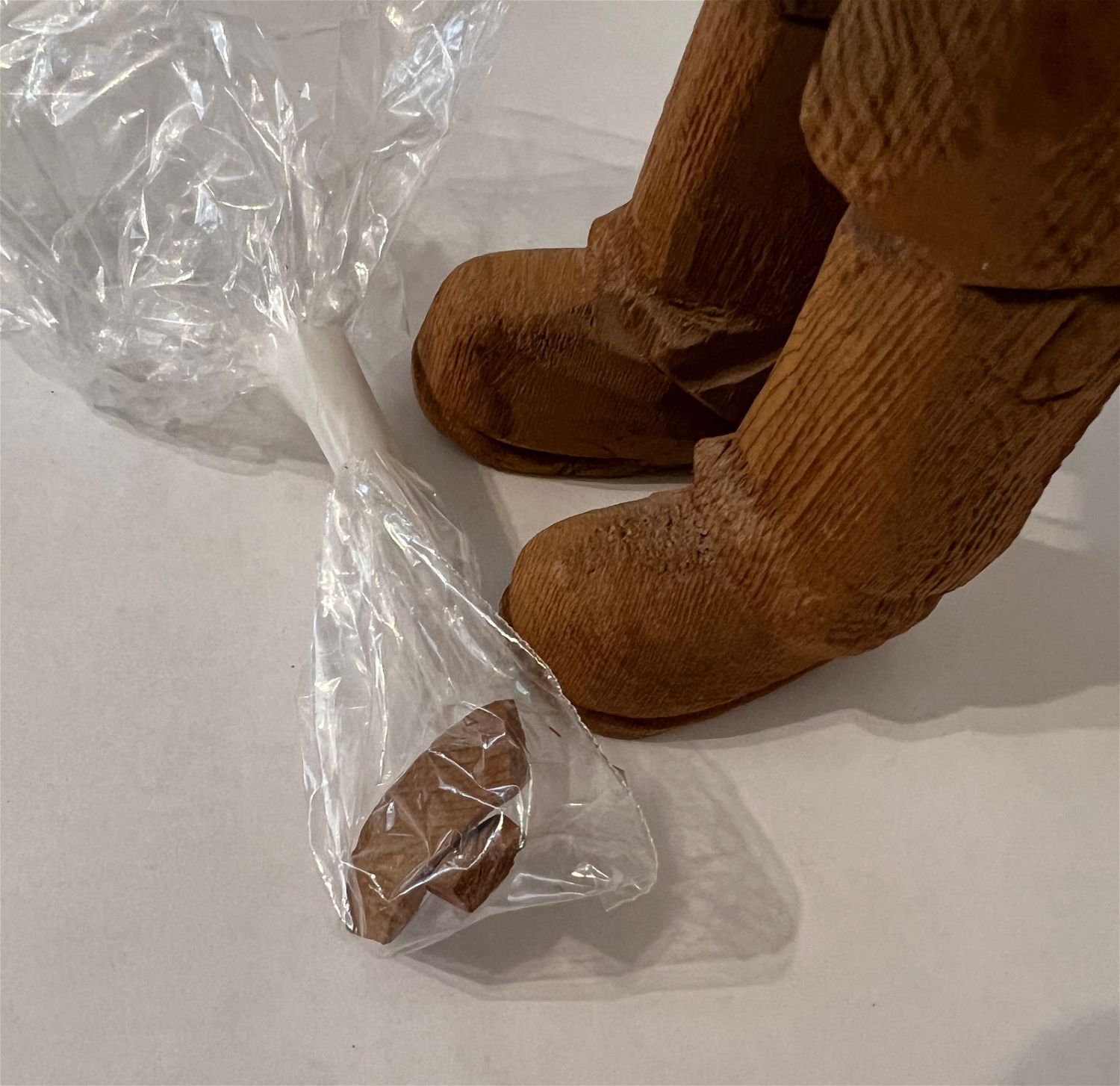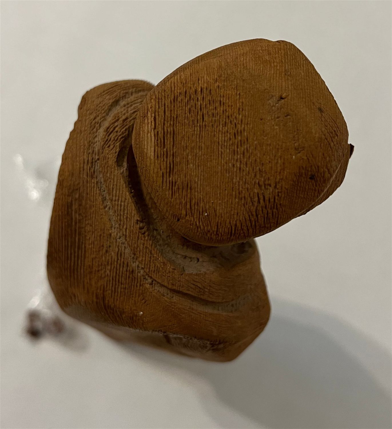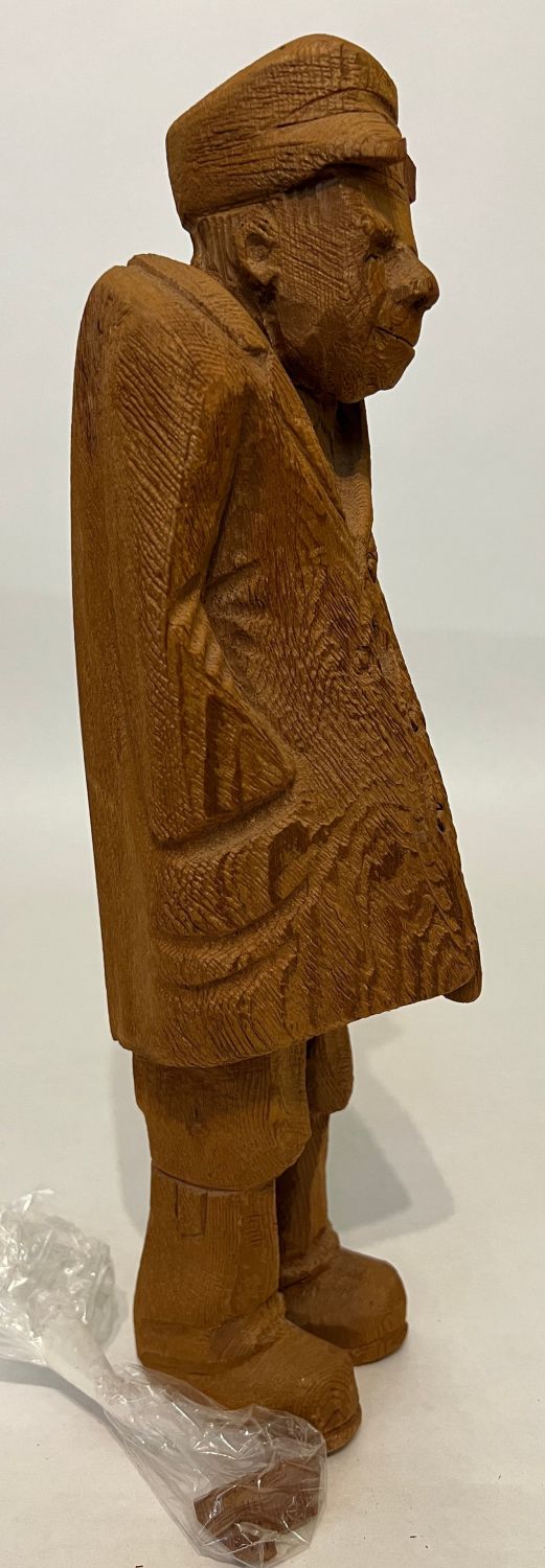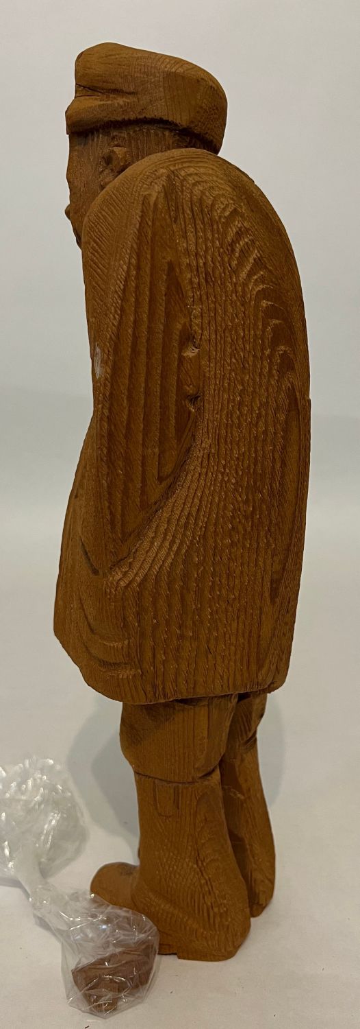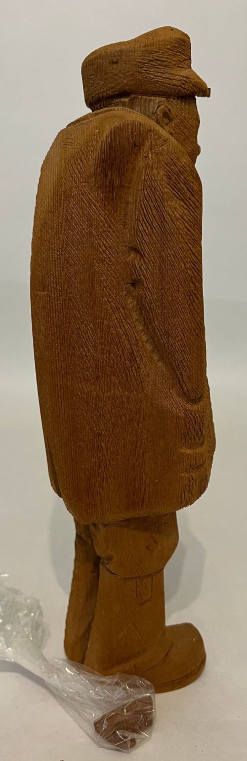Pearson, Anton (1892-1967) Old man with newsboy cap, woodcarving, signed onbottom, fair condition, bill of newsboy cap is broken with pieces, size: 13.5 x 4.5 x 5 inches. Nils Anton Pearson was born 23 May 1892 in Lund, Sweden. He started carving at the age of nine. Many of the boys in his school were also learning to carve, all of them inspired by the Swedish woodcarver D?derhultarn. Anton attended a technical school at the University of Lund because his father wanted him to be an engineer. Anton was more interested in the arts.It is unclear at this time why Anton decided to travel to America. His family suspects his adventurous personality played a part in the decision. Whatever the reason, he tried to book passage on the RMS Titanic, but the ship was sold out.Anton arrived in America in May 1912, just a few days before his twentieth birthday. He settled in Chicago for a time.In 1915, after visiting the world’s fair in San Francisco, Anton decided to make a stop in a little town called Lindsborg, Kansas, a stop that would change the course of his life. Anton enrolled in Bethany College to study fine arts under his friend and mentor Birger Sandzen. By December 1918, he was exhibiting paintings at art shows locally and in surrounding areas.Anton in Lindsborg supported himself during these years by being a field agent for the Capper Publishing Company as well as selling Wearever aluminum kitchen utensils and as an "oil man" working for an oil company securing land owners contracts to drill on their property.During his Bethany College years, Anton met a quietly delightful piano student named Grace Lane. She was a direct descendant of the Pilgrim William Brewster. Their courtship was a long one, as Anton had many adventures he wanted to experience.In 1922, Anton took a four-month sojourn traveling by horse and wagon, homemade houseboat, car and rail over 3,600 miles to travel the US and get inspiration for his art. He returned with nearly 200 paintings. Anton sent Grace many letters during this trip.Anton’s friendship with Birger Sandzen was a rewarding one. Sandzen was not only Anton’s teacher and mentor, but a friend as well. Many Saturdays would find the two driving around in a Model T Ford from sunup to sundown seeking interesting scenes to sketch for paintings.After many adventures, Anton married Grace Lane in 1929. Anton and Grace honeymooned in Colorado. Their daughter Rosemary was born in 1933.Anton and Grace built their home in Lindsborg in 1929. Anton collected many interesting things during his travels: rocks, antiques, discarded building materials. Anton enjoyed finding treasures and repurposing them for his home and studio. Anton would later build a garage in the rear that eventually became his woodcarving studio.Anton served his adopted country in WWI. He was stationed at Camp Cody, NM. He worked for the aircraft industry in Wichita, KS during WWII. After the war, he continued to carve and amassed quite a collection of wonderful carvings. He opened his studio to tourists and visiting school groups. He went to schools and spoke about carving and the arts.In his studio, Anton indulged in his childhood passion: woodcarving. He continued to paint as well, but the majority of his time was spent carving.Anton’s pioneer figures were mostly carved from redwood, catalpa, mahogany, cottonwood and even limestone. He did many other creative carvings, from funny figures to large animals. Anton admired the pioneers of Lindsborg. He listened intently to their stories and they influenced his carvings. They show Swedish pioneers at work and at play, living their daily lives.Anton said he created the characters he carved by closing his eyes and envisioning them. It’s been suggested that perhaps Lindsborg residents crept into his mind, as many of his carvings certainly resembled Lindsborgians he encountered.