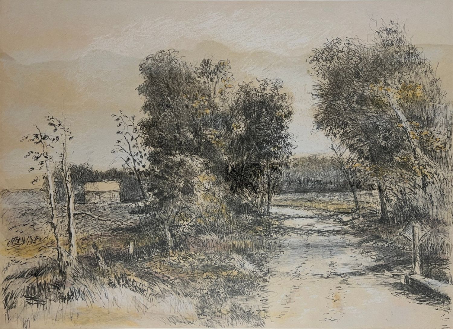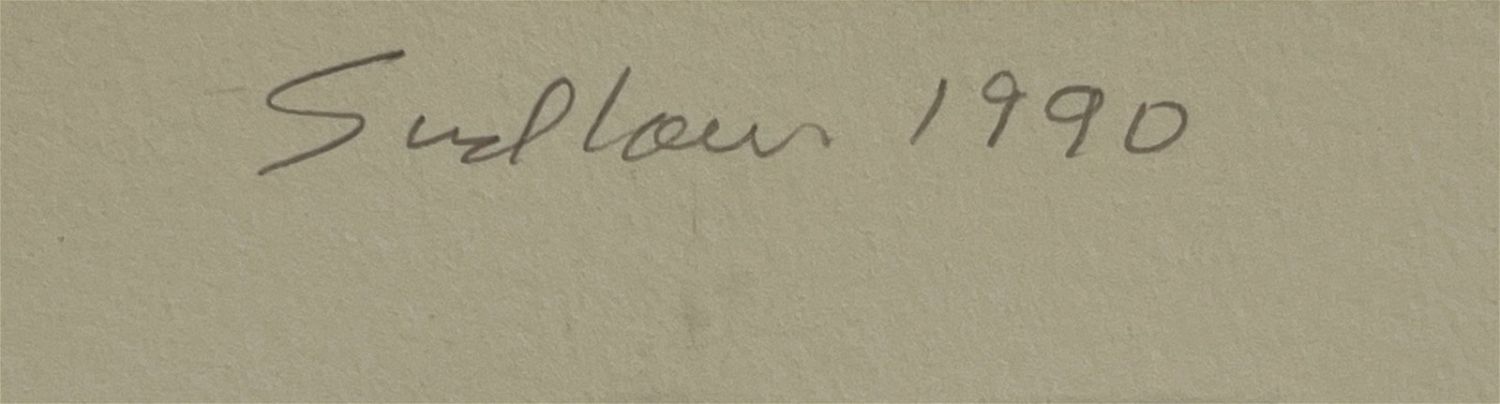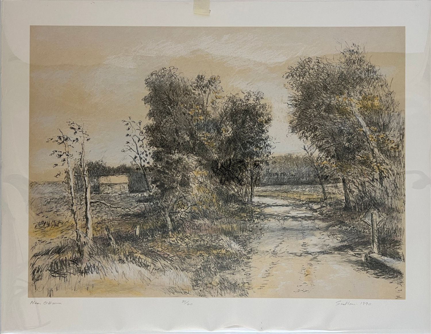 Sudlow, Robert (1920-2010) "Near O’Harra" 30/60, 1990 lithograph with tusche wash, pencil signed in lower right, good conditio, unframed, image size: 16.28 x 22.5 inches. Born in Holton, Kansas on Feb. 25, 1920, Robert Sudlow was a teacher and painter who specialized in Kansas landscapes. He earned a BFA from the University of Kansas, Lawrence in 1942, studying with Albert Bloch, Raymond Eastwood, and Karl Mattern.From 1942 to 1945, he served as a Navy pilot. He joined the faculty at the University of Kansas, Lawrence in 1946, and began spending his summers in the Santa Cruz Mountains in California. He enrolled in the summer Fine Arts program at the University of California, Berkeley in 1951 and then took a sabbatical in 1951-53 to study in France and receive instruction at the Academie de la Grande Chaumiere and the Academie Andre L’Hote in Paris.In 1956, he earned an MFA from the California College of Arts & Crafts studying with Richard Diebenkorn. In 1974 he was named First Kansas Governor’s Artist.Robert Sudlow retired from the University of Kansas in 1987.