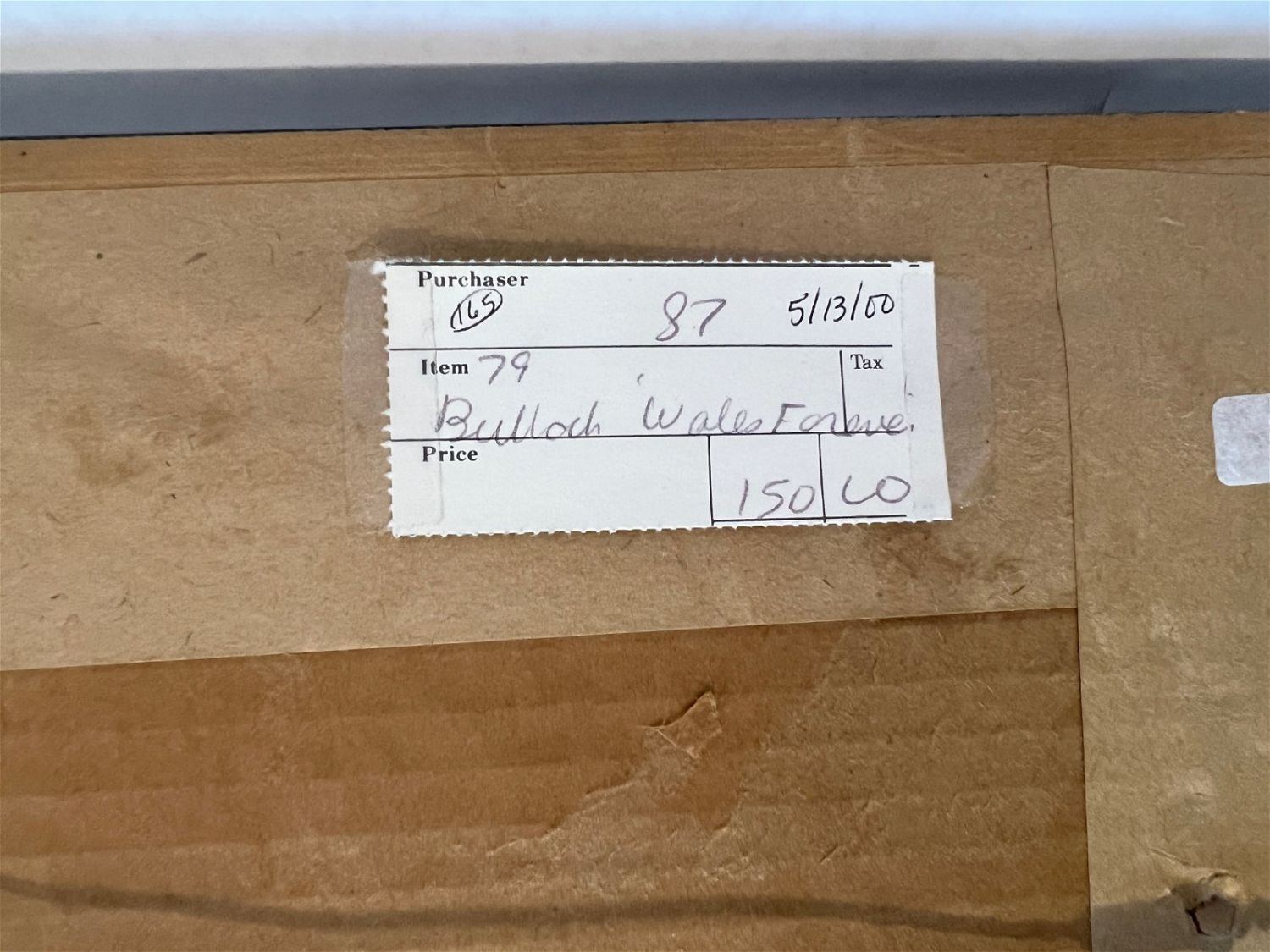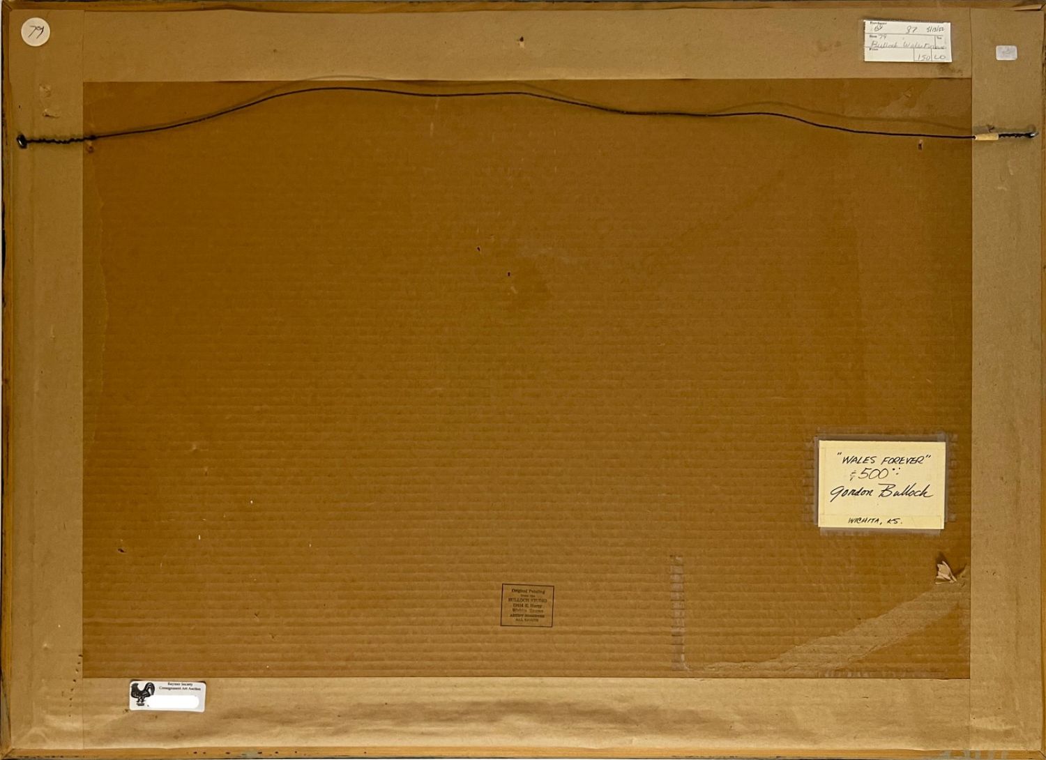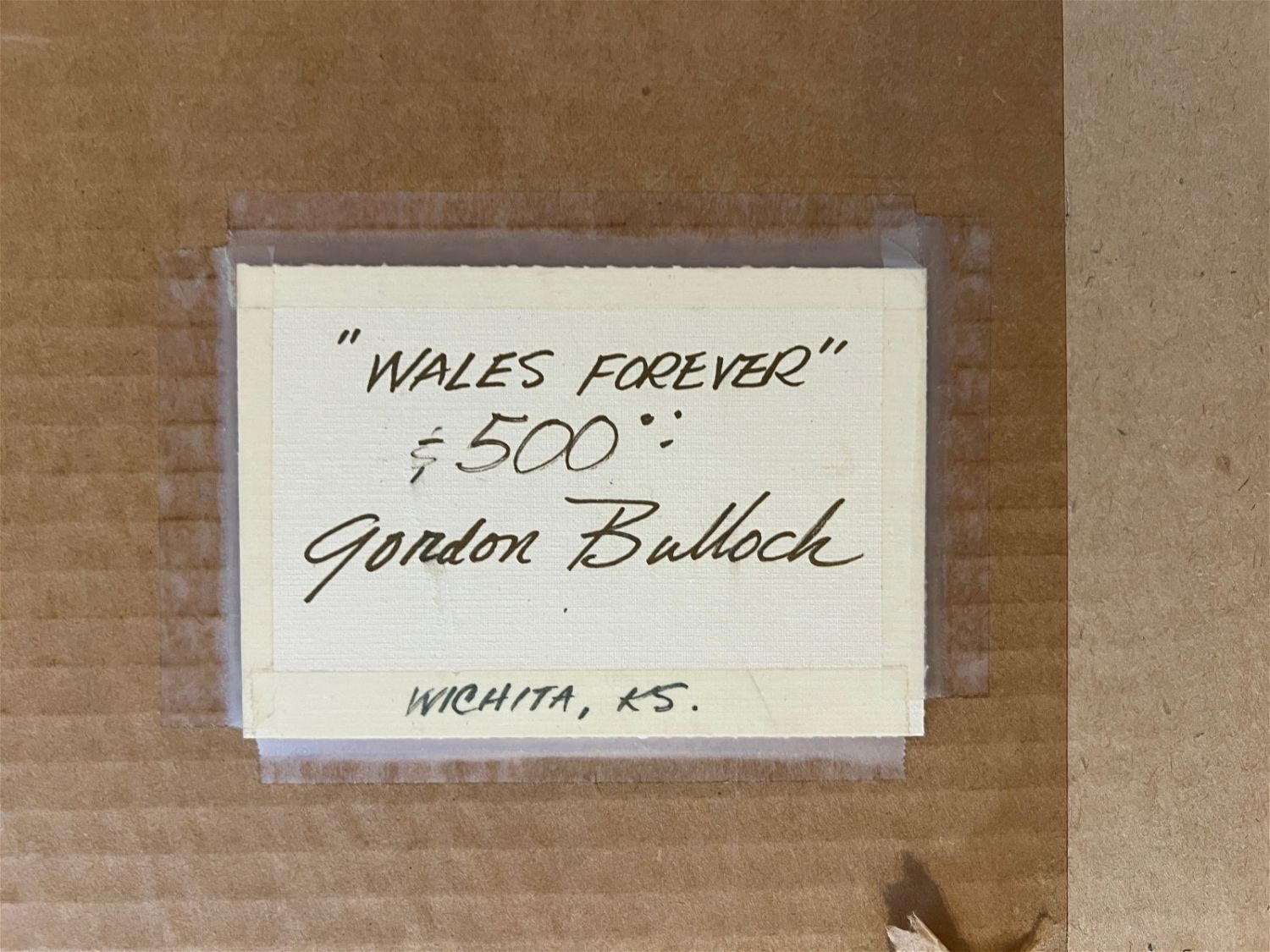 Bulloch, Gordon A (1923-2016) "Wales Forever", 1984 watercolor, signed in lower right, good condition, image size: 14.25 x 24.25 inches. Recruited to Boeing in 1951, he began his 35 year career there where he was an illustrator. While raising their children in Kansas, Gordon and Barbara enjoyed various family trips, always including photo opportunities that could be insprations for paintings.