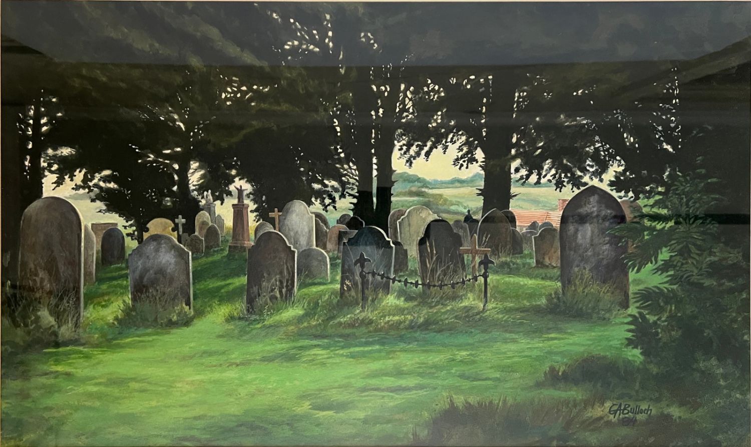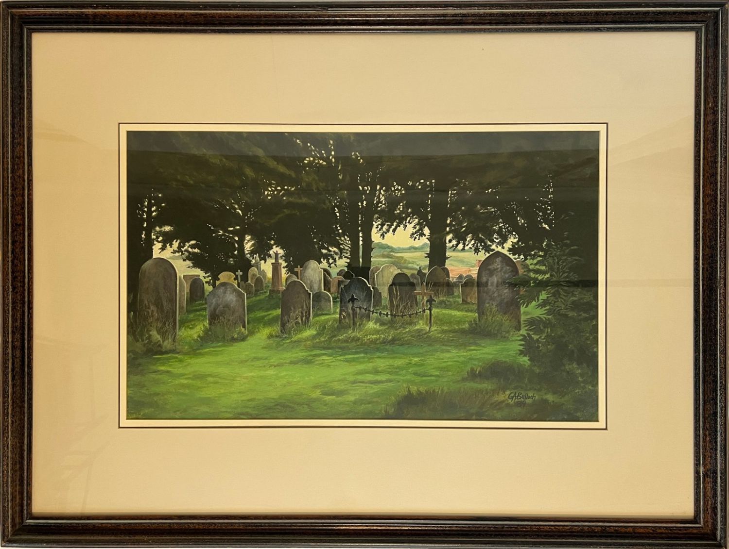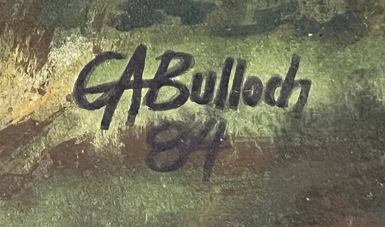 Bulloch, Gordon A (1923-2016) "Wales Forever", 1984 watercolor, signed in lower right, good condition, image size: 14.25 x 24.25 inches. Recruited to Boeing in 1951, he began his 35 year career there where he was an illustrator. While raising their children in Kansas, Gordon and Barbara enjoyed various family trips, always including photo opportunities that could be insprations for paintings.