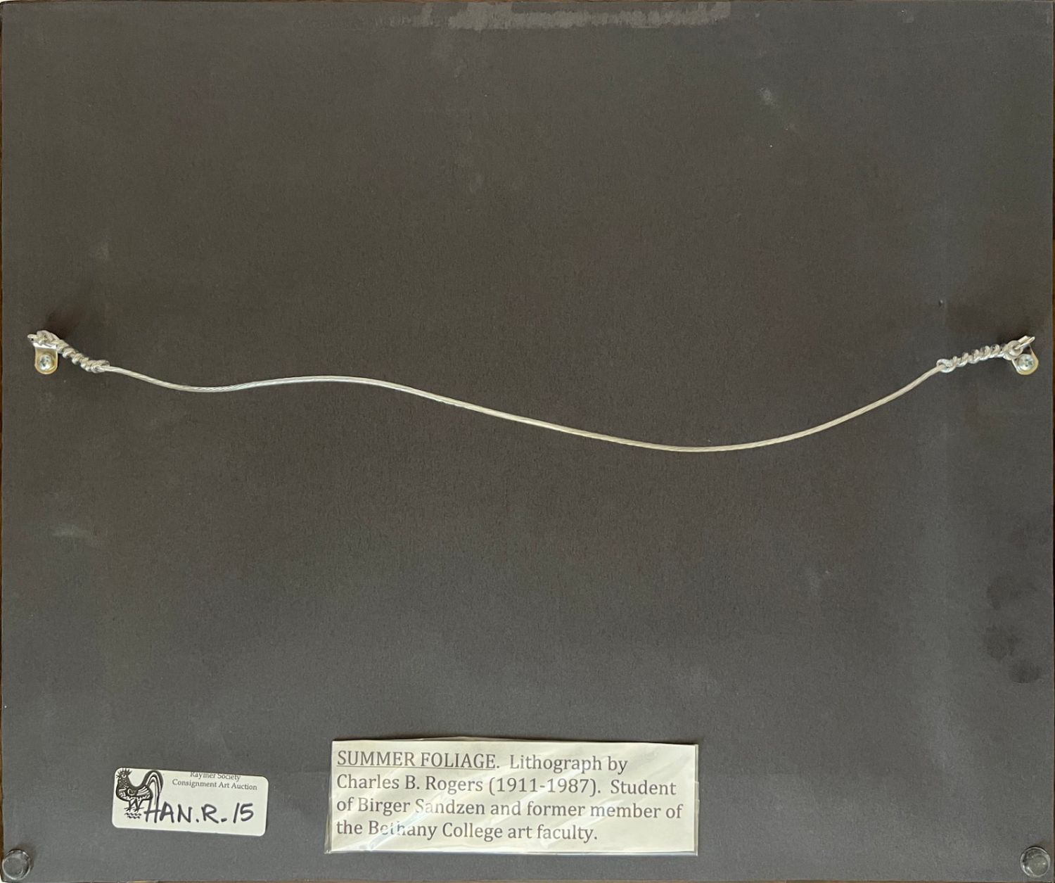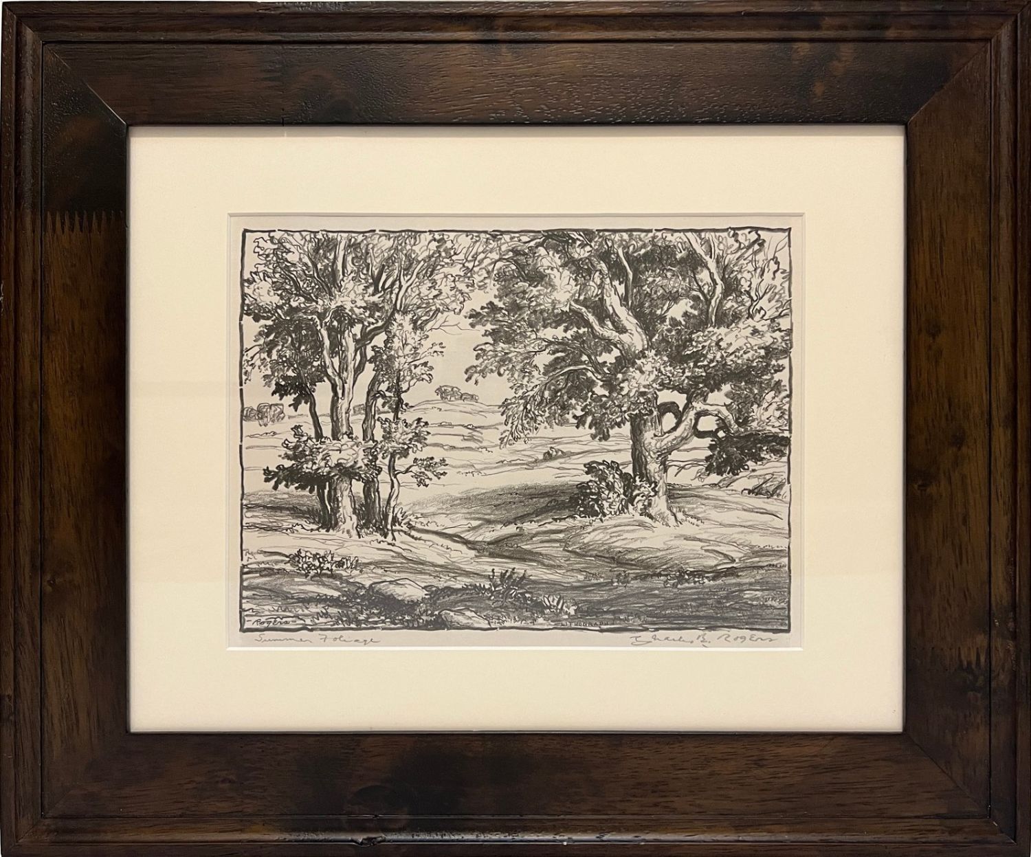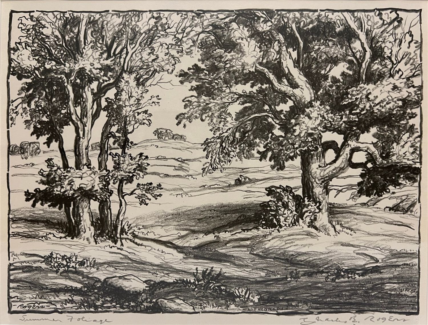 Rogers, Charles (1911-1987) "Summer Foliage" lithograph, pencil signed lower right, good condition, image size:7 x 9.75 inches. A painter, art educator, and member of the Prairie Printmaker Society, Charles B Rogers (1911-1987) was known for his airy landscapes of the American West, often with pastel hues executed in oil. He was born in Great Bend, Kansas, and studied at the National Academy of Design; Bethany College in Lindsborg, Kansas under Birger Sandzen; the California College of Arts and Crafts; and with Dong Kingman and Jay Connaway. From 1947 to 1953, he taught at Lindsborg College, and from 1954 to 1966, he was Manager and Assistant Director of the Huntington Hartford Museum in Los Angeles. After that, he was a Professor of Art at Kansas State University.