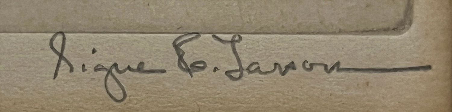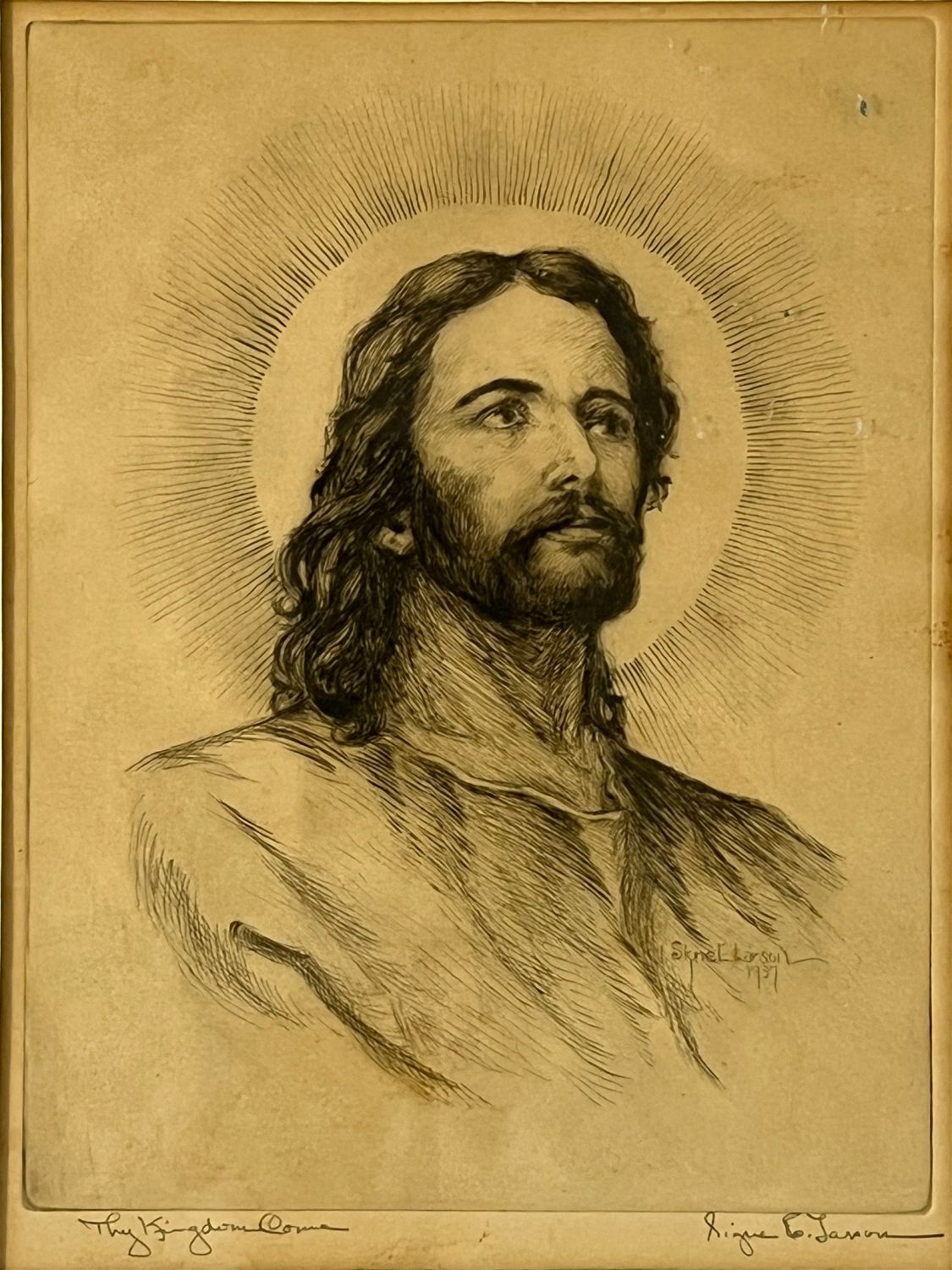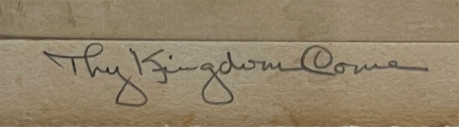 Larson, Signe (1908-1993) "Thy Kingdom Come" 1977 etching, pencil signed lower right, good condition with some toning, image size: 8 x 6 inches. Signe Larson (1908-1993) was born in Buxton, Iowa. She was the youngest of four children and despite lifelong deafness, she was a successful artist. Her family moved to Lindsborg, Kansas in 1927 so that she could attend Bethany College. She studied under Birger Sandzen (1871- 1954) until 1933, when she graduated. She also later studied at the University of Colorado at Boulder, University of Washington and the Chicago Art Institute.With her sister Elvira, she traveled across the United States, Canada and Europe presenting chalk lectures, called Chalk Talks, in churches. Her paintings and prints were awarded prizes in regional and national exhibitions. Her favorite painting medium was watercolor. Several of her watercolors were reproduced in Ford Times Magazine.A mural by Larson hangs in St. Paul Lutheran Church in Clay Center, Kansas. In Lindsborg, her Village Spire Studio and the home of her and her sister were the centers of her life. Watercolors and prints by Signe have found their way into homes across America.In 1984, having moved to a care home in Cordova, Nebraska, she was named "Alumni Artist of the Year" by Bethany College. She was the featured artist for Hyllningsfest in 1993. Her painting of four women at a Swedish smorgasbord served as the program cover for the festival.