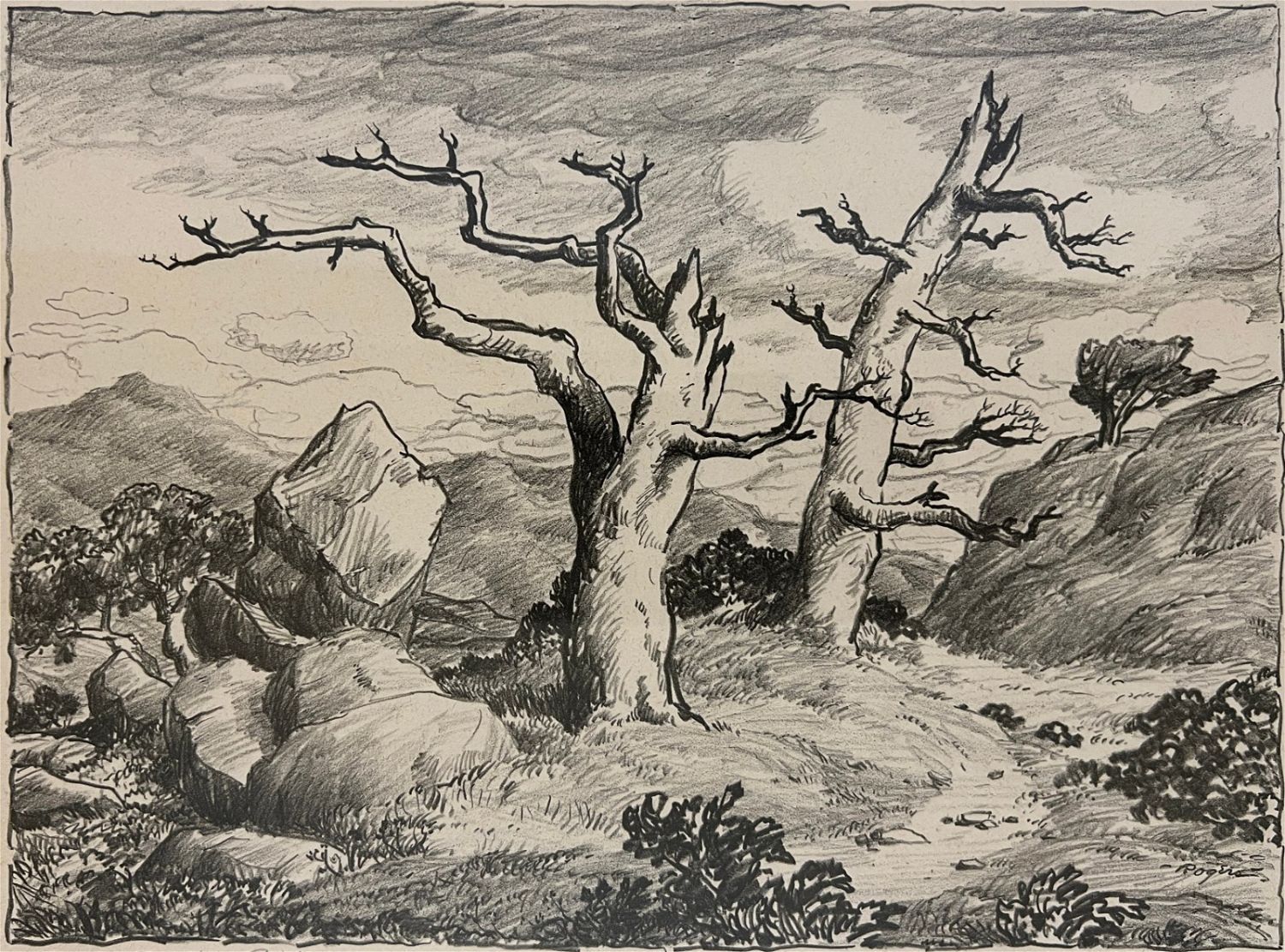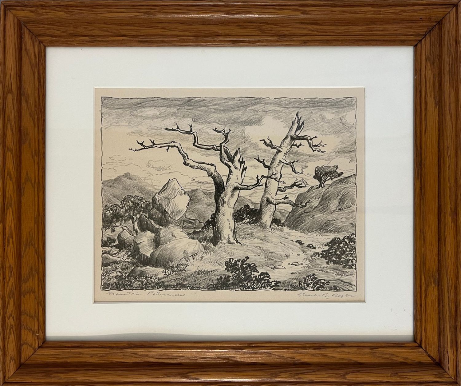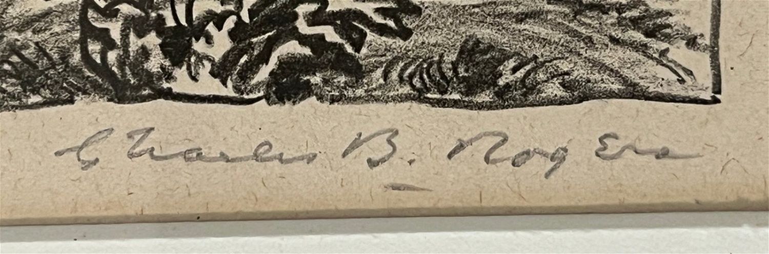Rogers, Charles (1911-1987) "Mountain Patriarchs" lithograph, pencil signed lower right, good condition, image size: 7 x 9.5 inches. A painter, art educator, and member of the Prairie Printmaker Society, Charles B Rogers (1911-1987) was known for his airy landscapes of the American West, often with pastel hues executed in oil. He was born in Great Bend, Kansas, and studied at the National Academy of Design; Bethany College in Lindsborg, Kansas under Birger Sandzen; the California College of Arts and Crafts; and with Dong Kingman and Jay Connaway. From 1947 to 1953, he taught at Lindsborg College, and from 1954 to 1966, he was Manager and Assistant Director of the Huntington Hartford Museum in Los Angeles. After that, he was a Professor of Art at Kansas State University.