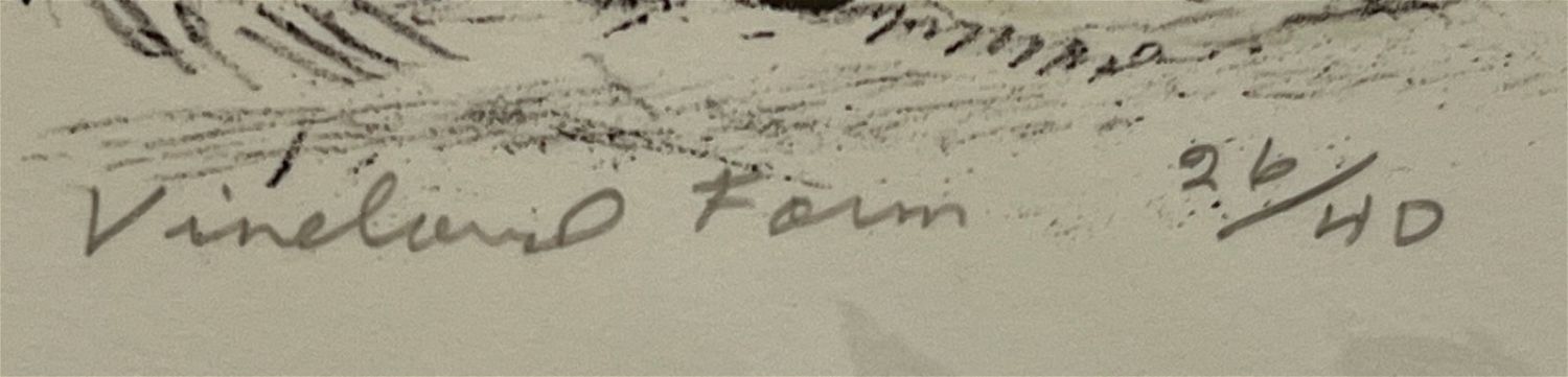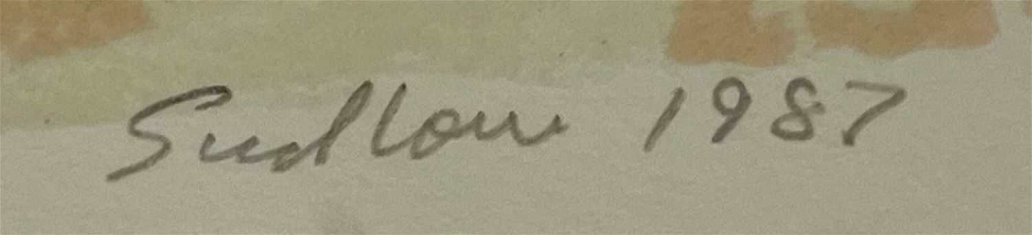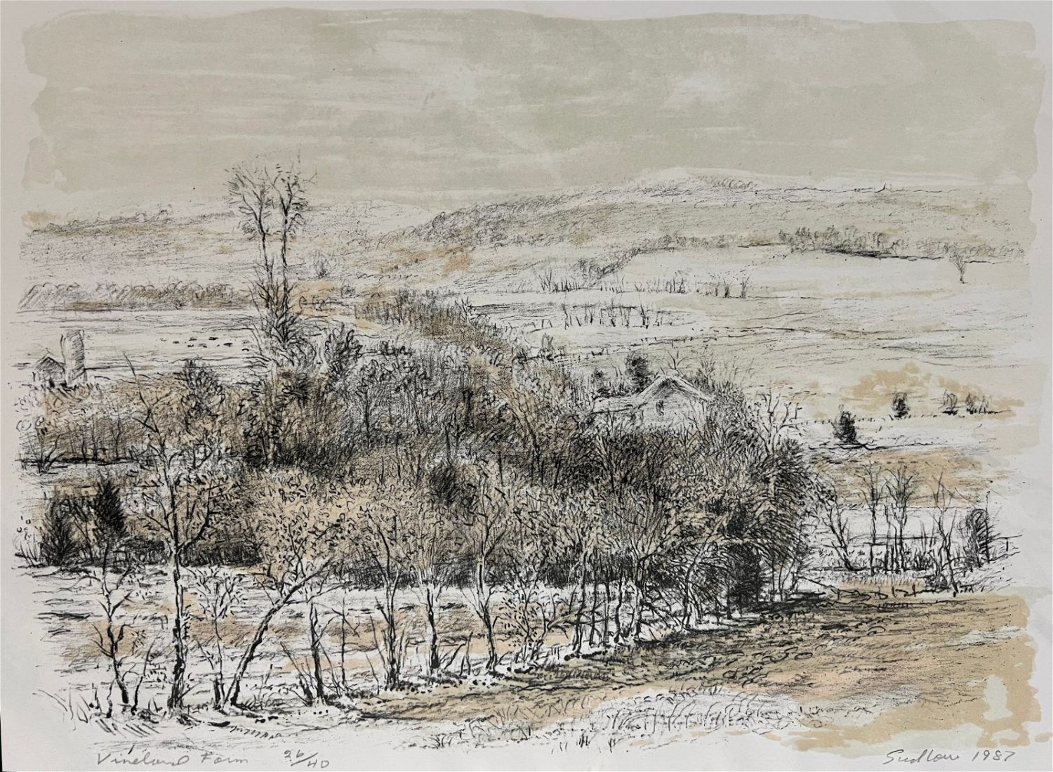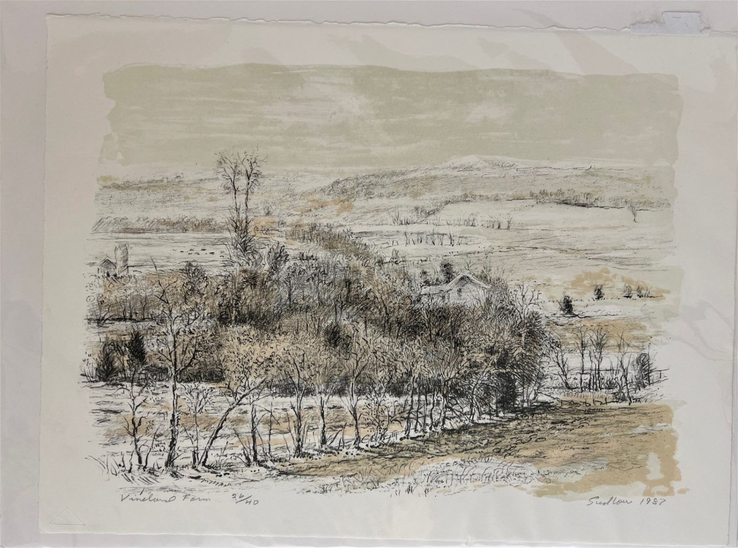 Sudlow, Robert (1920-2010) "Vineland Farm" 26/40, 1987 lithograph with tusche wash, pencil signed in lower right, good condition, unframed, image size: 9.5 x 13 inches. Born in Holton, Kansas on Feb. 25, 1920, Robert Sudlow was a teacher and painter who specialized in Kansas landscapes. He earned a BFA from the University of Kansas, Lawrence in 1942, studying with Albert Bloch, Raymond Eastwood, and Karl Mattern.From 1942 to 1945, he served as a Navy pilot. He joined the faculty at the University of Kansas, Lawrence in 1946, and began spending his summers in the Santa Cruz Mountains in California. He enrolled in the summer Fine Arts program at the University of California, Berkeley in 1951 and then took a sabbatical in 1951-53 to study in France and receive instruction at the Academie de la Grande Chaumiere and the Academie Andre L’Hote in Paris.In 1956, he earned an MFA from the California College of Arts & Crafts studying with Richard Diebenkorn. In 1974 he was named First Kansas Governor’s Artist.Robert Sudlow retired from the University of Kansas in 1987.