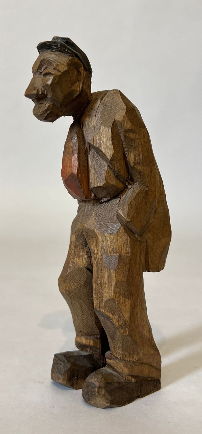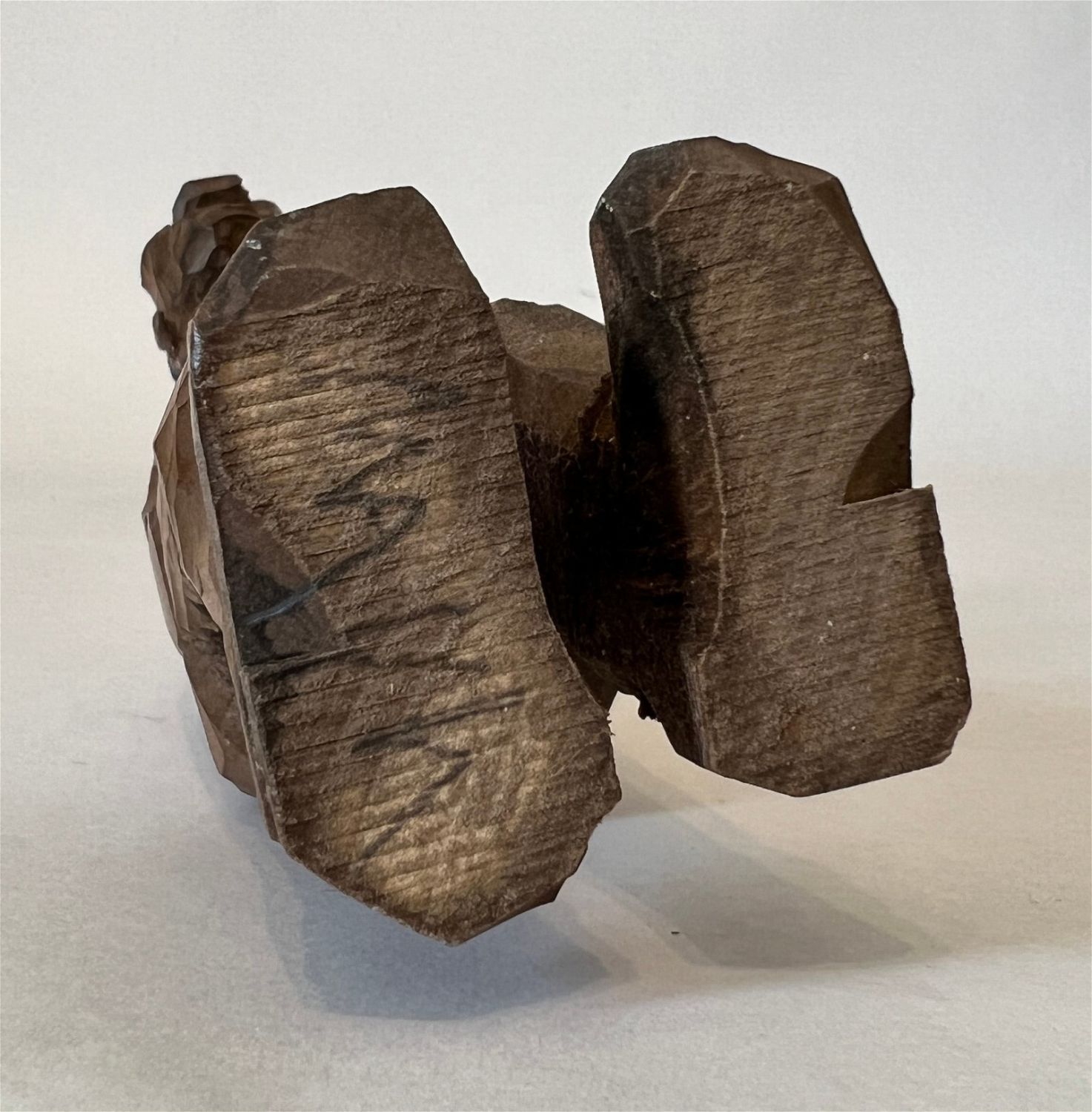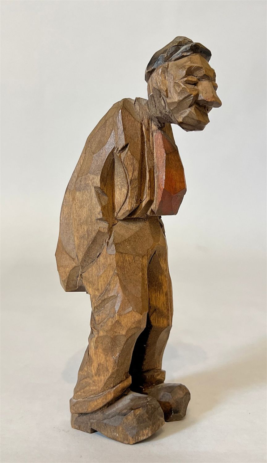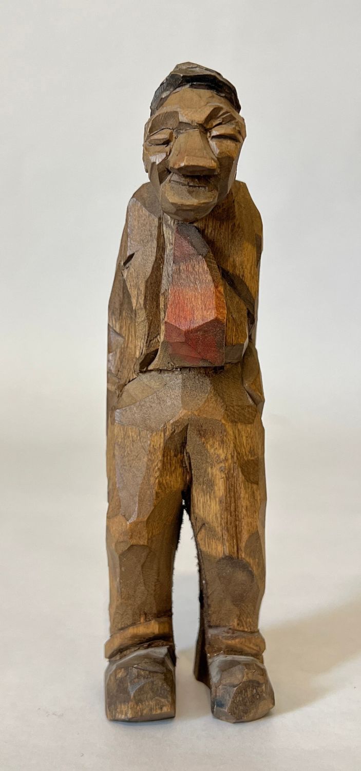 Malm, Norm (1928-2011), Old man with necktie, woodcarving, signed on bottom, good condition, size: 6.75 x 2 x 2.75 inches. Norman Gene Herman Malm was born 28 October 1928 to Reinhold and Marie Johnson Malm. Both of his great-grandfathers emigrated from Sweden in the late 1800’s. Norman was entirely self-taught. There was much talent in his family, as his great uncle G.N. Malm and daughter Alba were well known painters- but Norman did not study art or carving, it just came naturally. Norman began painting in the early 50’s. Upon his marriage to Rosemary Pearson in 1952, his father in law, Anton Pearson encouraged him to delve deeper into woodcarving. He gave Norman some pointers and the talented Norman took off on his own. His carving style was uniquely his own. It has been said that Norman didn’t begin carving or drawing until his relationship with Anton. That is untrue. Norman also was a prolific cartoonist with a wicked sense of humor and loved to take jabs at social and environmental injustices amongst other things. Always in touch with his Swedish heritage, he could be found painting Swedish kurbits as well as painting and carving those mythical little helpers, the Tomtes. Norman’s son Jim carries on his dad’s tradition of carving the crafty little Swedish guys, The Malm Tomtes. Norman passed away in 2011, leaving a legacy of woodcarvings, paintings and such a collection of cartoons that his friends and family will be smiling for years to come. He is greatly missed.