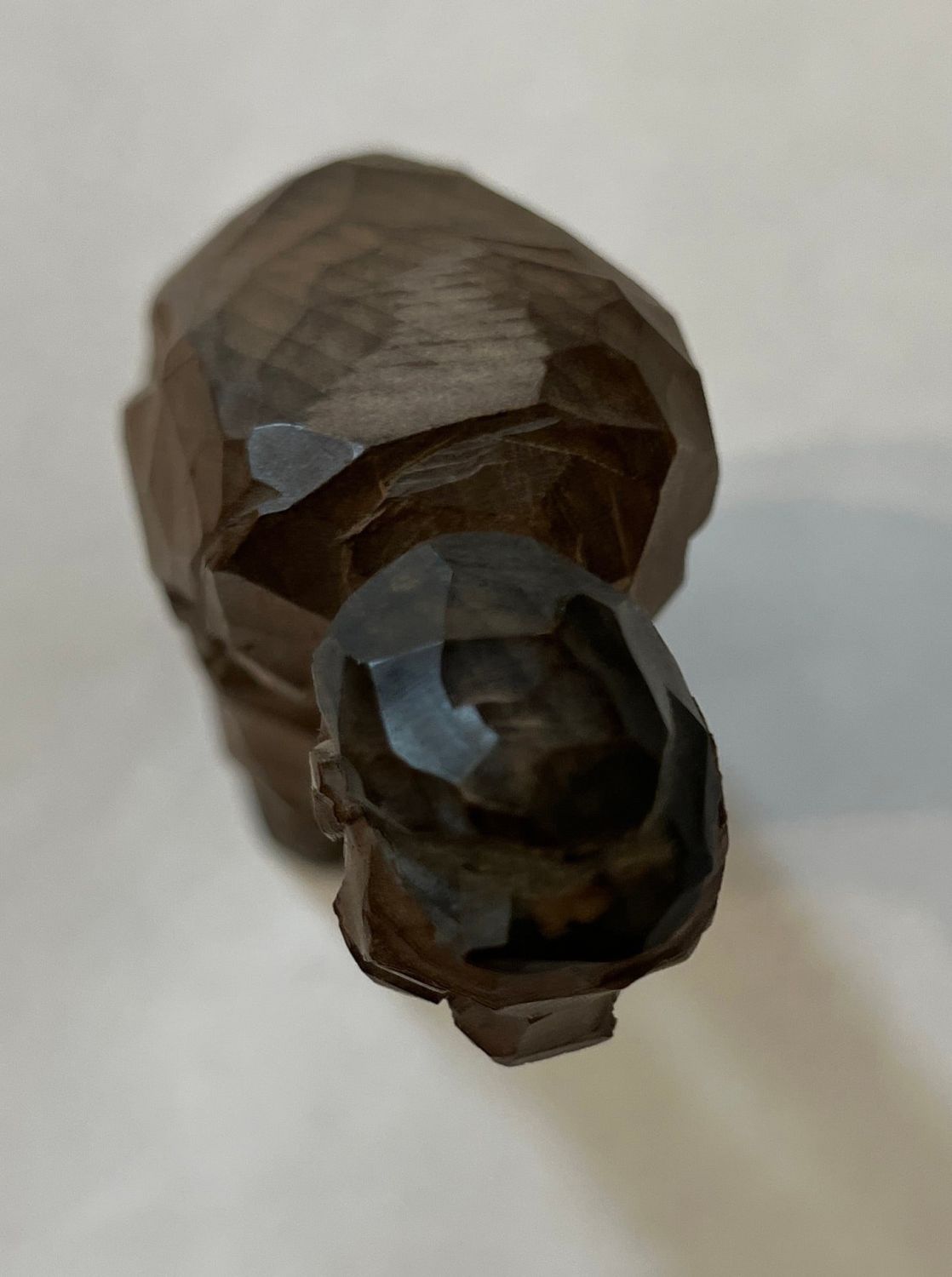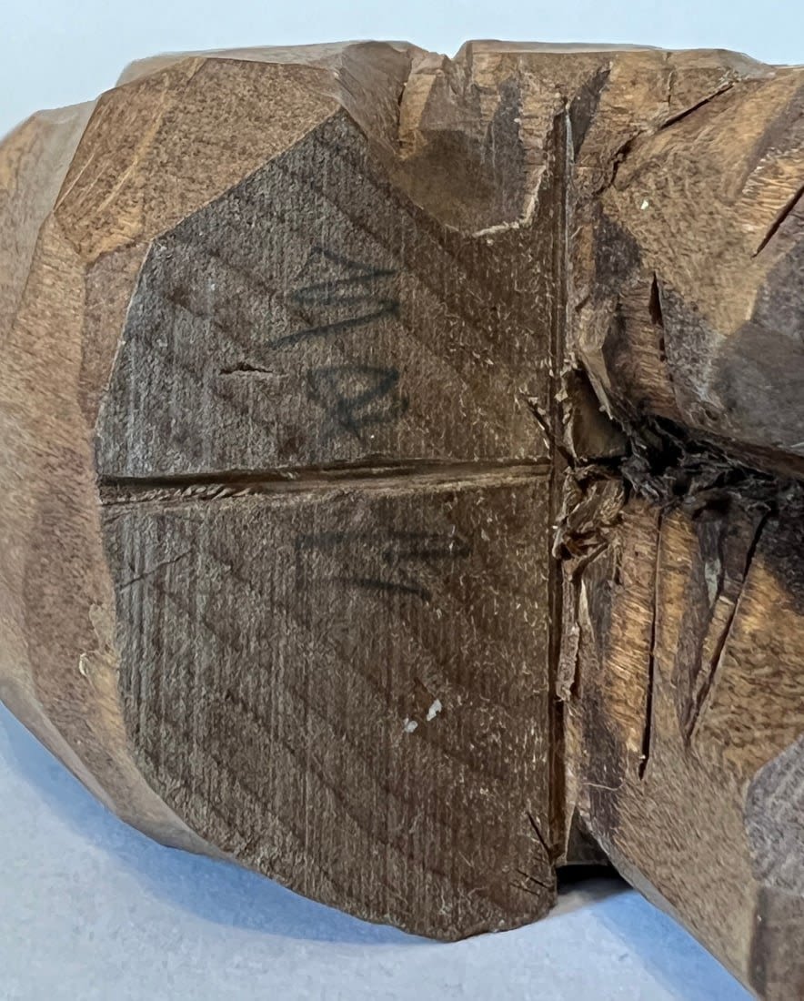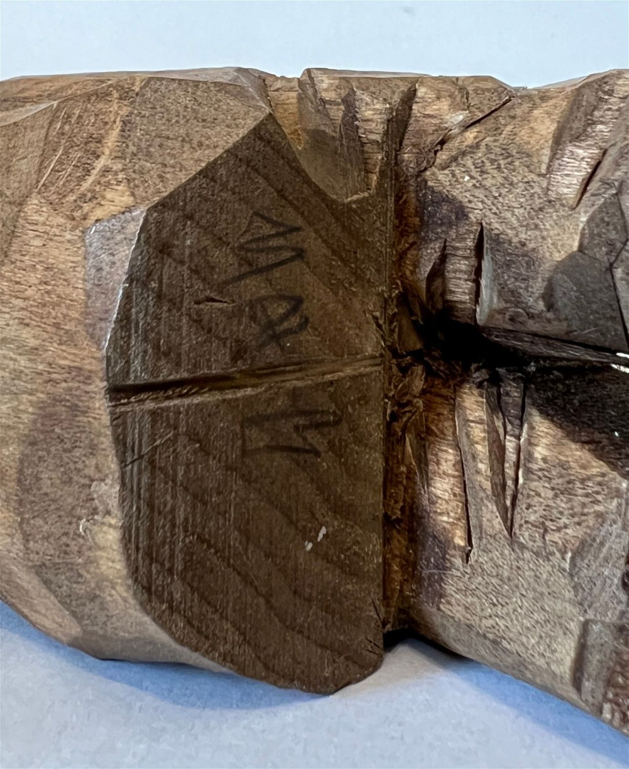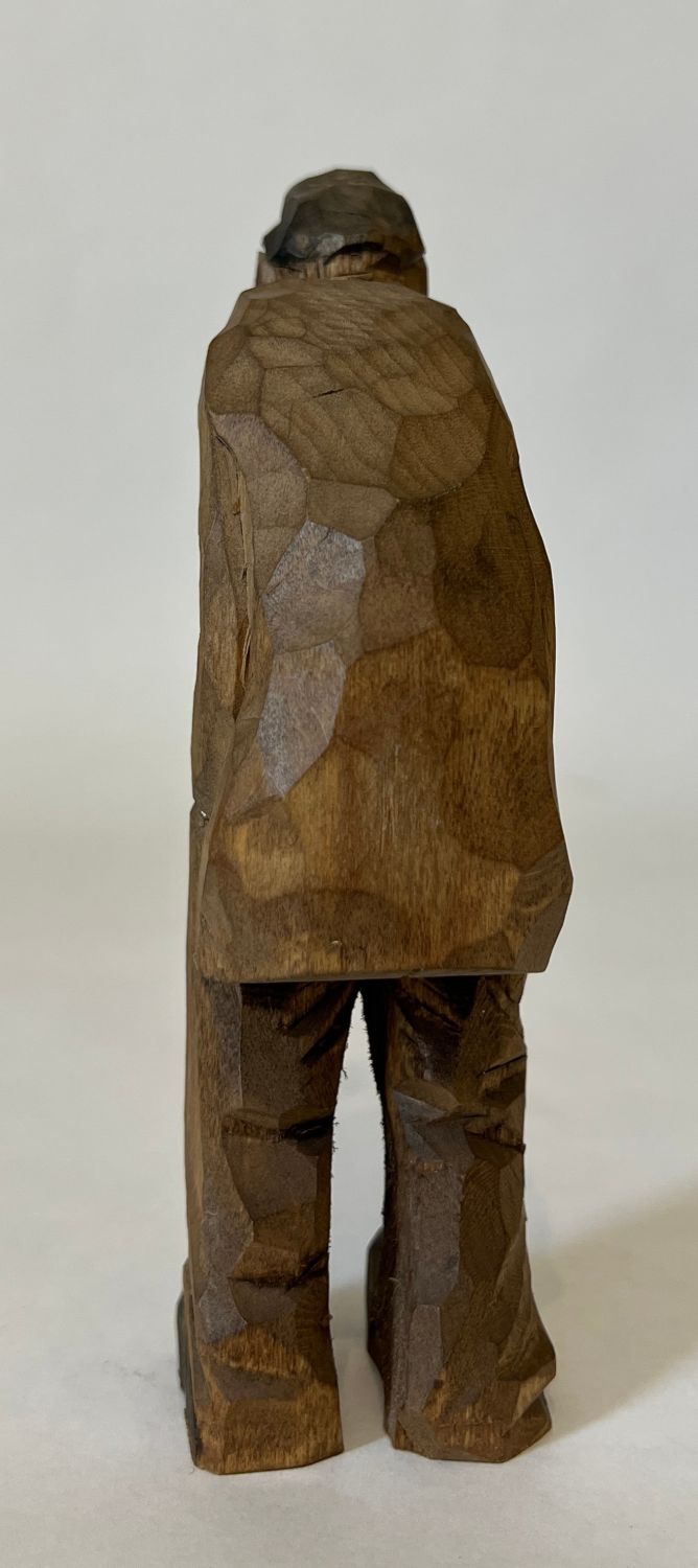 Malm, Norm (1928-2011), Old man with necktie, woodcarving, signed on bottom, good condition, size: 6.75 x 2 x 2.75 inches. Norman Gene Herman Malm was born 28 October 1928 to Reinhold and Marie Johnson Malm. Both of his great-grandfathers emigrated from Sweden in the late 1800’s. Norman was entirely self-taught. There was much talent in his family, as his great uncle G.N. Malm and daughter Alba were well known painters- but Norman did not study art or carving, it just came naturally. Norman began painting in the early 50’s. Upon his marriage to Rosemary Pearson in 1952, his father in law, Anton Pearson encouraged him to delve deeper into woodcarving. He gave Norman some pointers and the talented Norman took off on his own. His carving style was uniquely his own. It has been said that Norman didn’t begin carving or drawing until his relationship with Anton. That is untrue. Norman also was a prolific cartoonist with a wicked sense of humor and loved to take jabs at social and environmental injustices amongst other things. Always in touch with his Swedish heritage, he could be found painting Swedish kurbits as well as painting and carving those mythical little helpers, the Tomtes. Norman’s son Jim carries on his dad’s tradition of carving the crafty little Swedish guys, The Malm Tomtes. Norman passed away in 2011, leaving a legacy of woodcarvings, paintings and such a collection of cartoons that his friends and family will be smiling for years to come. He is greatly missed.