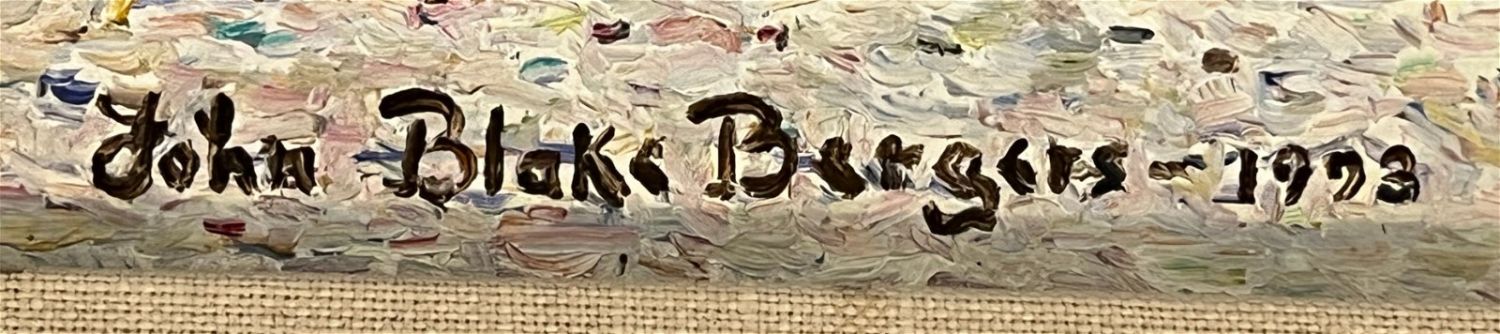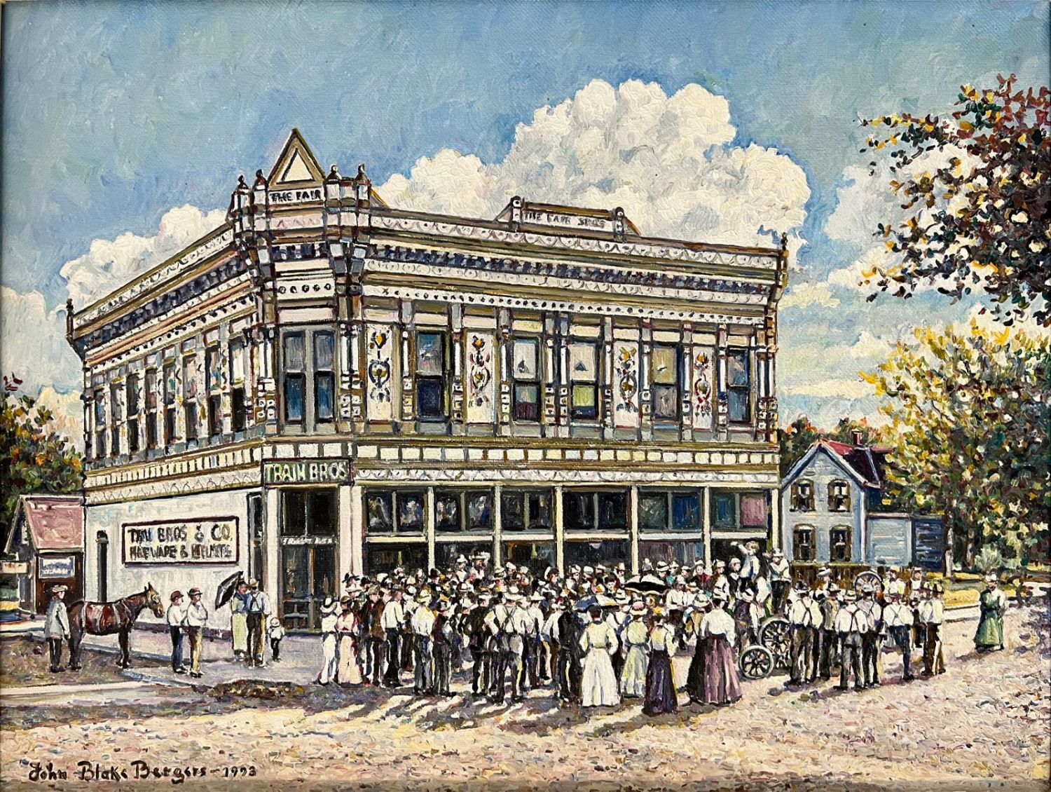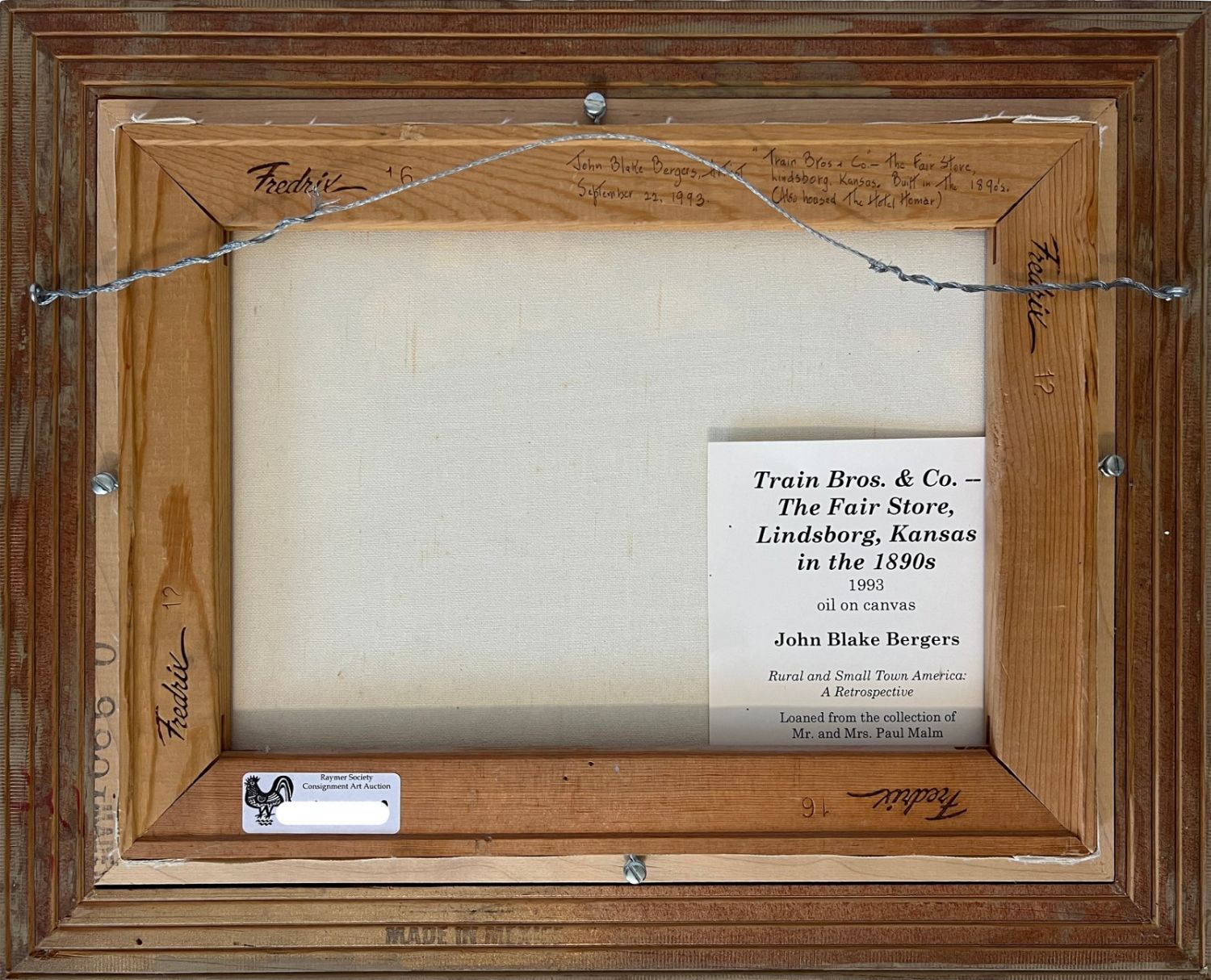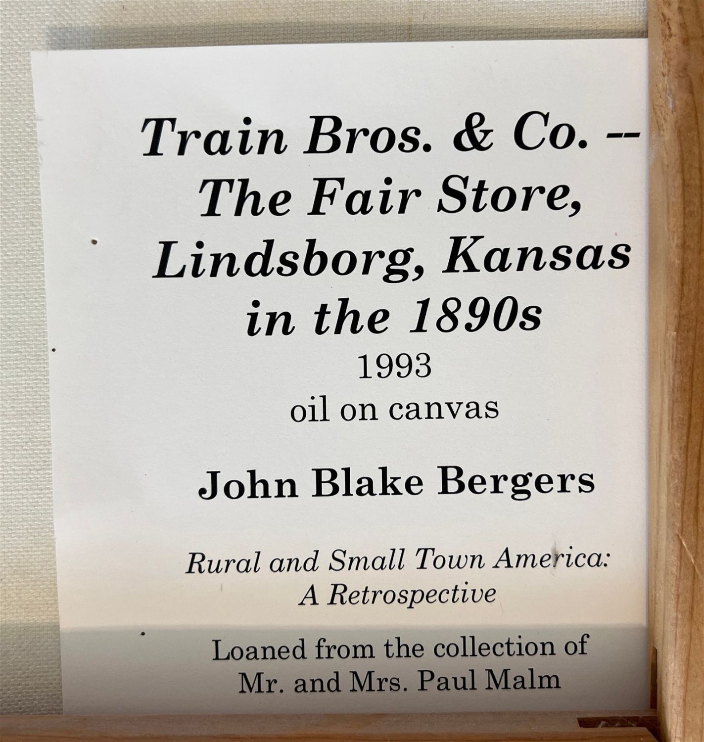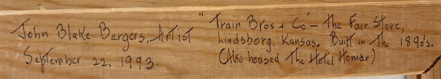 Bergers, John Blake (1931-2011) "Train Bros. & Co-The Fair Store, Lindsborg, KS in the 1890s, 1993 oil on canvas, signed in lower left, good condition, canvas size: 12 x 16 inches. John William Blake Bergers, Lindsborg, was born to the late John William Bergers (Senior) and Helen Blake Bergers, July 14, 1931, in Omaha, NE.John was a professional artist who dedicated his life to painting historical and landscape scenes of the Midwest, especially those described so beautifully in the works of renowned author, Willa Cather.His collection of Cather works can be viewed at the Willa Cather Foundation in Red Cloud, Nebraska. John’s deep interest in history led him also to restoration work. He was instrumental in restoring the McPherson Opera House in McPherson, KS, and contributed significantly to the restoration of the Red Cloud Opera House in Red Cloud, NE as well.