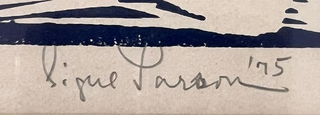 Larson, Signe (1908-1993) "Smoky Hill River in Winter" 1975 block print, pencil signed in lower right, good condition, image size: 11 x 8 inches. Signe Larson (1908-1993) was born in Buxton, Iowa. She was the youngest of four children and despite lifelong deafness, she was a successful artist. Her family moved to Lindsborg, Kansas in 1927 so that she could attend Bethany College. She studied under Birger Sandzen (1871- 1954) until 1933, when she graduated. She also later studied at the University of Colorado at Boulder, University of Washington and the Chicago Art Institute.With her sister Elvira, she traveled across the United States, Canada and Europe presenting chalk lectures, called Chalk Talks, in churches. Her paintings and prints were awarded prizes in regional and national exhibitions. Her favorite painting medium was watercolor. Several of her watercolors were reproduced in Ford Times Magazine.A mural by Larson hangs in St. Paul Lutheran Church in Clay Center, Kansas. In Lindsborg, her Village Spire Studio and the home of her and her sister were the centers of her life. Watercolors and prints by Signe have found their way into homes across America.In 1984, having moved to a care home in Cordova, Nebraska, she was named "Alumni Artist of the Year" by Bethany College. She was the featured artist for Hyllningsfest in 1993. Her painting of four women at a Swedish smorgasbord served as the program cover for the festival.